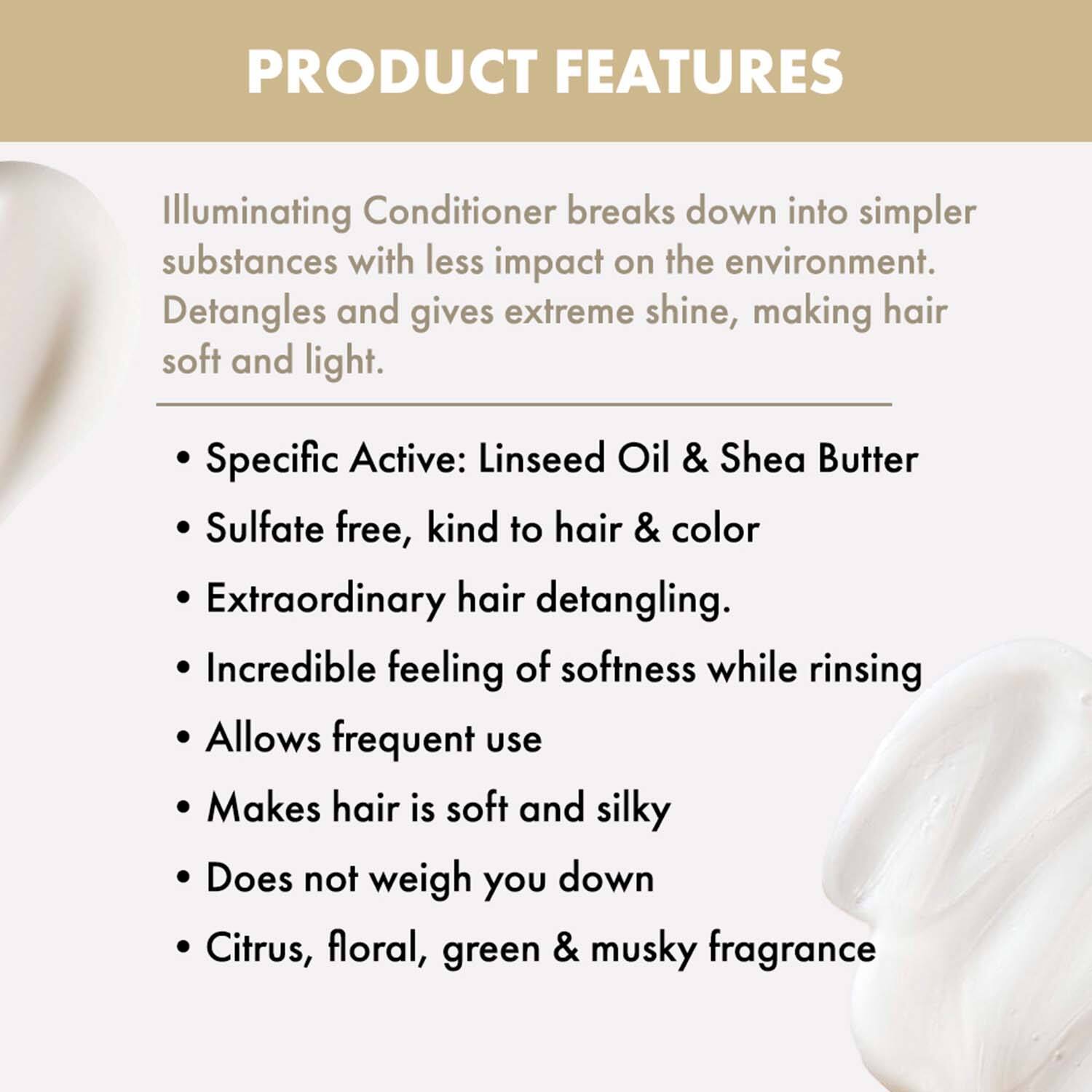 Key Features & Benefits:Enriched with shea butter for intense moisturization and for reducing frizzIlluminating and detangling conditioner that is safe for regular or colored hairContains flaxseed oil that protects the hair and prolongs its shineVegan formulation that has no toxic chemicals and is safe for hair