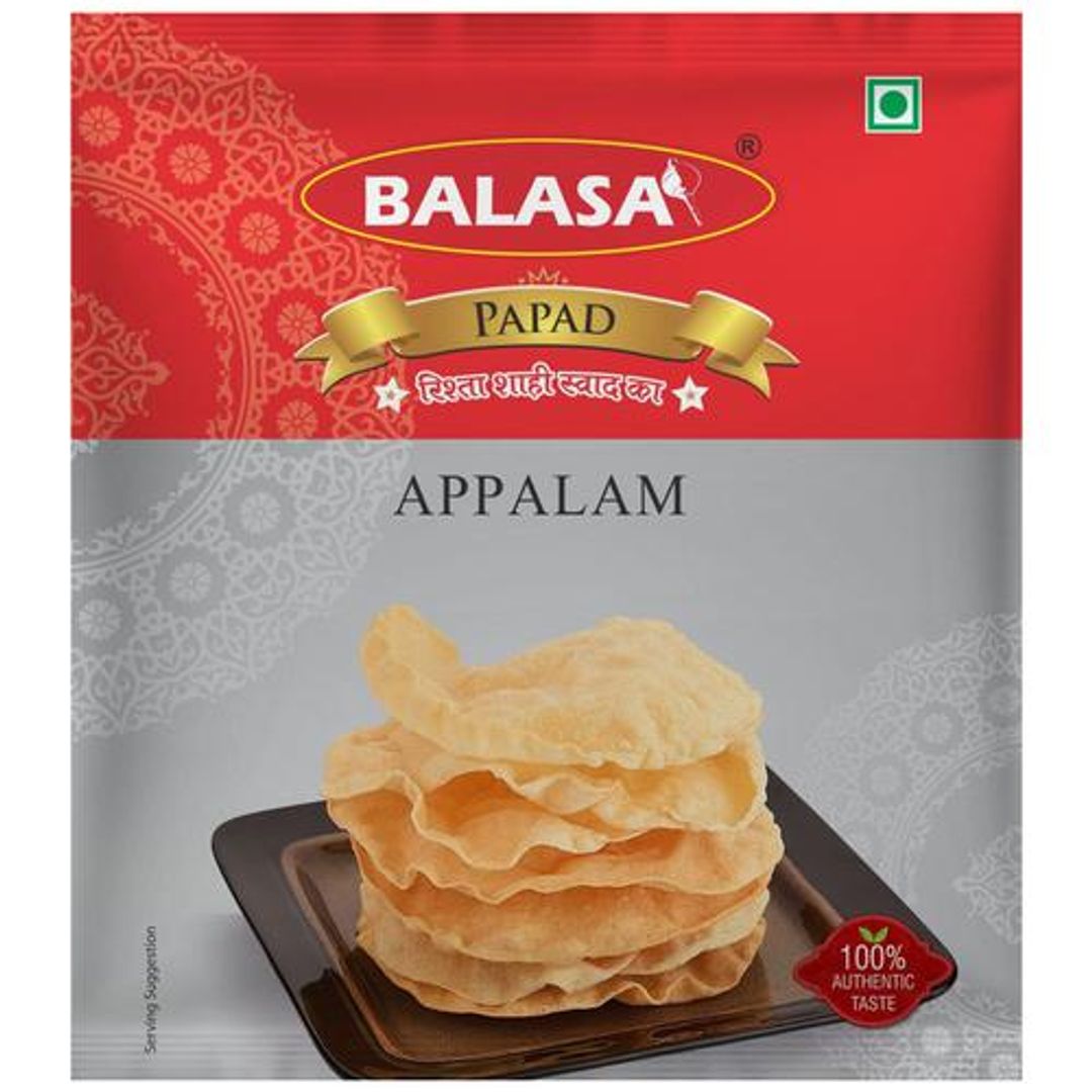 Balasa Appalam papad is a snack composed of rice flour and urad dal flour. It puffs when deep-fried and tastes delicious. It is crisp and delicious. This papad has the goodness of rice flavoured with a blend of spices and salt. It is usually served with a meal or can be taken as a snack. Papad is a good appetizer and digestive. It tastes delicious because of its crispiness.