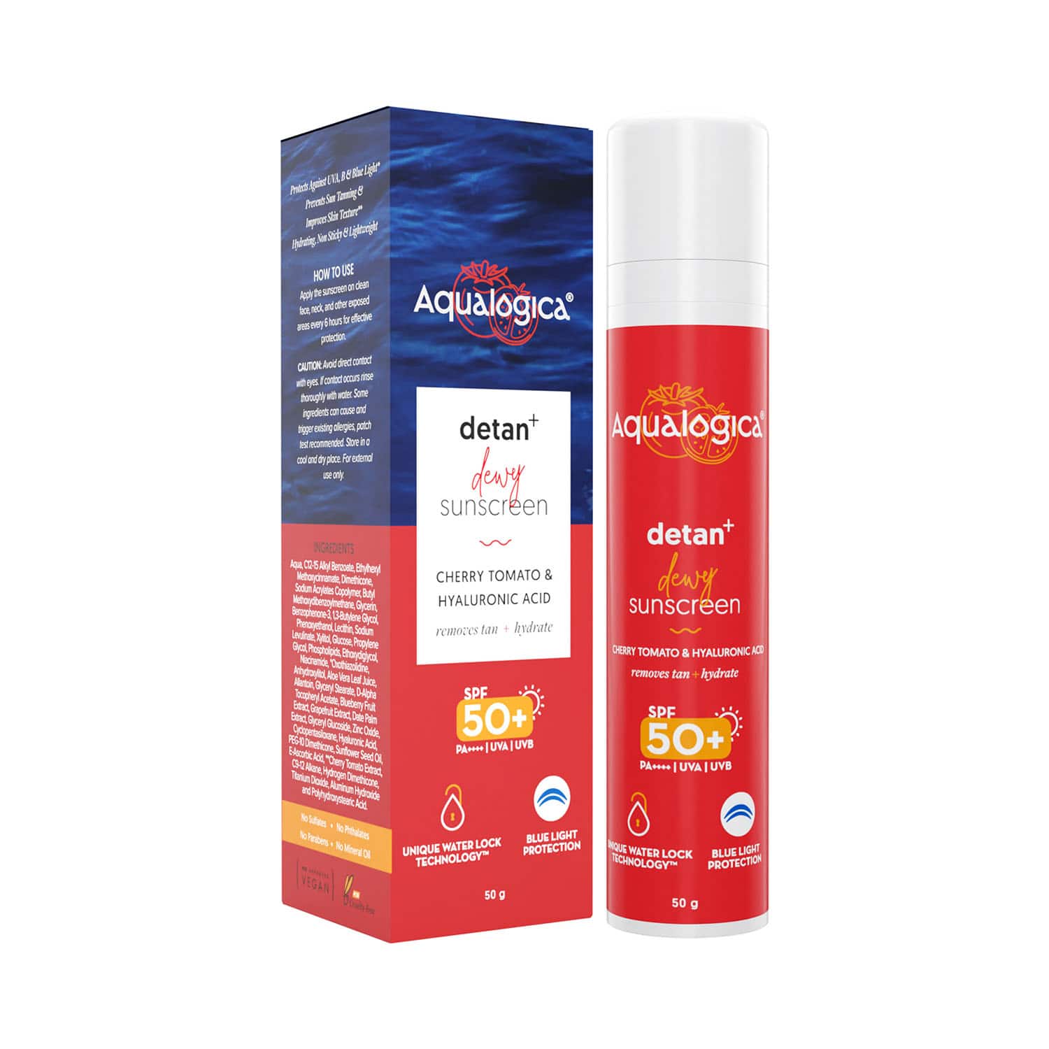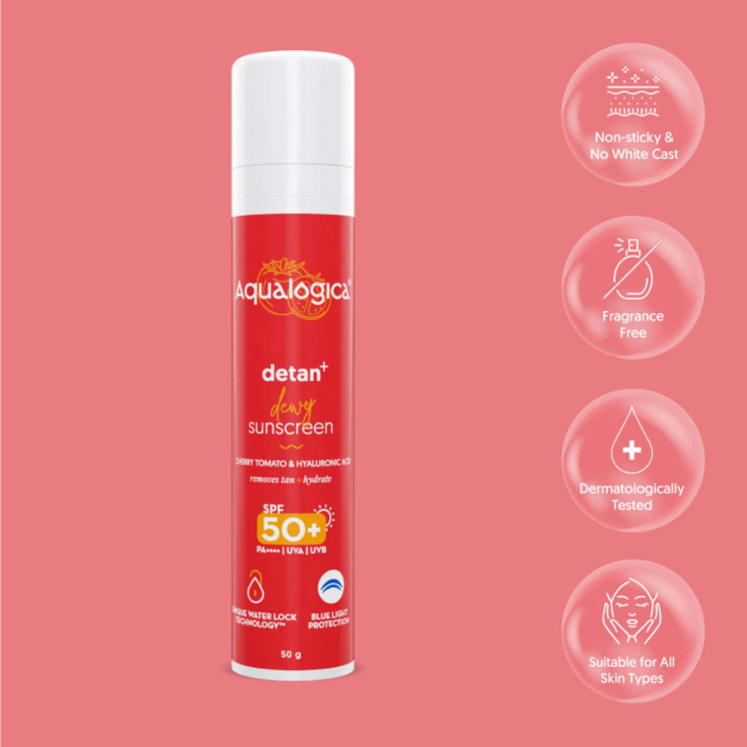 Aqualogica Detan + Dewy Sunscreen With Cherry Tomato & Hyaluronic Acid SPF 50+ PA++ (50g)