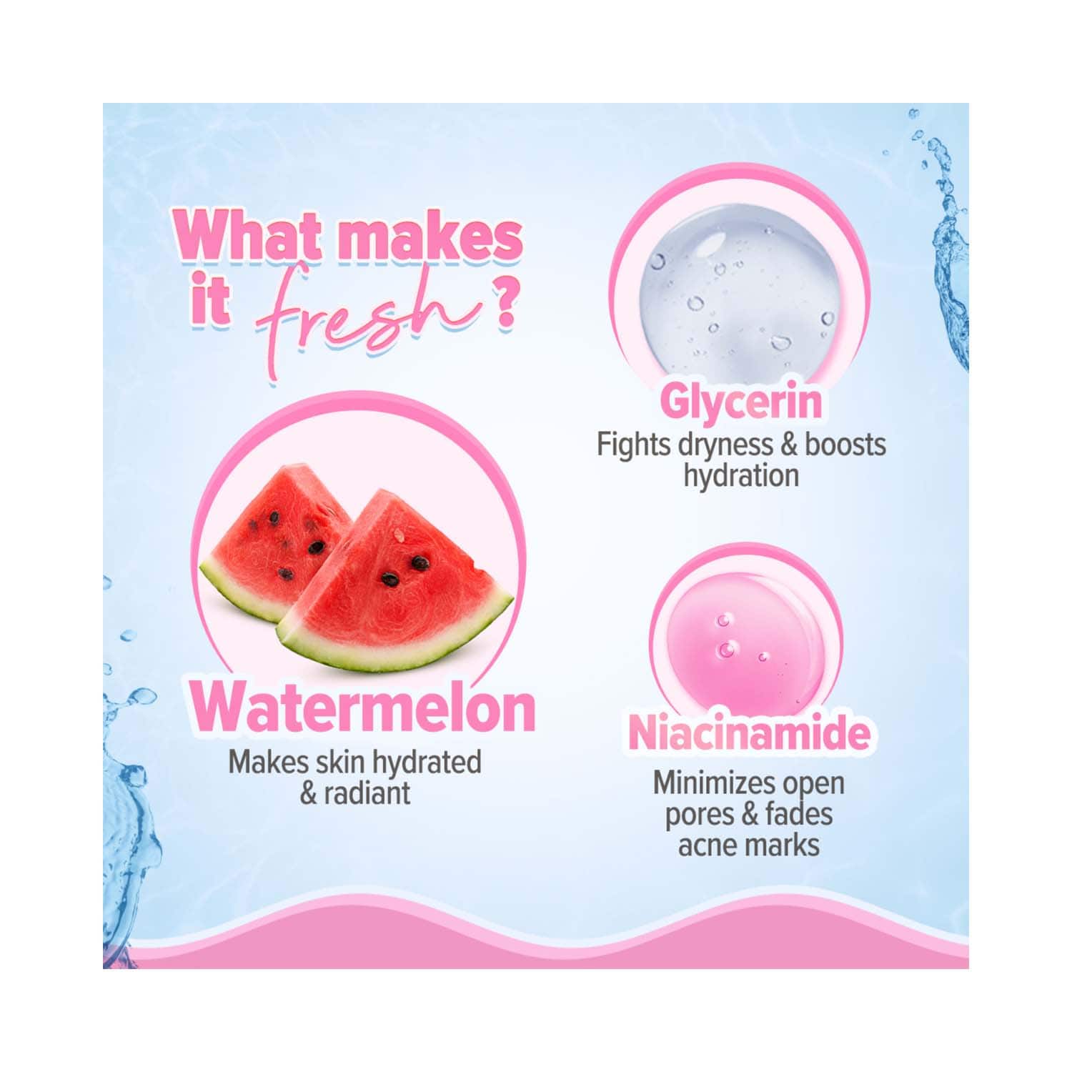 Key Ingredients:Hyaluronic acid: Retains moisture for longerNiacinamide: Fades blemishes and spotsWatermelon extracts: Brighten the skin