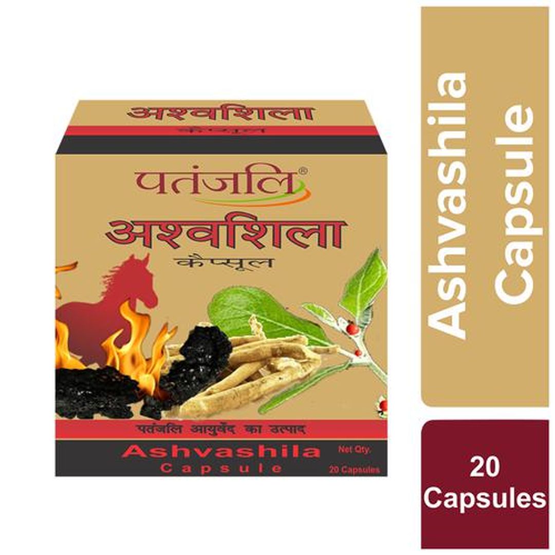 Patanjali Ashvashila capsule is a combination of Ashwagandha and Shilajit which makes it a powerful remedy in Sexual weakness, fatigue, stress, generalised weakness, asthma, allergy, diabetes, diabetic neuropathy, urinary disorders and loss of immunity.