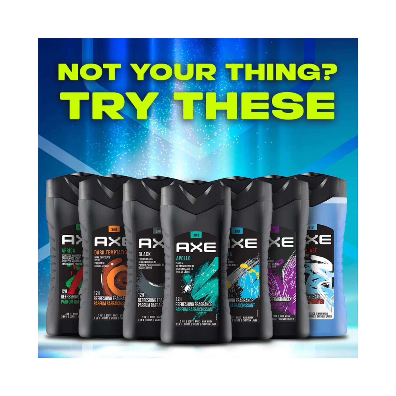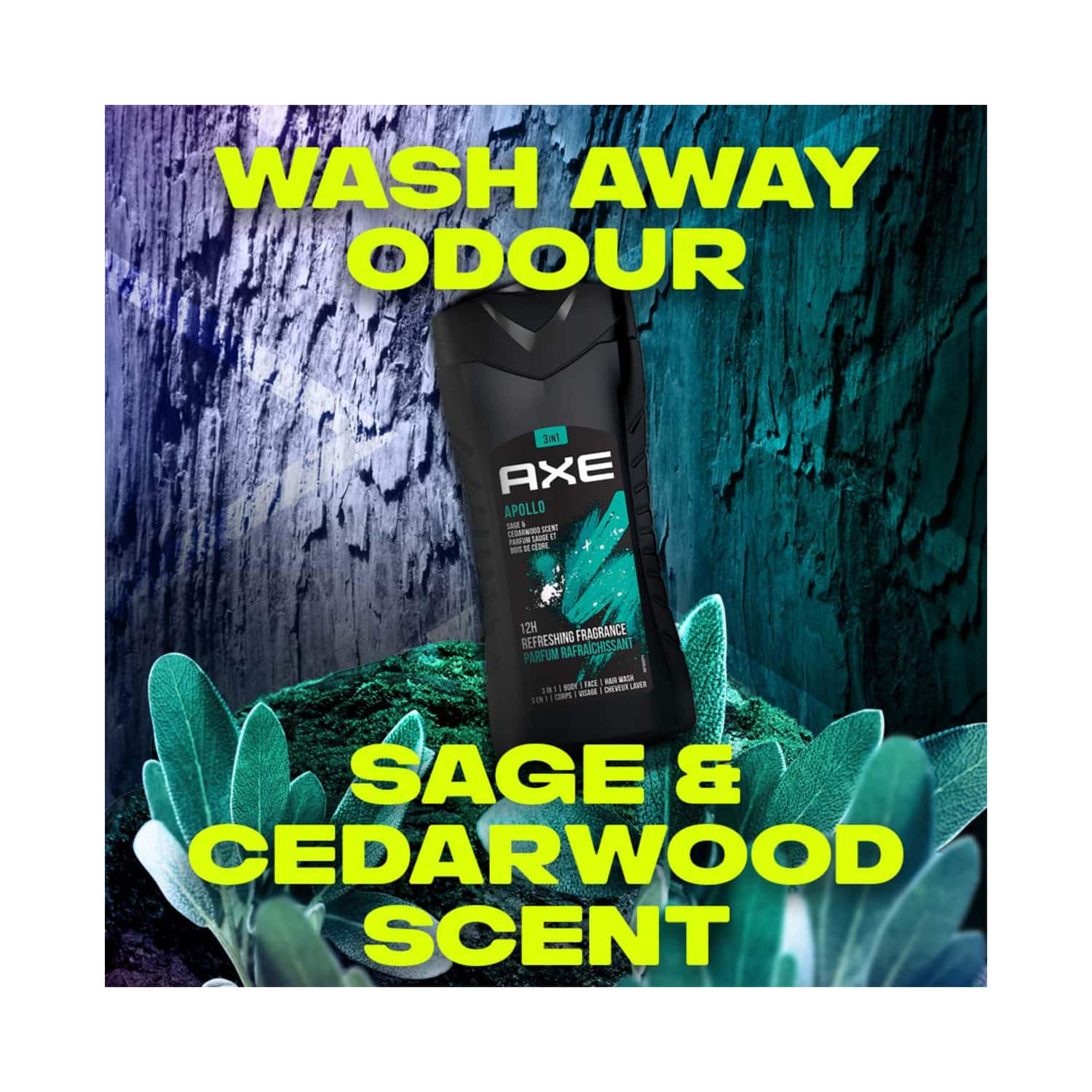Take a refreshing shower with the Axe 3-In-1 Apollo Body Face & Hair Wash (250ml). This moisturizing body, face, and hair wash helps repair the skin and hair's health while improving overall appearance. Also, this Axe men's shower gel has 100% plant-based prebiotics and 87% natural ingredients to effectively remove dirt, impurities, odor, and bacteria to keep you fresh. Plus, its long-lasting fragrance keeps you smelling good for up to 12 hours. Key Features & Benefits:Helps the skin retain its natural moisture level to soften the skinImproves the overall appearance and health of the hair and skinHas a long-lasting sage and cedarwood scent to make you smell fresh for up to 12 hoursFree from parabens and dermatologically tested formula for safe use All Ingredients:Water (Aqua), Sodium Laureth Sulfate, Glycerin, Cocamidopropyl Betaine, Sodium Chloride, Fragrance (Perfume), Sodium Benzoate, Citric Acid, Ppg-9, Lactic Acid, Disodium Edta, Saccharide Isomerate, Sodium Sulfate, Sodium Citrate, Citronellol, Coumarin, Ci 19140, Ci 42090. How to Use:To start, pour the body wash on a wet loofah or your palms. After that, squeeze the loofah to create a lather and massage it on your damp skin. Then, apply it to your hair and work into a lather. Rinse off the body wash with water and towel dry to get soft and fragrant skin. About the Brand:Established in France in 1983, Axe is a men's grooming brand under Unilever that creates high-quality yet affordable products like body sprays, deodorants, body washes, shampoos, hair styling products, and more. The brand is now used by men in over 90 countries, from America to Asia. Their mission is to help every man break away from stereotypes and embrace their unique style. Axe aims to empower men and help them express and enhance their individuality by giving them the tools to stay well-groomed and feel confident.Check out more AXE Shower Gels & Body Wash options here, or browse through tokocart's full range of Shower Gels & Body Wash from top global brands.You can also explore other products from the world of AXE here on tokocart.