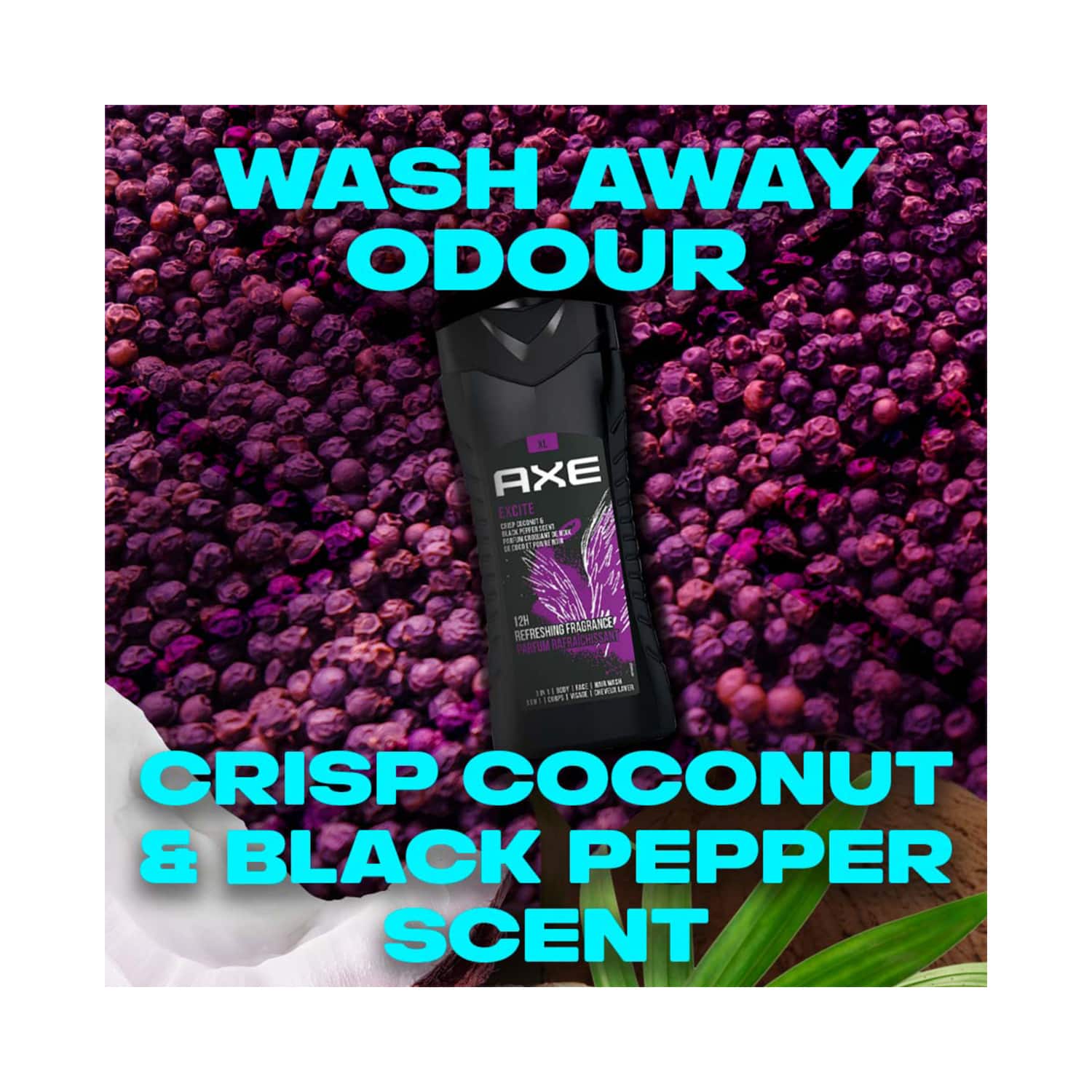 Transform your showering experience with the Axe 3-In-1 Excite Body Face & Hair Wash (400ml). It is an all-in-one moisturizing body, face, and hair wash that helps maintain skin and hair health. Plus, this Axe men's shower gel helps the skin retain its natural moisture level while removing dirt, odor, and bacteria to keep you fresh throughout the day. Key Features & Benefits:Formulated with 100% plant-based prebiotics and 87% natural ingredients for safe useProvides a gentle yet deep cleanse to remove dirt, impurities, odor, and bacteriaAids in retaining the skin's natural moisture for a softer, smoother textureFeatures a long-lasting crisp coconut and black pepper scent to make you smell fresh for up to 12 hours All Ingredients:Water (Aqua), Sodium Laureth Sulfate, Glycerin, Cocamidopropyl Betaine, Sodium Chloride, Fragrance (Perfume), Sodium Benzoate, Citric Acid, Ppg-9, Lactic Acid, Disodium Edta, Saccharide Isomerate, Sodium Sulfate, Sodium Citrate, Coumarin, Limonene, Linalool, Ci 17200, Ci 42090. How to Use:To start, pour the body wash on a wet loofah or your palms. After that, squeeze the loofah to create a lather and massage it on your damp skin. Then, apply it to your hair and work into a lather. Rinse off the body wash with water and towel dry to get soft and fragrant skin. About the Brand:Established in France in 1983, Axe is a men's grooming brand under Unilever that creates high-quality yet affordable products like body sprays, deodorants, body washes, shampoos, hair styling products, and more. The brand is now used by men in over 90 countries, from America to Asia. Their mission is to help every man break away from stereotypes and embrace their unique style. Axe aims to empower men and help them express and enhance their individuality by giving them the tools to stay well-groomed and feel confident.Check out more AXE Shower Gels & Body Wash options here, or browse through tokocart's full range of Shower Gels & Body Wash from top global brands.You can also explore other products from the world of AXE here on tokocart.