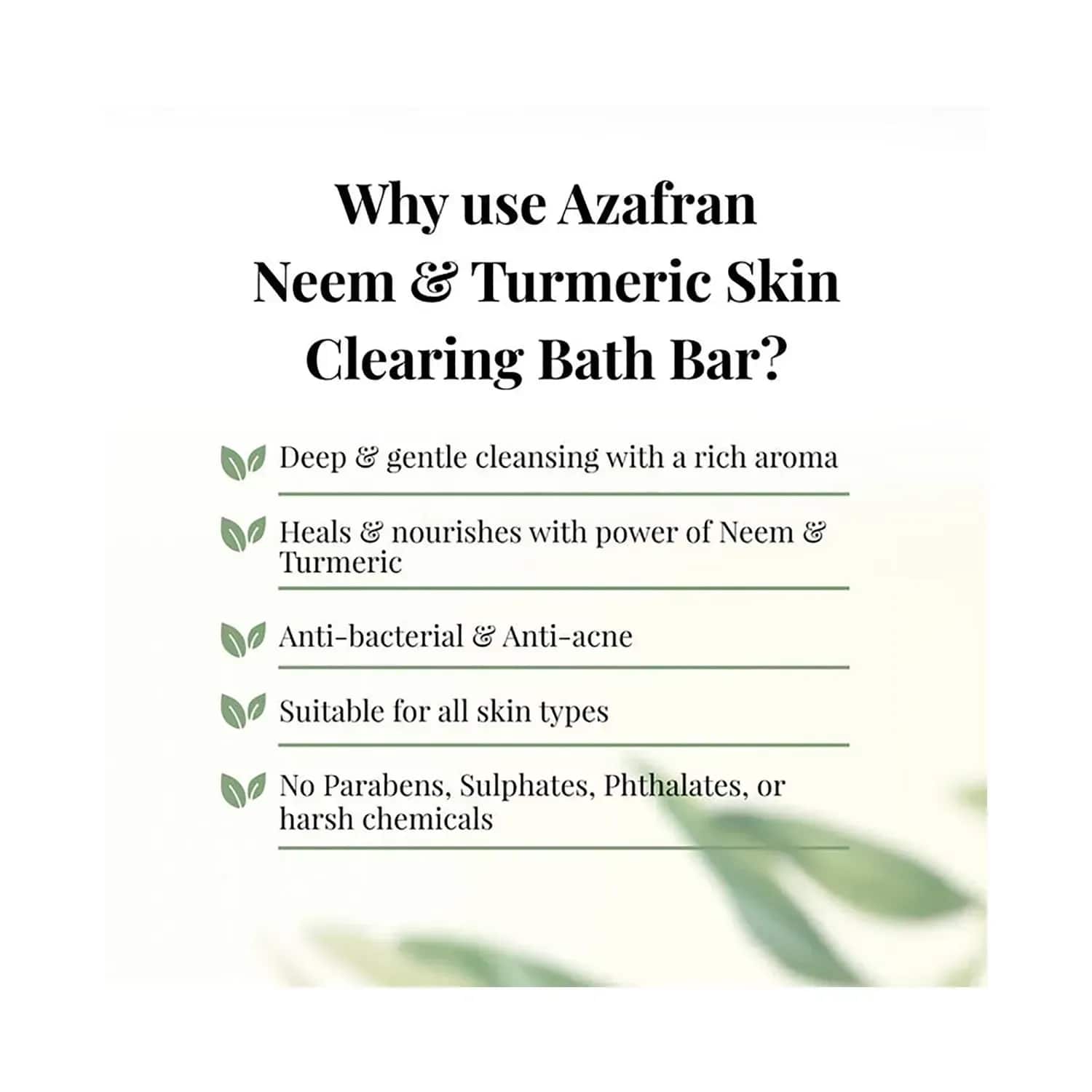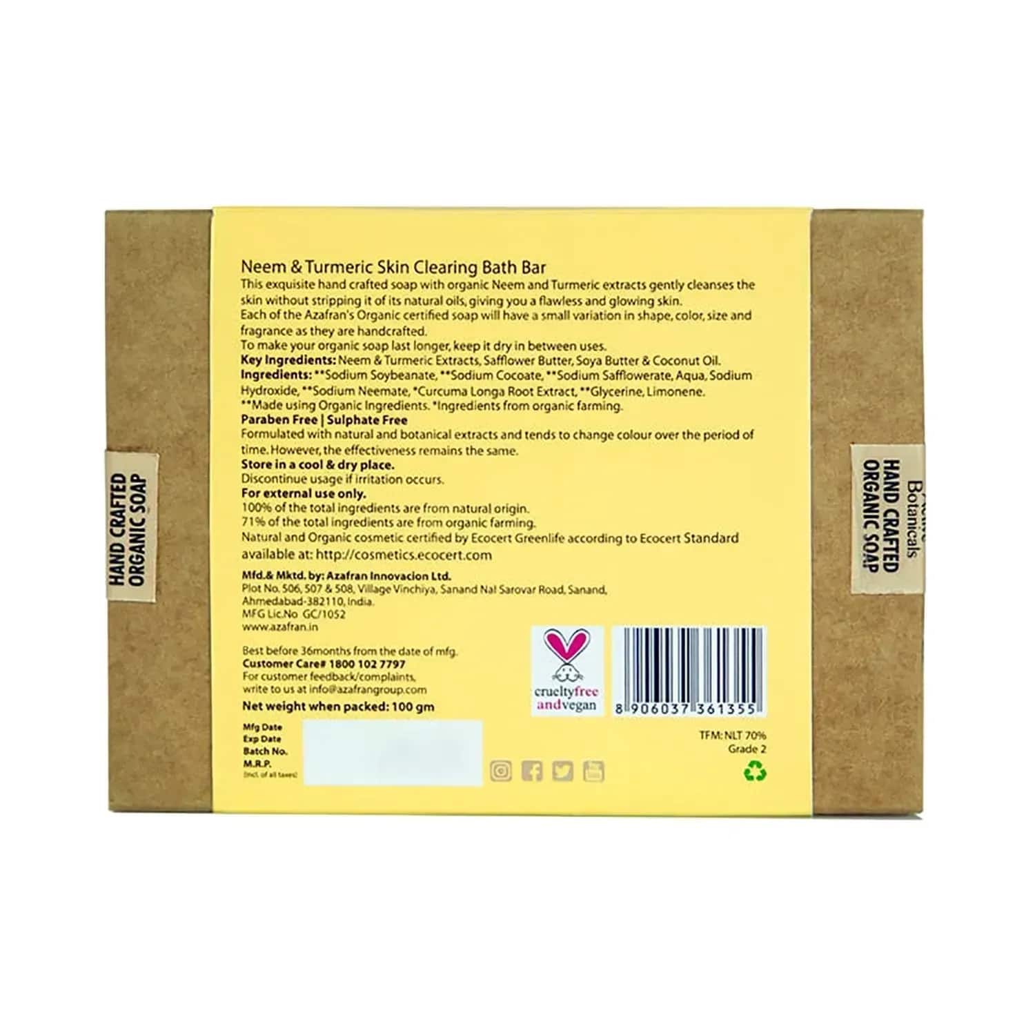Give your delicate skin the pampering it deserves with the Azafran Active Botanicals Neem & Turmeric Skin Clear Bath Bar - (100g). This natural bath soap contains neem and turmeric to provide antibacterial and anti-acne benefits, while the coconut and safflower oils deeply nourish the skin. The gentle bath bar deeply cleanses the skin and exudes a pleasant scent to refresh the senses.Key Features & Benefits:Enriched with neem and turmeric to provide antibacterial and antifungal benefits to reduce inflammation and scars, exfoliate dead skin cells and promote radiant-looking skinInfused with coconut and safflower oils to deeply moisturise and give soft, supple skinHypoallergenic and made with non-GMO ingredients for gentle applicationCruelty-free and vegan bath bar contains no animal derivativesFree of parabens, sulphates, phthalates, and artificial fragrances for safe useFormulated for all skin typesKey Ingredients:Neem and turmeric: Contain antibacterial and antifungal properties to reduce inflammation and scars, exfoliate dead skin cells and promote radiant-looking skinCoconut oil, safflower butter, and soya butter: Deeply moisturise and give soft, supple skinAll Ingredients:Sodium Soybeanate, Sodium Cocoate, Aqua, Sodium Olivate, Sodium Hydroxide, Crocus Sativus Flower Extract, Vetiveria Zizanoides Root Oil, Glycyrhiza Glabra Extract, Olea Europaea OilHow to Use:Rub the bath bar onto your body in circular motions. Lather it up and rinse with warm water.About the Brand:Founded in 2007 by sisters Mansi Vyas and Aditi Vyas, Azafran Innovacion Ltd. is a leading beauty brand in India that manufactures Internationally certified organic products. They use botanical extract concentrates as the base for creating products that are pH balanced and formulated to suit all skin types. Their products include bath bars, facewashes, face scrubs, moisturisers, essences, body care products and much more. All the products are manufactured on a 75-hectare of USDA-organic certified land where they grow the ingredients themselves and manufacture products from them. The ingredients not grown there are sourced from ECOCERT-certified vendors.Check out more Azafran Active Botanicals Soaps options here, or browse through tokocart's full range of Soaps from top global brands.You can also explore other products from the world of Azafran Active Botanicals here on tokocart.