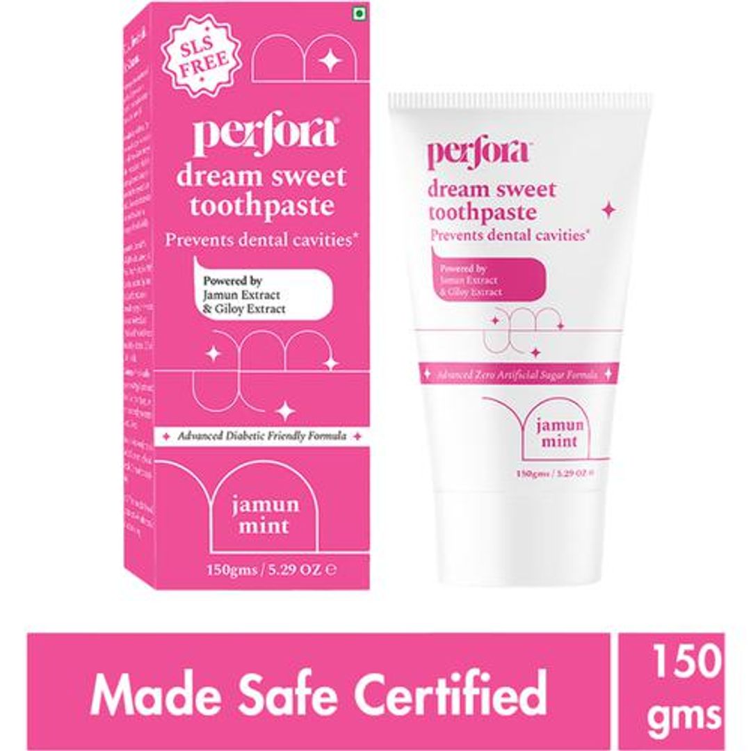 Perfora Dream Sweet toothpaste is specifically formulated for diabetic people who are conscious of their sugar intake. This toothpaste doesn’t contain any artificial sweeteners that are harmful to the overall health and sweeteners that will result in a spike in their blood glucose levels. The formulation contains a blend of natural sweeteners like Stevia & Erthryitol and natural extracts like Jamun, Ginger, and Giloy that help in preventing dental cavities. This formulation uses a more effective substitute of Fluoride known as Nano Hydroxyapatite for teeth remineralization; hence, this toothpaste is Fluoride Free. Perfora Dream Protect toothpaste is Made Safe and Certified and doesn’t contain any artificial colours or toxic ingredients. This toothpaste has mild taste notes of jamun, spearmint, and peppermint that gives a unique and life-changing brushing experience.