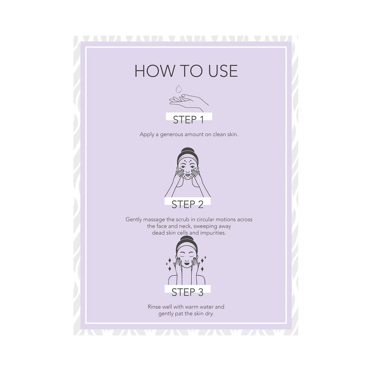 How to Use:Apply the scrub to your clean and wet face, avoiding the eye area. Using your clean fingertips, gently exfoliate in a circular motion for up to a minute. Rinse thoroughly with clean water and pat dry. Follow up with a moisturizer. Use it once or twice a week for effective results.