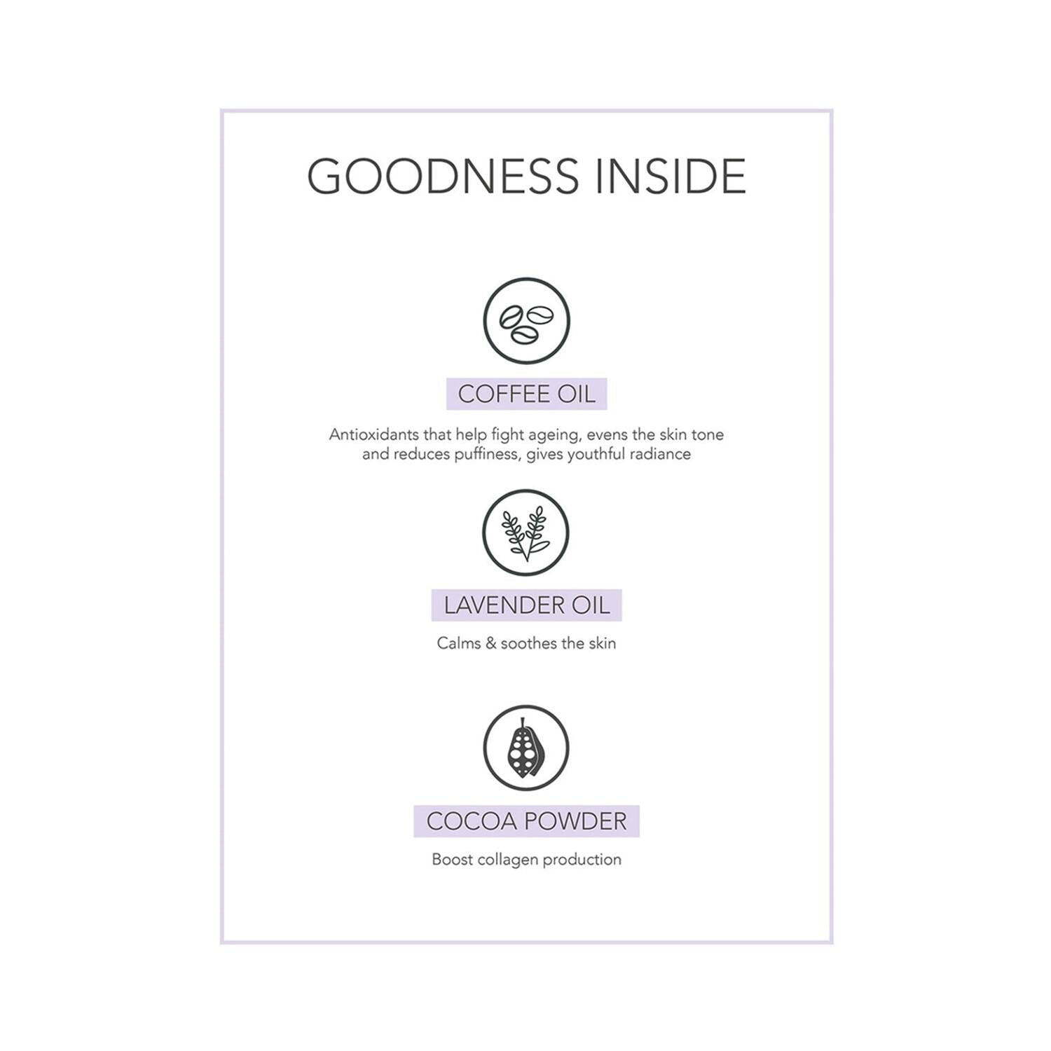 Key Ingredients:Cocoa powder: Increases collagen productionLavender oil: Soothes skinCoffee oil: Fights aging, gives skin tone, reduces puffiness, makes skin radiantGlycerine: Provides hydration