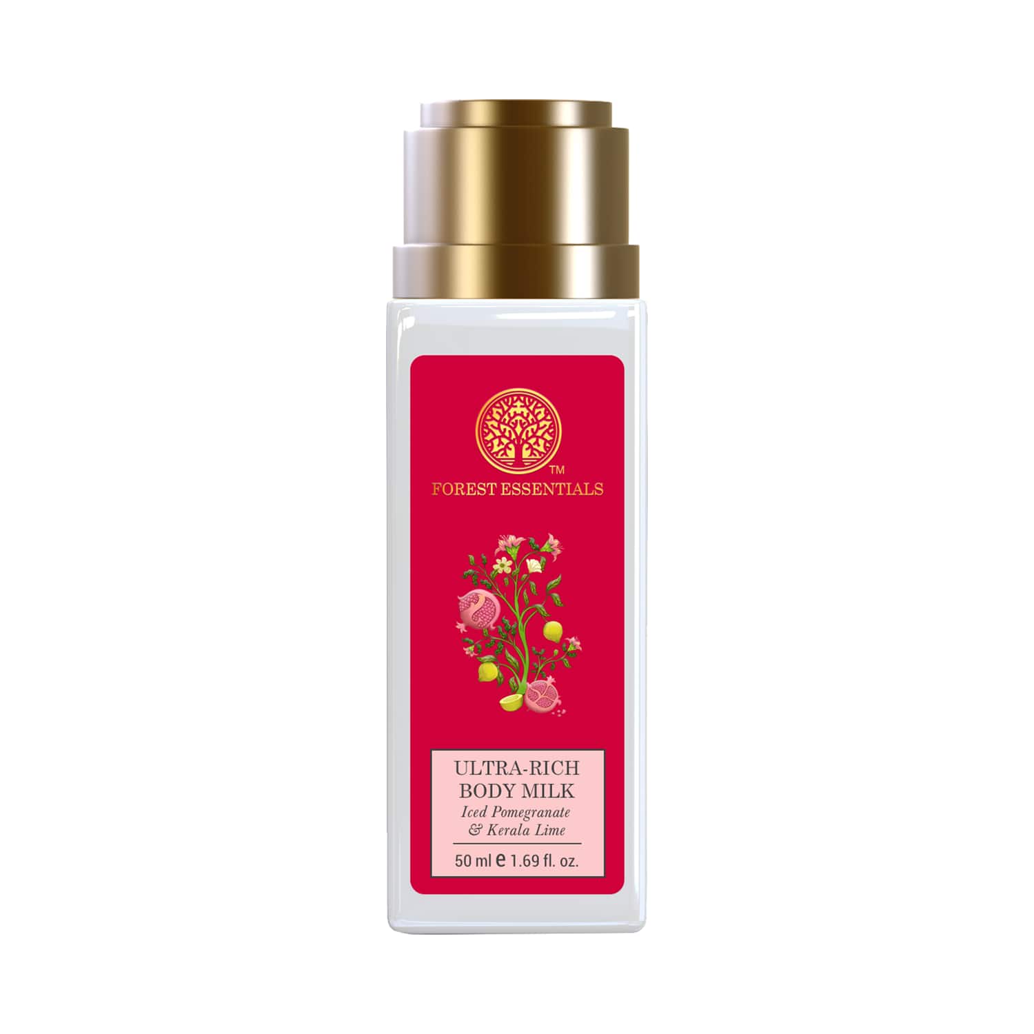Unveil soft, supple skin with the Forest Essentials Travel Size Iced Pomegranate & Kerala Lime Ultra-Rich Body Milk (50ml). This conditioning body lotion contains pomegranate and Kerala lime to provide antioxidant protection. Also, the Forest Essentials body lotion is infused with burnt cane sugar, cream of milk, and apricot oil to seal in moisture content.Key Features & Benefits:Infused with kokum butter, organic beeswax, and sweet almond oil to deeply nourish and add a natural glow to the skinEnriched with apricot oil to prevent signs of agingContains pomegranate and Kerala lime to provide antioxidant benefitsFree from parabens, chemicals, and petrochemicals to ensure safe useKey Ingredients:Pomegranate and Kerala lime: Provide antioxidant benefitsSweet almond oil: Nourishes and adds a natural glow to the skinApricot oil: Prevents signs of agingAll Ingredients:Sweet Almond Kernel Oil(Prunus Amygdalus Dulcis) - 5.0%,Kokum Butter (Garcinia Indica) - 2.0%,Aloe Vera Leaf Juice (Aloe Barbadensis)- 2.0%, Masoor Seed Extract (Lens Culinaris) - 1.0%, Apricot Kernel Oil(Prunus Armeniaca) - 1.0%, Wheat Germ Oil (Triticum Vulgare) - 1.0%, Rice Bran Oil (Oryza Sativa) - 0.5%, Neem Leaf Extract (Azadirachta Indica) - 0.5%, Fresh Pomegranate Extract (Punica Granatum) -0.5%, Fresh Lime Juice (Citrus Aurantifolia) - 0.5%, Menthol Crystals(Mentha Piperata) - 0.01%. Base Contains Aqua, Cetearyl Olivate & Sorbitan Olivate (Olive Oil Derived Emulsifier), Glycerin, Bees Wax (Ceraalba), Lecithin, Sodium Hyaluronate, Caprylic/Capric Triglyceride, Saccharideisomerate, Milk Protein, Burnt Cane Sugar, Sodium Levulinate & Sodium Anisate (Natural Preservative),Ethylhexylglycerin, Vitamin E (Tocopheryl Acetate), Phytic Acid (Natural Chelating Agent) - Q.S.How to Use:After bathing, apply the body lotion all over your body and massage it into your skin using slow, circular movements.About the Brand:Established in 2000 by Mira Kulkarni in New Delhi, India, Forest Essentials is an authentic and traditional skin and hair care brand. They create formulas rooted in the ancient science of Ayurveda. The quintessential beauty brand combines the ancient beauty rituals of Ayurveda with a stylish, modern aesthetic to deliver highly effective products to its consumers. They believe that beauty products made out of living substances, such as plants and their extracts, are balanced by nature and possess the vibratory energy that makes up life. All of their products, from kajals, shampoos, conditioners, body mists, serums, and cheek tints, to baby powder, contain all the purifying, nourishing, and balancing properties necessary to nurture the skin and for eternal beauty.Check out more Forest Essentials Body Lotions & Moisturisers options here, or browse through tokocart's full range of Body Lotions & Moisturisers from top global brands.You can also explore other products from the world of Forest Essentials here on tokocart.