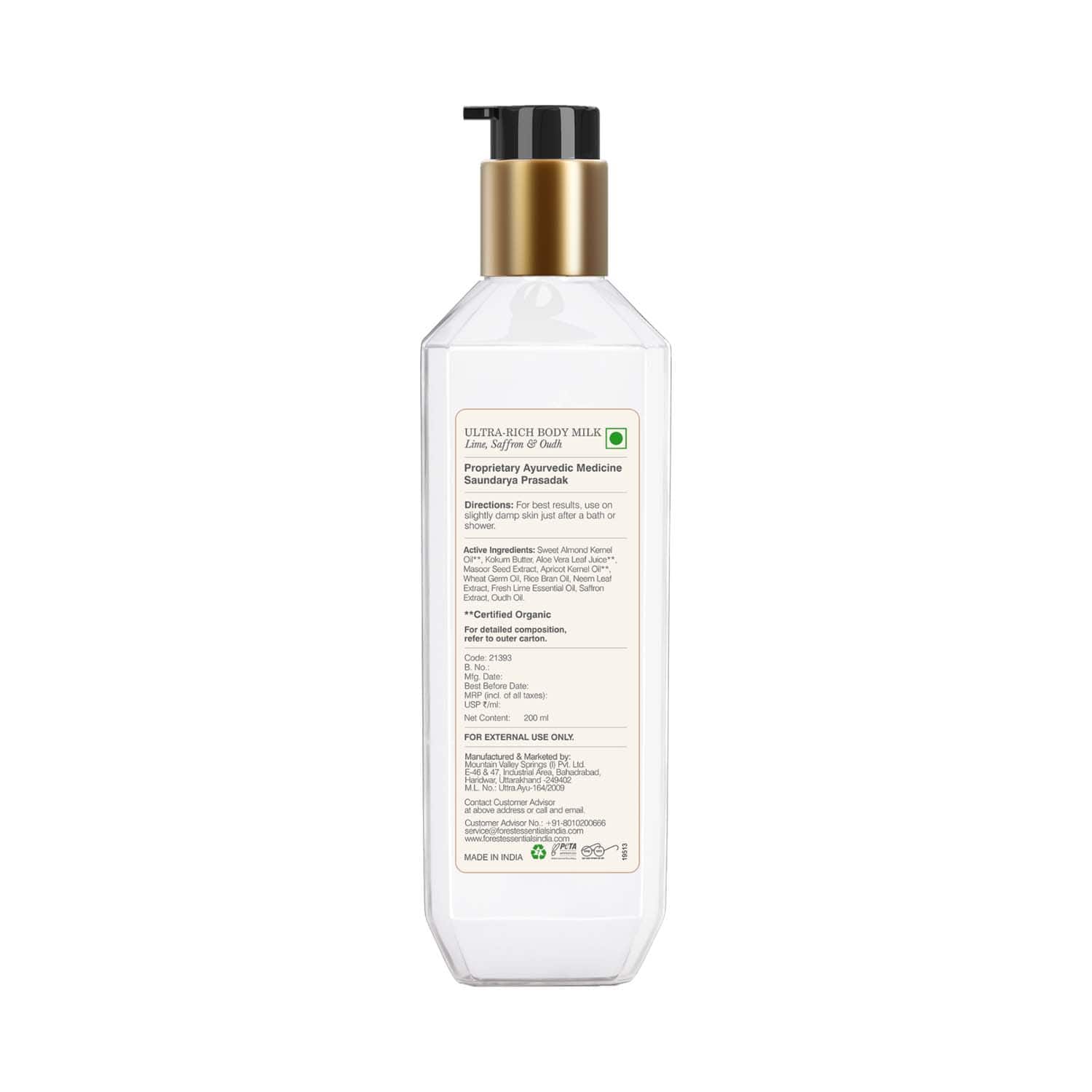 Take care of your skin with the Forest Essentials Ultra Rich Body Milk Lime Saffron and Oudh Natural Body Lotion (200 ml). Infused with the refreshing essence of lime, spicy saffron, and smoky Oudh oil, this enticing body lotion wraps your skin in silkiness and a light, captivating scent. Formulated with burnt cane sugar and nourishing kokum seed butter, it is a lightweight, quick-absorbing Forest Essentials natural body lotion that leaves your skin soft, supple, and luminous.Key Features & Benefits:Formulated with a blend of lime, saffron, and Oudh to deeply hydrate your skinEnriched with natural moisturizers like burnt cane sugar and kokum seed butter to revitalize your skin's textureLightweight and quick-absorbing formula ensures effortless application and imparts supplenessInfused with ingredients such as neem, Kashmiri saffron, and Kerala lime to hydrate your skin and add an earthy fragranceKey Ingredients:Raw cane sugar: Attracts and seals moisture into the skinNeem: Has antibacterial properties and maintains skin healthOudh oil: Has a unique earthy fragranceKashmiri saffron: Purifies your skin and imparts a brilliant complexionAll Ingredients:Raw Cane Sugar, Neem, Oudh Essential Oil, Kashmiri Saffron, Kerala Lime, Kokum Seed ButterHow to Use:Wash your skin. Then, take the required amount of the lotion and apply it to your body. Massage it onto your skin until complete absorption.About the Brand:Established in 2000 by Mira Kulkarni in New Delhi, India, Forest Essentials is an authentic and traditional skin and hair care brand. They create formulas rooted in the ancient science of Ayurveda. The quintessential beauty brand combines the ancient beauty rituals of Ayurveda with a stylish, modern aesthetic to deliver highly effective products to its consumers. They believe that beauty products made out of living substances, such as plants and their extracts, are balanced by nature and possess the vibratory energy that makes up life. All of their products, from kajals, shampoos, conditioners, body mists, serums, and cheek tints, to baby powder, contain all the purifying, nourishing, and balancing properties necessary to nurture the skin and for eternal beauty.