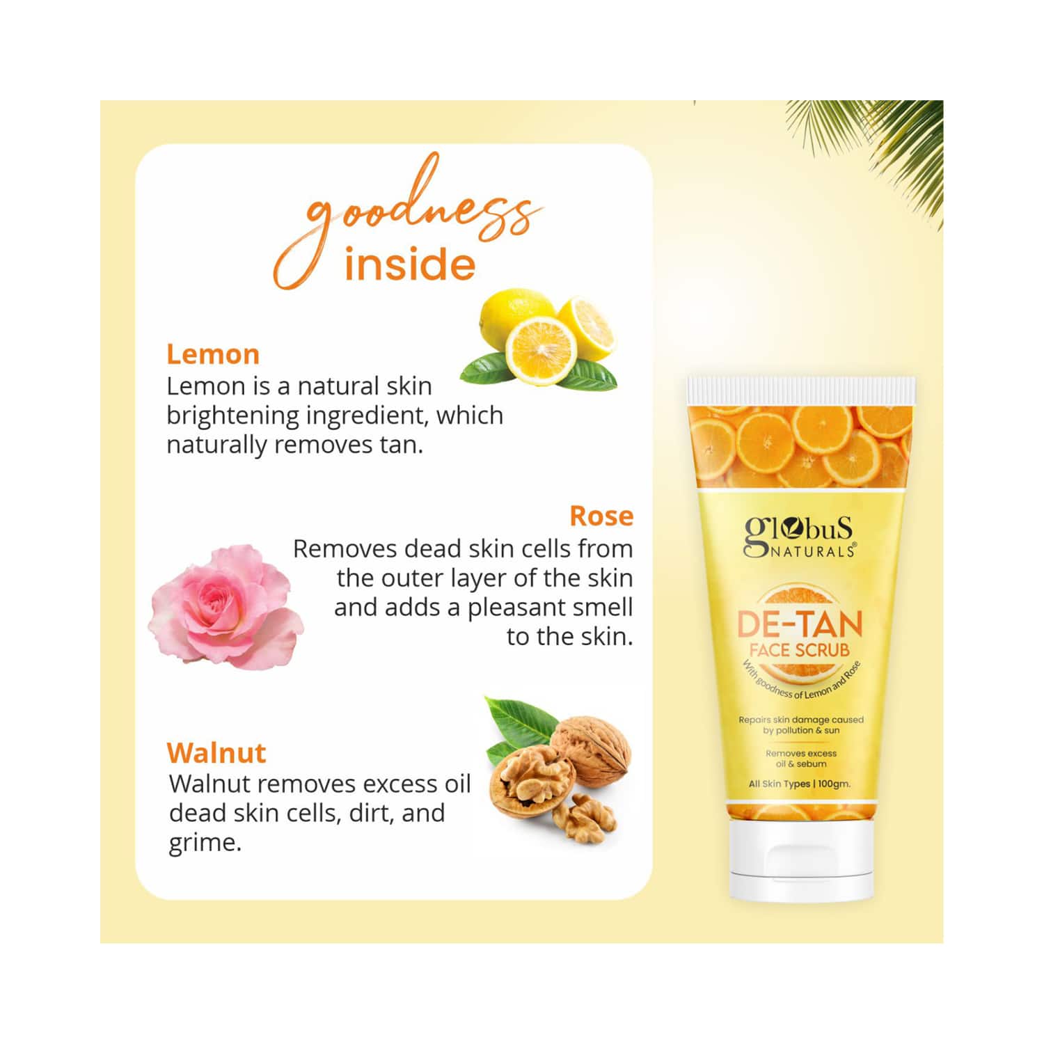 Key Ingredients:Lemon: Removes tanned skinWalnut: Exfoliates the skin