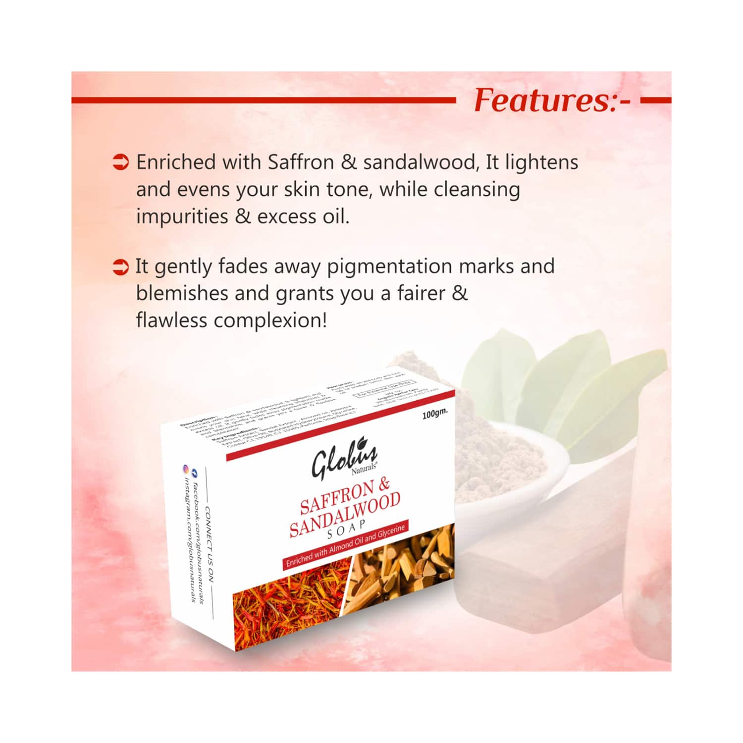 Say hello to a brighter complexion with the Globus Naturals Saffron & Sandalwood Soap (100g). This herbal soap is enriched with saffron, sandalwood, glycerin, and almond oil to even out the skin tone and remove impurities and excess oil. Also, this Globus bath soap leaves the skin bright and glowing.Key Features & Benefits:Enriched with saffron and sandalwood to lighten the skin toneCleanses impurities and excess oil, leaving skin fresh and rejuvenatedContains almond oil to fade pigmentation and blemishesHas a natural and paraben-free formula to ensure safe useKey Ingredients:Saffron: Brightens the complexionSandalwood: Soothes the skinGlycerin: Moisturizes the skinAlmond Oil: Nourishes the skinVitamin C: Promotes collagen productionAll Ingredients:Saffron Extract, Sandal Extract, Almond Oil, Aloe Vera Extract,How to Use:Dampen your skin. Then use water to wet the soap and rub it gently over your body. Shortly after, rinse it off with water and towel dry your body to get fresh and scented skin.About the Brand:Globus Group is headquartered in New Delhi, India. Dr. Anil Verma, a dedicated and passionate doctor with many years of medical experience, founded the brand. Globus Naturals is a world-class manufacturer of beauty and wellness products, offering various quality products designed to support health from the inside out. They use only the best ingredients and test each product to ensure its effectiveness and safety. Whether you want to improve your skin, boost your energy, or promote health and wellness, their products are the perfect way to harness the power of Ayurveda and experience its benefits.Check out more Globus Naturals Soaps options here, or browse through tokocart's full range of Soaps from top global brands.You can also explore other products from the world of Globus Naturals here on tokocart.