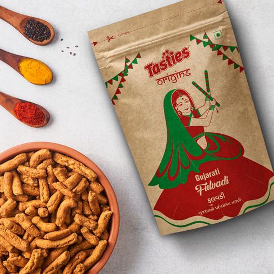 About the ProductFilled with flavour and served with fresh chai, our Namkeen Fulvadi Masala Stick is perfectly blended and made to fulfil your hunger pangs and cravings so that your days are less boring and dull. The perfect munchie to carry with you everywhere, our masala stick is a snack that has proved to increase energy and refresh your mood and is made with fresh and local spices just the way you like it. Made with Split Chickpea Flour, chilli powder and other fresh homely spices, our snacky treats come with a spicy and sweet tadka and are perfect for on the go. A traditional treat that you can relish at any time of the day, our masala sticks are best eaten with any fresh beverage of your choice and are made for occasions of any kind, at any time of the day! Packed with nutrition, our Namkeen Fulvadi Masala Stick - Sweet & Spicy, Gujarati Style has no added preservatives and no trans fat and is the best snack to have in your pantry and is sure to make your tastebuds dance. A natural energy booster, our savoury and sweet treat is best accompanied by any beverage of your choice and is ready to eat. Indulge in savour goodness with our Namkeen Fulvadi Masala Stick now! Experiment with the eclectic range of Tasties Origin's Namkeen collections on Big Basket from Lahsun Sev, Indori Mixture, and more, where tradition meets flavour in local recipes.