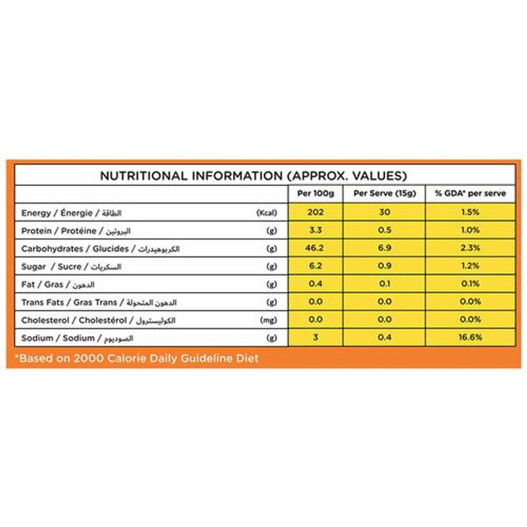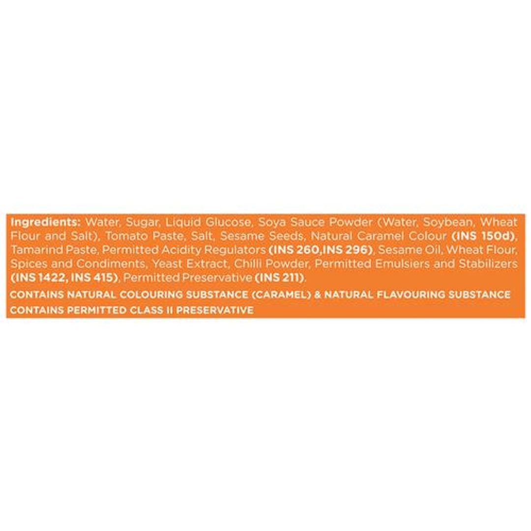Water, Sugar, Liquid Glucose, Soya Sauce Powder (Water, Soybean, Wheat Flour and Salt), Tomato Paste, Salt, Sesame Seeds, Natural Caramel Colour (INS 150d), Tamarind Paste, Permitted Acidity Regulators (INS 260, INS 330), Sesame Oil, Wheat Flour, Spices and Condiments, Yeast Extract, Chilli Powder, Permitted Emulsifiers and Stabilizers (INS 1422, INS 415), Permitted Preservative (INS 211).