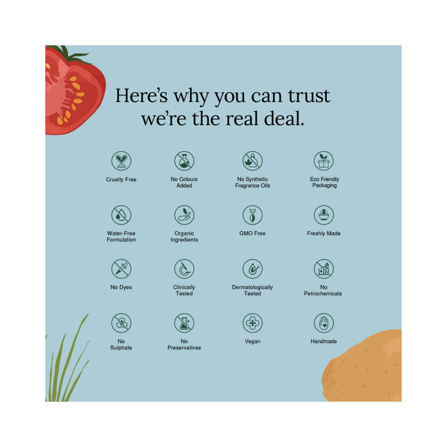 Enhance your bath routine with the Juicy Chemistry Potato, Tomato & Lemongrass Soap (100g). This moisturizing soap leave your skin feeling soft, clean, and hydrated. Made with natural ingredients, it deeply cleanses your pores and is suitable for normal and oily skin. Plus, this Juicy Chemistry soap treats sun tan while helping improve complexion.Key Features & Benefits:Made from natural ingredients for safe useProvides deep cleansing to remove impurities from poresHelps to remove tan and moisturize skinSuitable for normal to oily skin typesKey Ingredients:Potato, tomato, and lemongrass: Nourish and brighten skinAll Ingredients:Sodium Olivate, Sodium Cocoate, Solanum Tuberosum (Potato) Extract, Solanum Lycopersicum (Tomato) Extract, Sodium Shea Butterate, Sodium Mangobutterate, Sodium Castorate, Cymbopogon Schoenanthus (Lemongrass ) Oil, Citrus Limonium (Lemon) Oil, Mentha Piperita (Peppermint) Oil, Citrus Bergamia (Bergamot) Oil, Piper Nigrum (Black Pepper) Seed Oil, Ocimum Sanctum (Basil) Oil, Citrus Paradisi (Grapefruit) Oil.How to Use:Dampen your skin. Then use water to wet the soap and rub it gently over your body. Shortly after, rinse it off with water and towel dry your body to get fresh and scented skin.About the Brand:Juicy Chemistry is an Indian organic cosmetics brand certified by ECOCERT. It was launched in 2014 by Megha Desai Asher and Pritesh Asherto to develop effective skincare products based on nature's goodness and science. Juicy Chemistry is committed to helping everyone find answers to their skin problems, and they believe that the answer lies in nature. They diligently put time and effort into understanding every ingredient's chemical and physical properties.Check out more Juicy Chemistry Soaps options here, or browse through tokocart's full range of Soaps from top global brands.You can also explore other products from the world of Juicy Chemistry here on tokocart.