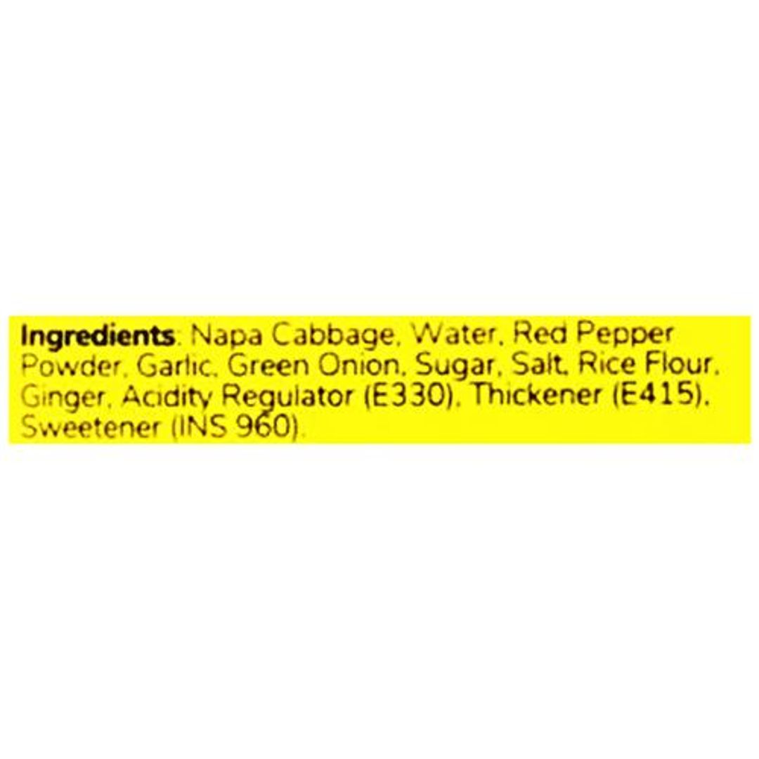 Napa Cabbage, Water, Red Pepper Powder, Garlic, Green Onion, Sugar Salt, Rice Flour, Ginger, Acidity Regulator (E330), Thickener (E415) & Sweetener (INS 960).