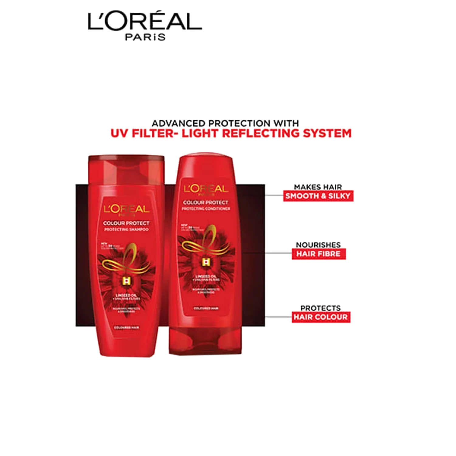 Pamper and protect your coloured hair with the L'Oreal Paris Colour Protect Shampoo. It nourishes and hydrates dry, dull hair and helps repair damaged hair. This formula comes with a UV filter, a Light Reflecting System, that combines an active nourishing ingredient and filters that keep the hair protected from external aggressions and prolongs the colour radiance. For best results, use this with the L'Oreal Paris Colour Protect Conditioner.Key Features & Benefits:Nourishes The Hair And Transforms Its SurfaceHair Feels Silky To TouchHelps Protect The Hair Fibre From External Aggressions And Accentuates The Color'S RadianceProlongs Color & Protects HairAll Ingredients:Aqua / Water, Sodium Laureth Sulfate, Dimethicone, Coco-Betaine, Glycol Distearate, Sodium Chloride, Guar Hydroxpropyltrimonium Chloride, Cocamiide Mipa, Tocopherol, Sodium Benzoate, Sodium Cocoate, Sodium Hydroxide, Ethylhexyl Methoxycinnamate, Salicyclic Acid, Benzyl Salicylate, Benzyl Alcohol, Linalool, Benzophenone-4. Alpha-Isomethyk Ionone, Carbomer, Geraniol, Butylphenyl Methylpropional, Cocoate, Citric Acid, Hexylene Glycol, Hexyl Cinnamal, ParfumHow to Use:Distribute the shampoo evenly through your wet hair and lather.Rinse thoroughly and repeat the process if requiredAbout the Brand:With more than 40 years of pioneering scienti?c research heritage, L'Oreal Paris is proud to offer a stringent selection of the most advanced beauty care with proven ef?cacy and safety to its consumers. Committed to quality, scientific excellence, and permanent innovation, we are proud to be the world's leading cosmetics brand that makes the best of beauty available to all. With L'Oreal Paris, beauty is synonymous with luxury and accessibility, for fans everywhere to make their own. L'Oreal Paris brand encompasses the four major beauty categories - hair colour, cosmetics, hair care, and skin care - and includes such well-known brands as Excellence Creme, Total Repair 5 hair care, Youth Code, Fall Repair, Revitalift, Volume Million Lashes Mascara, Colour Riche lipsticks, Superliners and True Match foundations among many others.Check out more L'Oreal Paris Shampoo options here, or browse through tokocart's full range of Shampoo from top global brands.You can also explore other products from the world of L'Oreal Paris here on tokocart.
