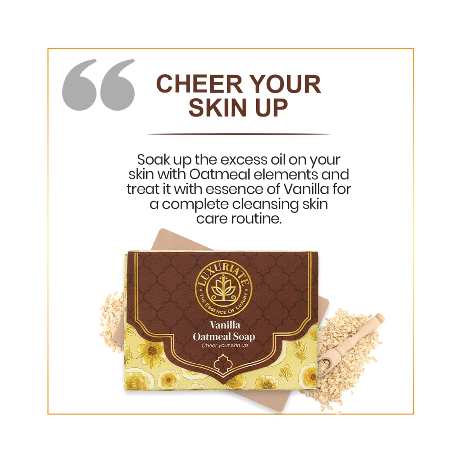 Boost skin glow and radiance with the Luxuriate Vanilla Oatmeal Soap (125g). This brightening soap enhances luster, evens skin tone, and improves elasticity for radiant, youthful skin. In addition, this moisturizing soap soothes and hydrates dry, damaged skin leaving it refreshed, supple, and soft.Key Features & Benefits:Deep cleanses to leave your skin feeling freshRetains natural moisture to soothe dry skinEvens skin tone for a brighter glowMoisturizes to keep skin supple and softIncreases skin elasticity to delay signs of agingKey Ingredients:Vanilla: Offers a refreshing fragranceOatmeal: Soothes dry, itchy, and irritated skinHow to Use:Wet the bar and gently massage onto the skin to create a lather and wash. Rinse well and pat dry.All Ingredients:Glycerin Soap Base, Oats, FragranceAbout the Brand:Luxuriate is a skin, hair, and body care brand that combines ancient skin and hair care rituals with modern science to curate high-quality and result-driven products. Luxuriate offers natural and vegan beauty essentials with fresh and natural ingredients. All its offerings are made in India, non-toxic, cruelty-free, and bereft of parabens and sulfates. In addition, the brand is GMP- and ISO-certified.Check out more LUXURIATE Soaps options here, or browse through tokocart's full range of Soaps from top global brands.You can also explore other products from the world of LUXURIATE here on tokocart.