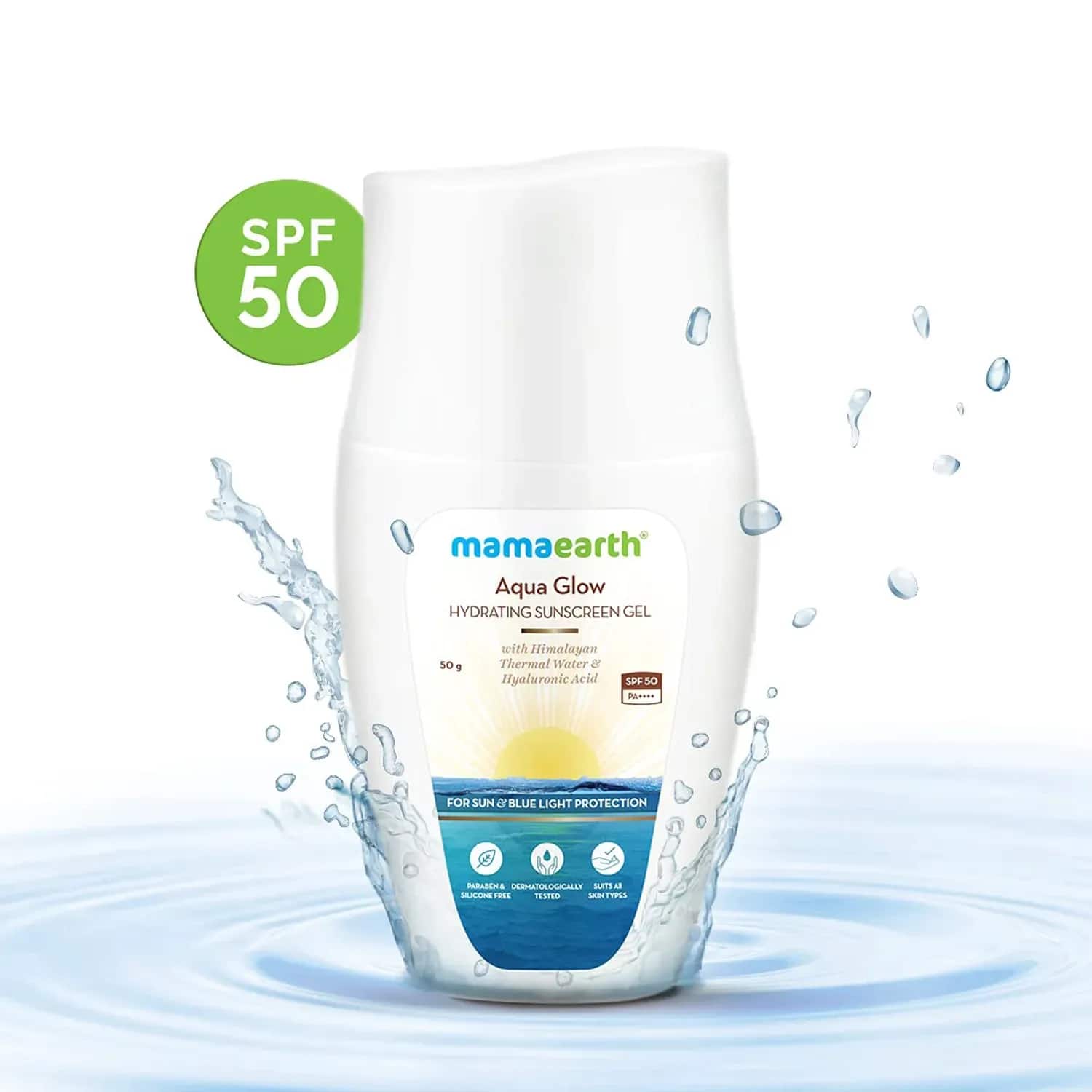 Mamaearth Aqua Glow Hydrating Sunscreen Gel, rich in minerals like Magnesium, Potassium & Calcium, Himalayan Thermal Water and is nature's answer to maintain the skin's protective barrier, keep it super hydrated and youthful. Light as a feather, the gel-based formula doesn't leave a white cast or feel heavy on the skin. And it does it all while giving you the ultimate boost of hydration. Here's a safe and natural aqua sunscreen that goes above and beyond. Protect your skin from blue light emitted from electronic screens with Aqua Glow Hydrating Sunscreen Gel. Hello, younger, clearer, and hydrated skin. Shield your skin from harmful UV A & B rays all day, every day! SPF 50 PA++++ protection is 16 times more powerful to protect you from the sun. Results? No sun damage, no pigmentation, and no tanning.Key Features & BenefitsProtects against UV A and B raysBlue light protectionUltra-light and hydrating formulaGoodness of Himalayan thermal waterSafe and naturalKey IngredientsAloe Vera - Helps stimulate both collagen and elastin fibres, boosting the elasticity of your skinHyaluronic Acid - Helps skin stretch and flex and reduces skin wrinkles and linesHow To UseApply sunscreen on a clean face, neck, and other exposed parts of the skin. Re-apply after every swim or in case of excessive sweating. Apply every 6 hours for complete protection. Can be used under makeup.All IngredientsHimalayan Thermal Water, Hyaluronic Acid, Aloe VeraAbout the BrandMamaearth was founded in September 2016 by Ghazal Alagh and Varun Alagh, to make skincare routines a little chic but with utmost care. Headquartered in Gurugram (India), Mamaearth is distinguished in the cosmetics industry of India as an online platform that offers natural and toxin-free skin care products.