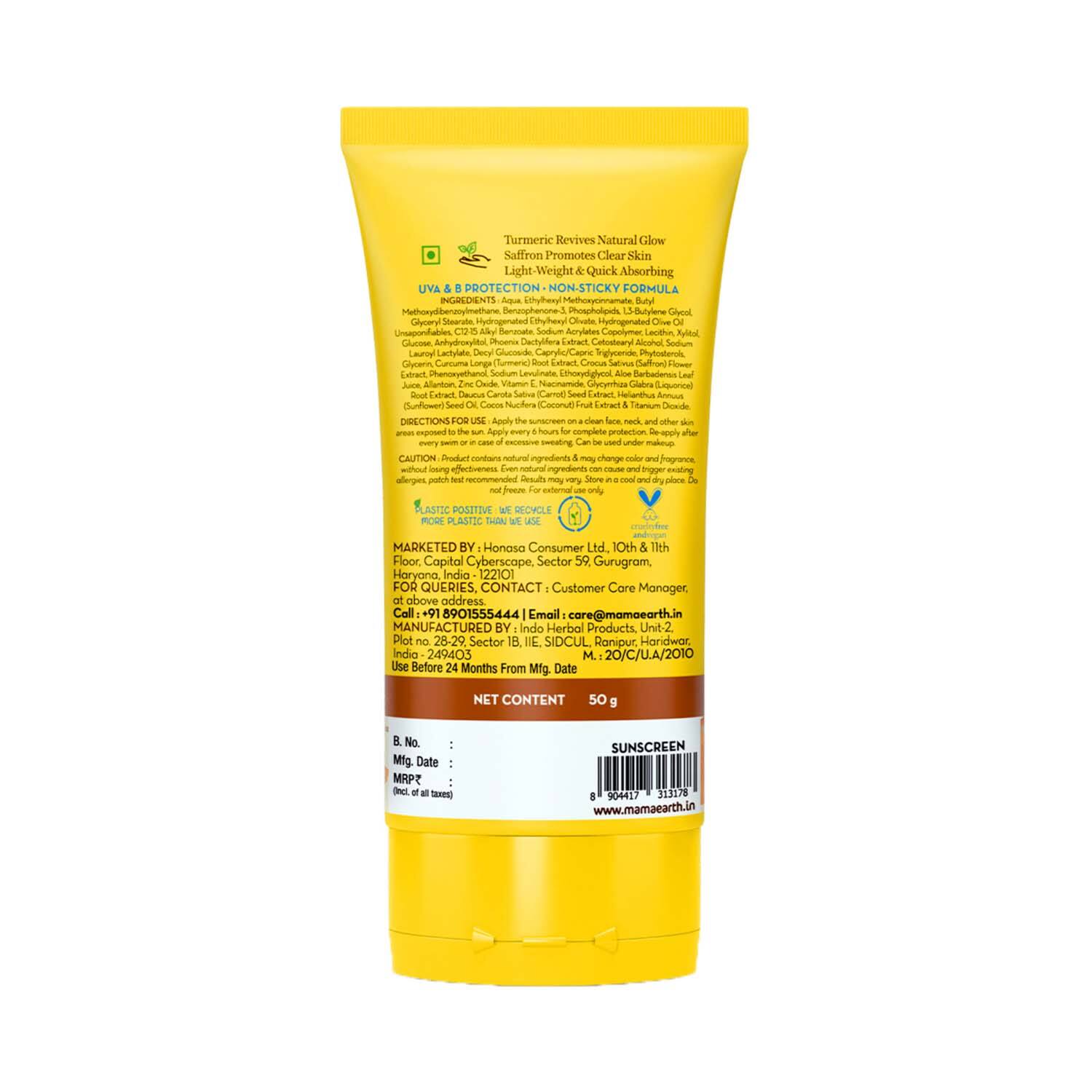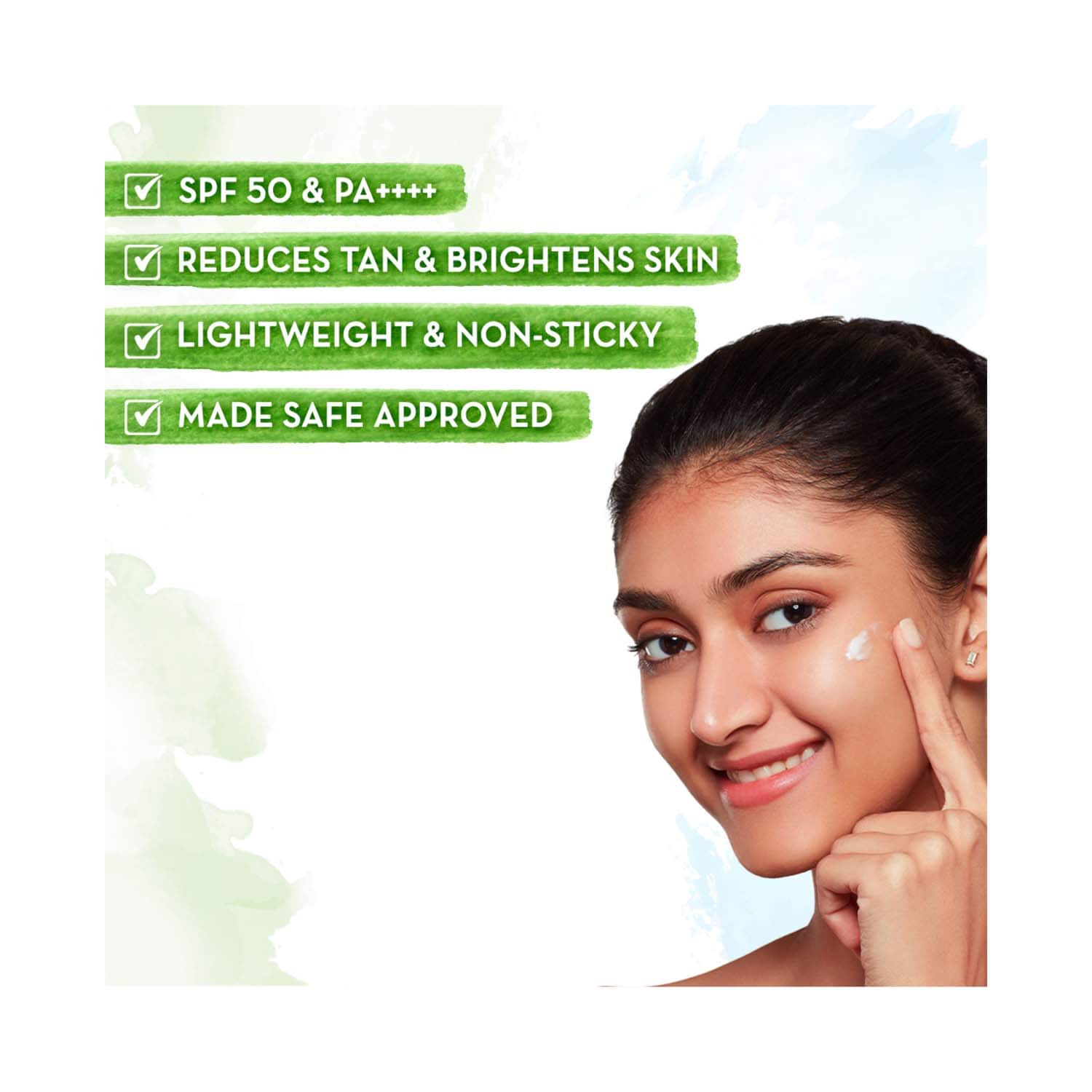 Key Features & Benefits:Broad-spectrum SPF 50 PA++++ sunscreen that protects the skin from damaging UVA and UVB raysEnriched with traditional ubtan that has de-tanning and skin brightening properties, giving you clear, bright skinContains turmeric and saffron that fight tan and promote skin-lightening for radiant skinWeightless sunscreen that blends easily for a non-greasy finish