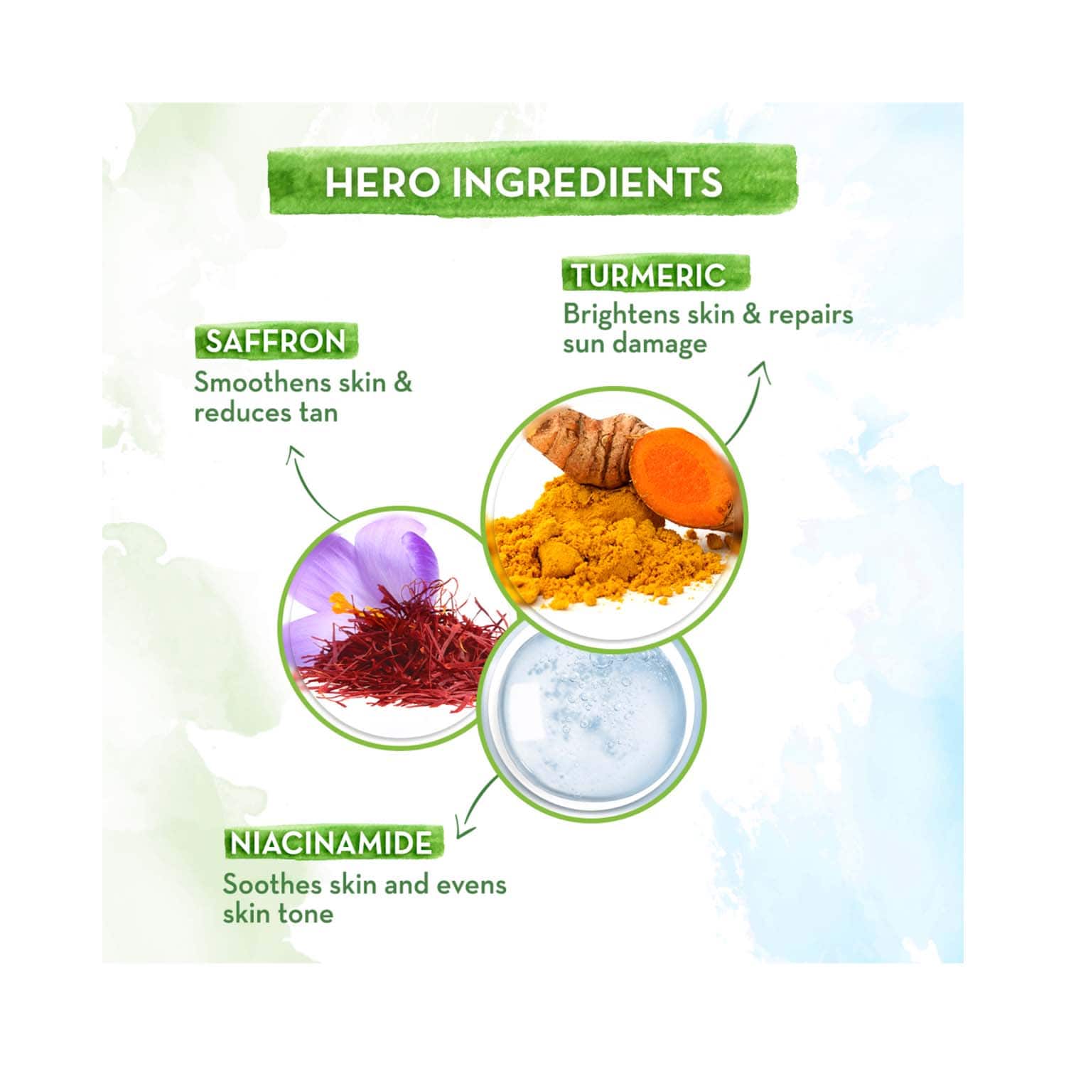 Key Ingredients:Turmeric: Has skin-brightening and de-tanning propertiesSaffron: Brightens the skinAloe vera: Soothes irritated skin