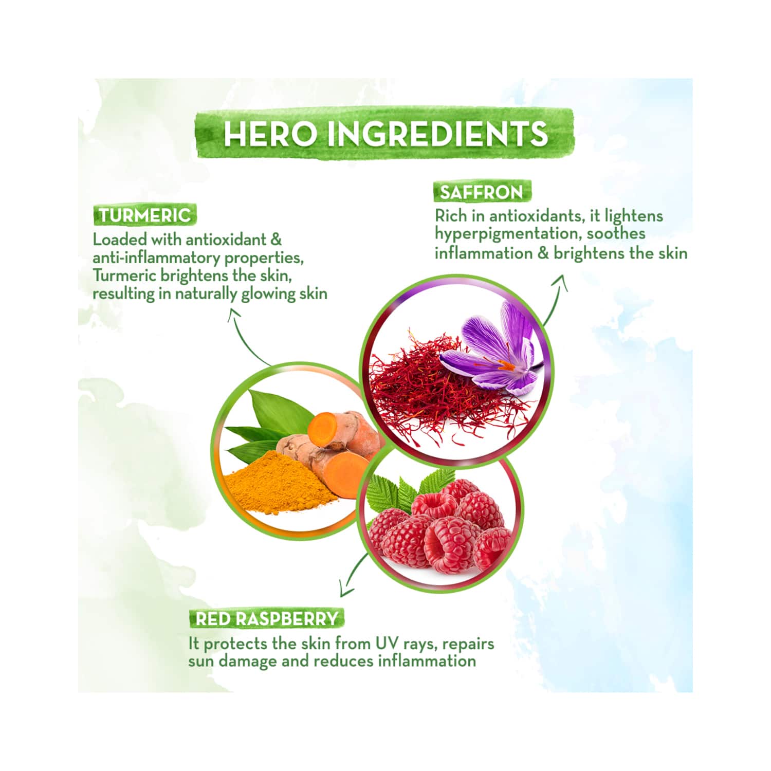 Key Features & Benefits:Infused with saffron and turmeric extract to provide a glowing effectContains carrot seed oil to protect the skin from UV raysNon-greasy gets absorbed quickly into the skinFree from toxins for safe use