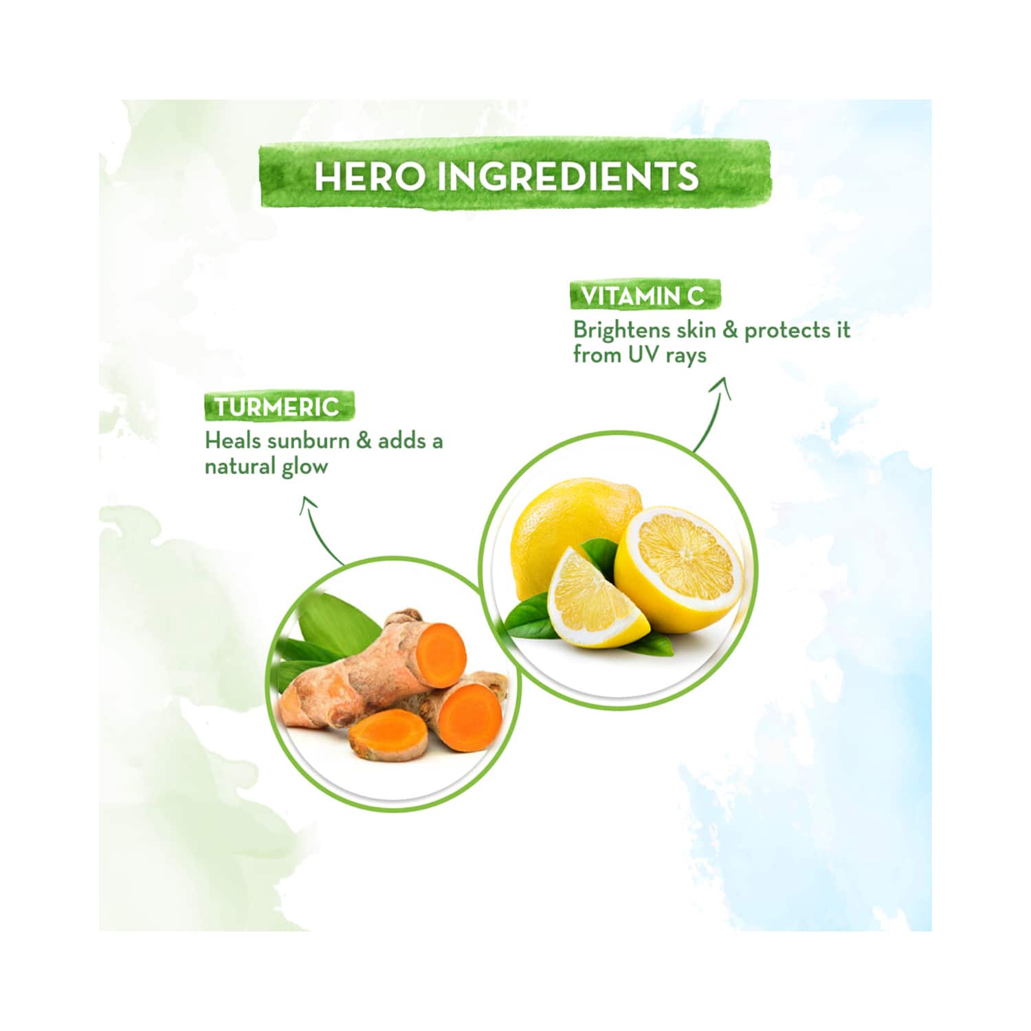 Key Features & Benefits:Infused with vitamin C to brighten the skinContains turmeric to heal sunburn and add a natural glowSPF 50 PA++ protects the skin against UVA and UVB sun raysLightweight formula offers a non-sticky feel