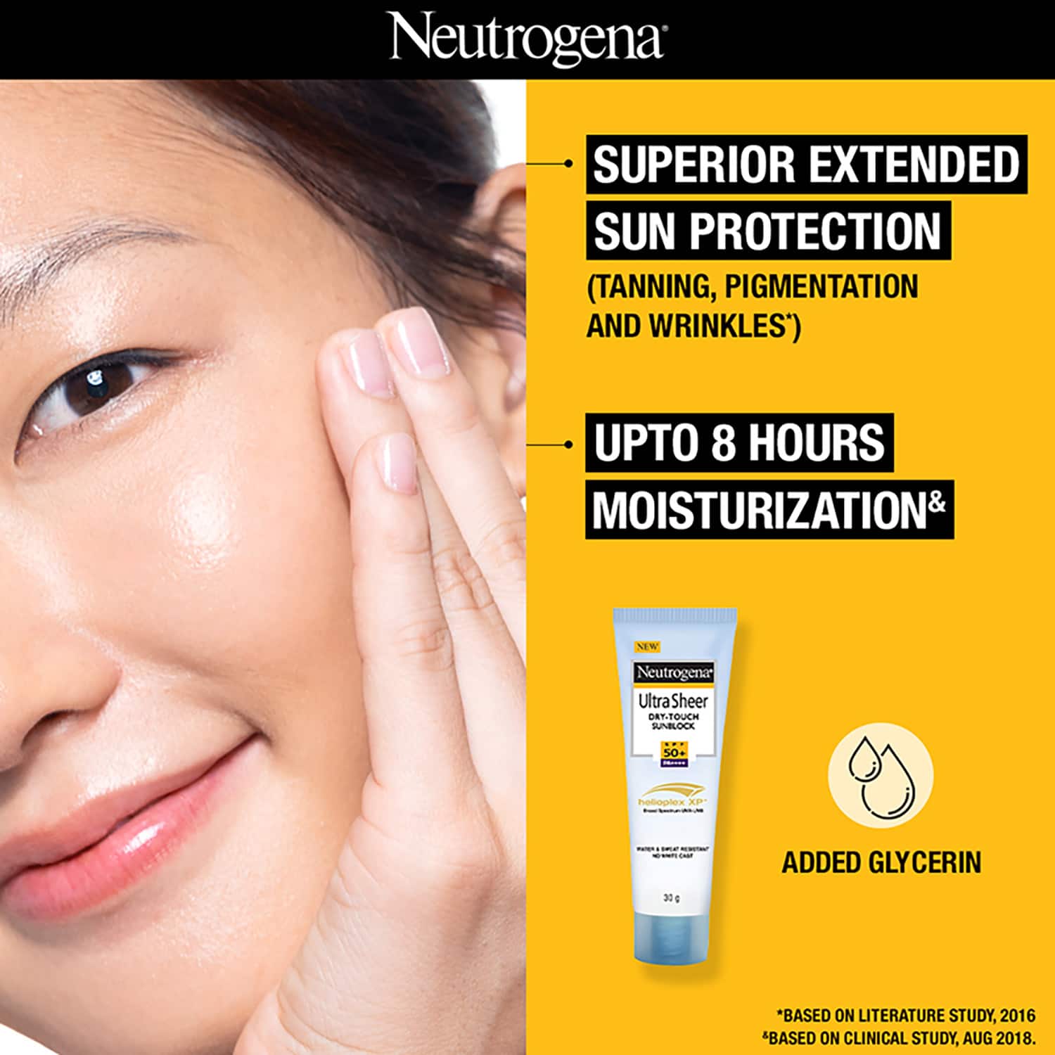 Step into the light confidently with the Neutrogena Ultra Sheer Dry Touch Sunscreen - SPF50 (30ml). Powered by exclusive Helioplex XP® technology, this sunscreen goes above and beyond, guarding against 5 signs of sun damage including tanning, pigmentation, wrinkles, loss of firmness, and loss of elasticity. With its SPF50+ broad spectrum protection, it shields your skin from both aging UVA and burning UVB rays, ensuring your skin stays youthful and healthy. The ultra-light, non-sticky formula absorbs instantly without leaving behind any white cast, while also being water and sweat-resistant. Plus, it's non-comedogenic, making it suitable for even the most sensitive and pimple-prone skin types.