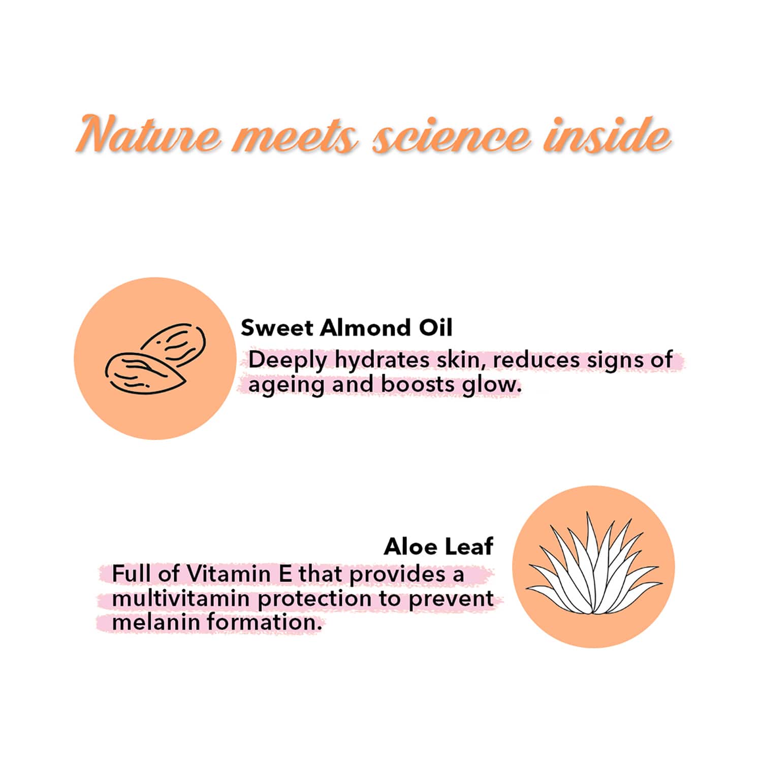 Key Ingredients:Sweet almond oil: Hydrates the skinAloe vera: Stops melanin formation