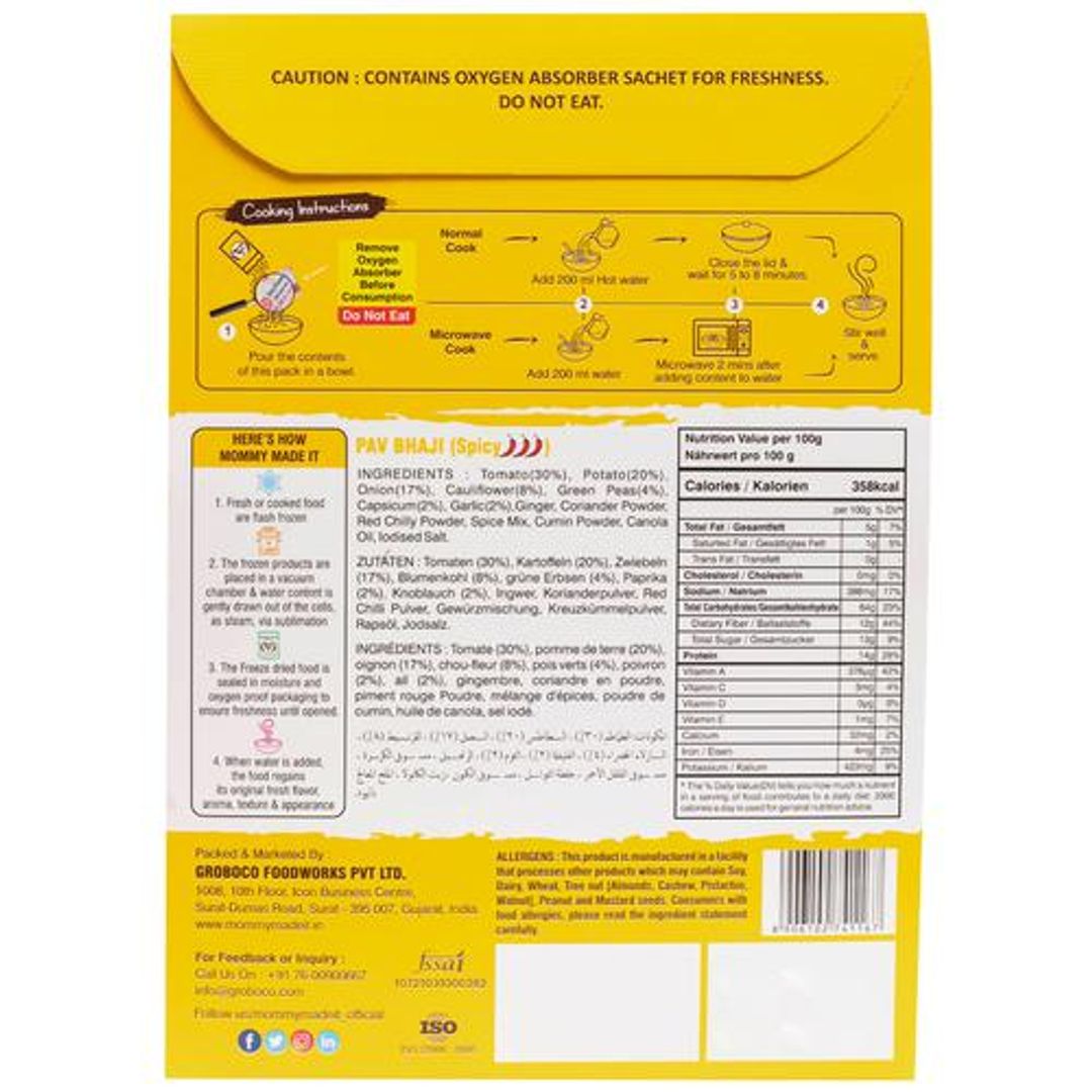 A home-cooked meal or more of a mom-cooked meal is one of the most important meals for anyone. So, here we present you with a tasty, healthy and nourishing meal filled with mother's love. Introducing the authentic Mommy Made It Pav Bhaji, it is a ready-to-cook meal that takes less than ten minutes to prepare and tame your hunger. It is perfect for your cravings. It is healthy and delicious. You will get the taste of all the masalas and the goodness of all the veggies. It is full of nutrition and a diet-friendly product.