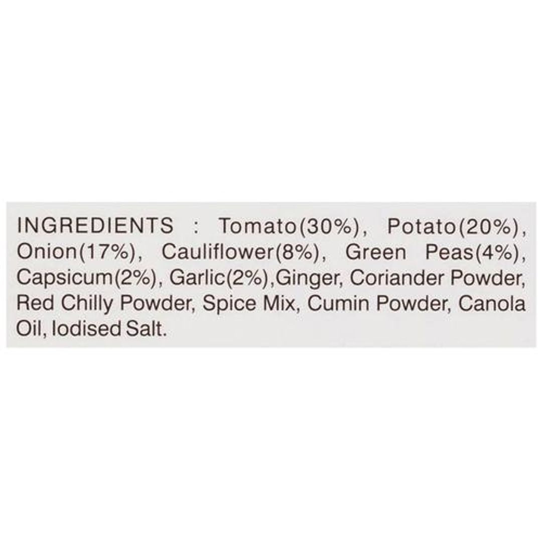 Tomato, Onion, Peas, Potato, Butter, Vegetable Oil (Palmolein), Lime, Spices And Condiments(Coriander, Garlic, Ginger, Chilli Powder, Cumin Seeds), And Iodised Salt.
