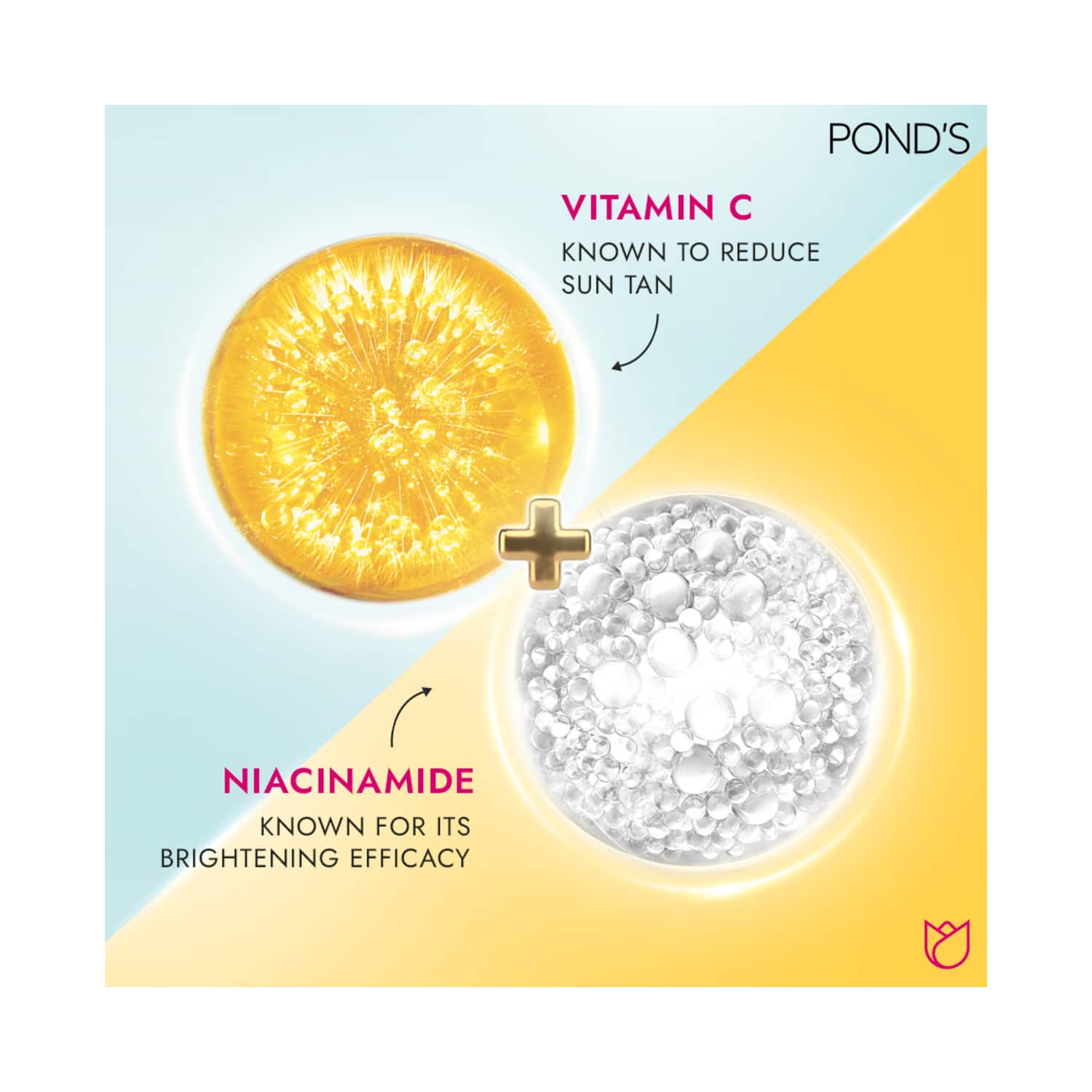 Key Ingredients:Vitamin C: Reduces sun tanNiacinamide: Brightens the skinGlycerin: Moisturizes the skin