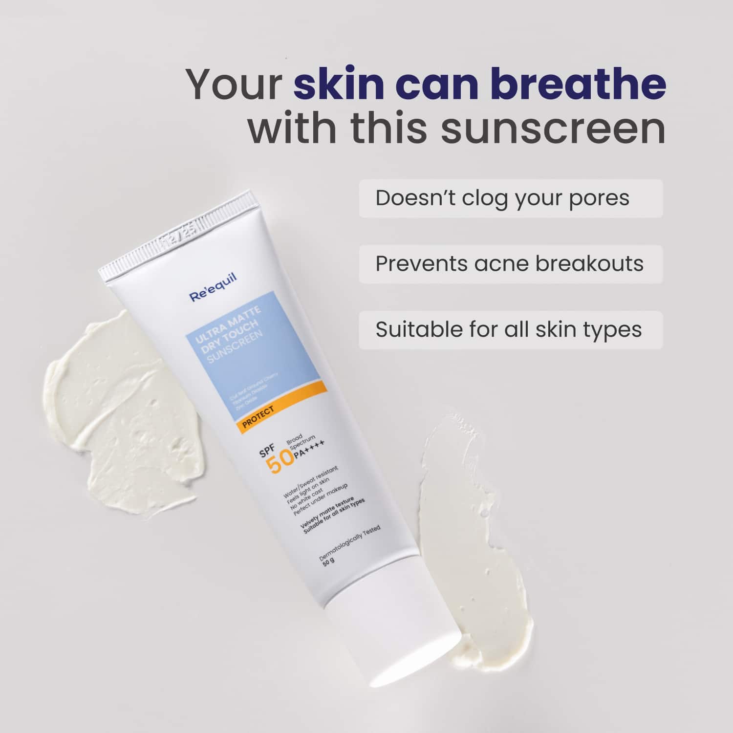 Shield your skin with the Re'equil Ultra Matte Dry Touch Sunscreen Gel SPF 50 - (50g) for a better look. It is a gel-like sunscreen that is a perfect choice as a primer under makeup. This Re'equil sunscreen offers SPF 50 protection and shields your skin against harmful rays. The matte sunscreen is waterproof and stays for long hours.Key Features & Benefits:Sunscreen offers a matte finish on applicationAct as a primer under makeupWaterproof sunscreen that stays for long hoursParaben-free sunscreen for safe useKey Ingredients:Physalis angulata: Calms irritated skinHow to Use:Take a little bit of sunscreen on your hand. Dab it over your face and neck in a circular motion for easy absorption of the cream. If you apply makeup later, ensure that you wait five minutes after applying the cream for better absorption.All Ingredients:Cyclopentasiloxane & Dimethicone Cross Polymer, Caprylyl Methicone And Peg-10 Dimethicone/ Ppg-20 Crosspolymer, Octinoxate, C12-15 Alkyl Benzoate, Diethylamino Hydroxybenzoyl Hexyl Benzoate, Diethylhexyl Butamido Triazone, Caprylyl Methicone, Zinc Oxide, Titanium Dioxide, Bisethylhexyloxyphenol Methoxyphenyl Triazine, Caprylic Capric Triglyceride, Physalis Angulata Extract, Diethylhexyl Syringylidenemalonate, Fragrance.About the Brand:Re’equil was launched in 2018 as India’s first online direct-to-consumer cosmeceutical brand. It deals with products that offer healthy skin and hair for customers. All the products from the brand are dermatologically tested and are proven safe against any skin allergies, reactions, or inflammations. The brand is also socially committed, and for every product you purchase, the brand provides a mid-day meal for an underprivileged child.