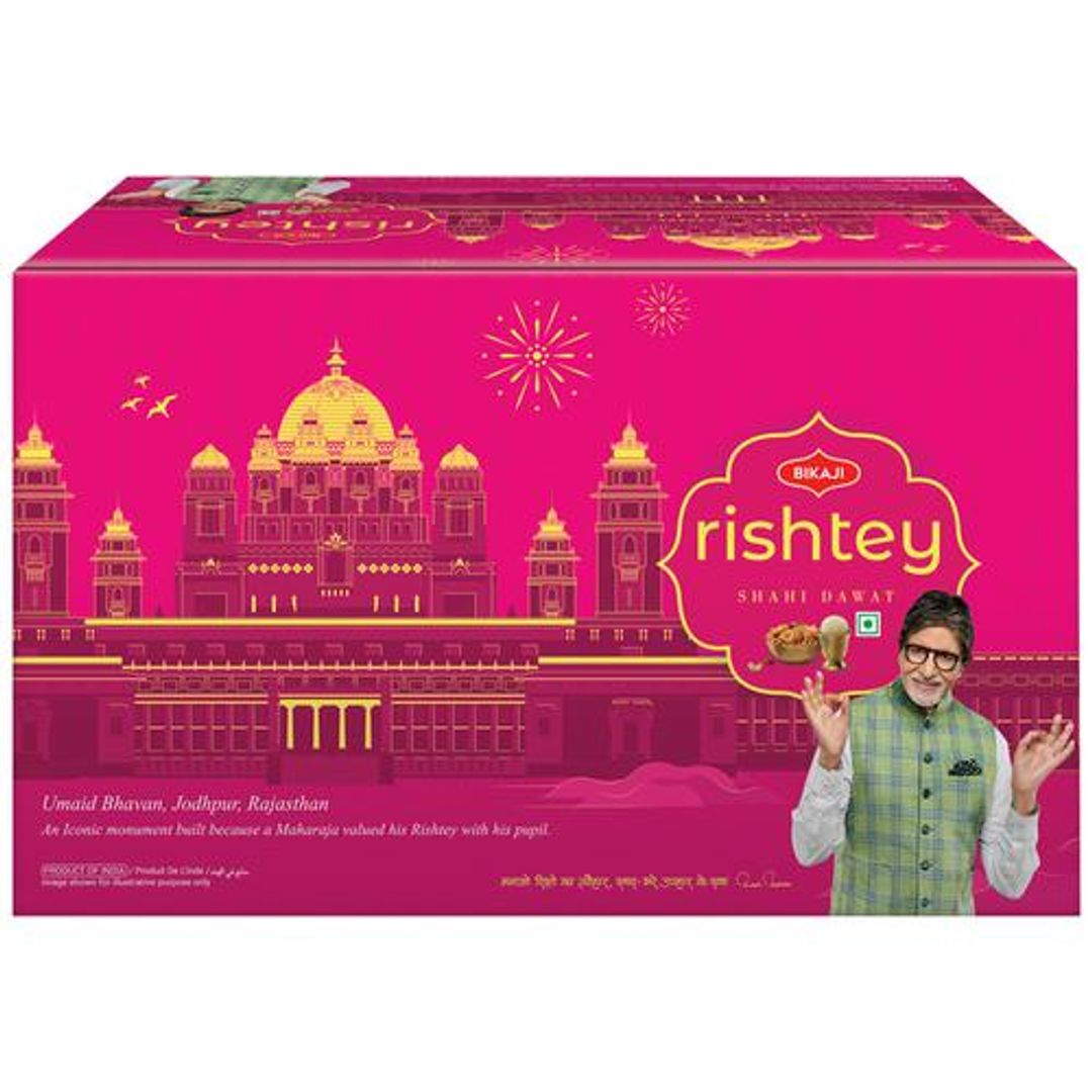 Bikaji Rishtey Shahi Dawat is a perfect gift hamper to give to your loved ones during any occasion and festival. Pack with delicious items your loved ones will surely love it. With the deliciousness of sweet and savoury, this hamper contains Bikaneri Bhujia, Sab Kuch Navratna Mix, Shahi Mixture, Crusty Nuts, Manbhavan Soan Papdi, Rasgulla