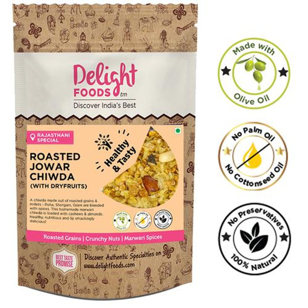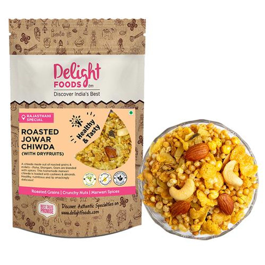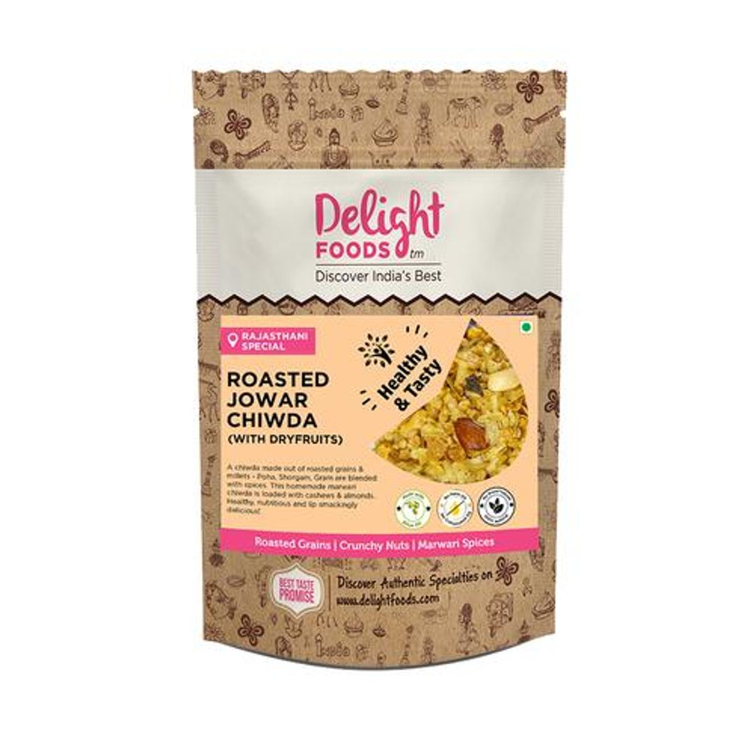 Enjoy the most delicious & crispy roasted Poha (Flat Rice) and Jowar (Sorghum) chiwda/chidwa from Rajasthan with rich dry fruits. A healthy and flavorful mix of poha, sorghum, cornflakes, cashews & almonds, seasoned with a touch of olive oil & traditional Marwari Rajasthani spices. A homemade crispy and crunchy recipe that can be eaten without any worries or guilt. Unlike other popular mass brands, we don’t use harmful cottonseed/ palm oil, vegetable fat in our healthy range of snacks. Each pack contains tasty chiwda prepared using premium ingredients, a dash of love, and nothing else; No preservatives or chemicals are used in our snacks to ensure you can enjoy snacking without the fear of ingesting harmful additives. Have it with your loved ones while you sip a piping hot cup of tea/ coffee or as a quick bite when you need a snack.