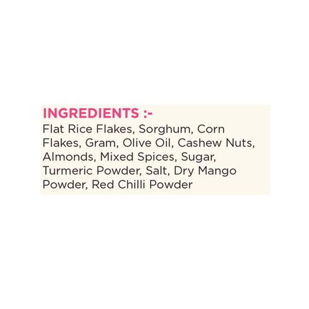 Flat Rice Flakes, Corn Flakes, Sorghum, Turmeric Powder, Red Chilli Powder, Dry Mango Powder, Cashews, Olive Oil, Gram, Almonds, Mixed Spices