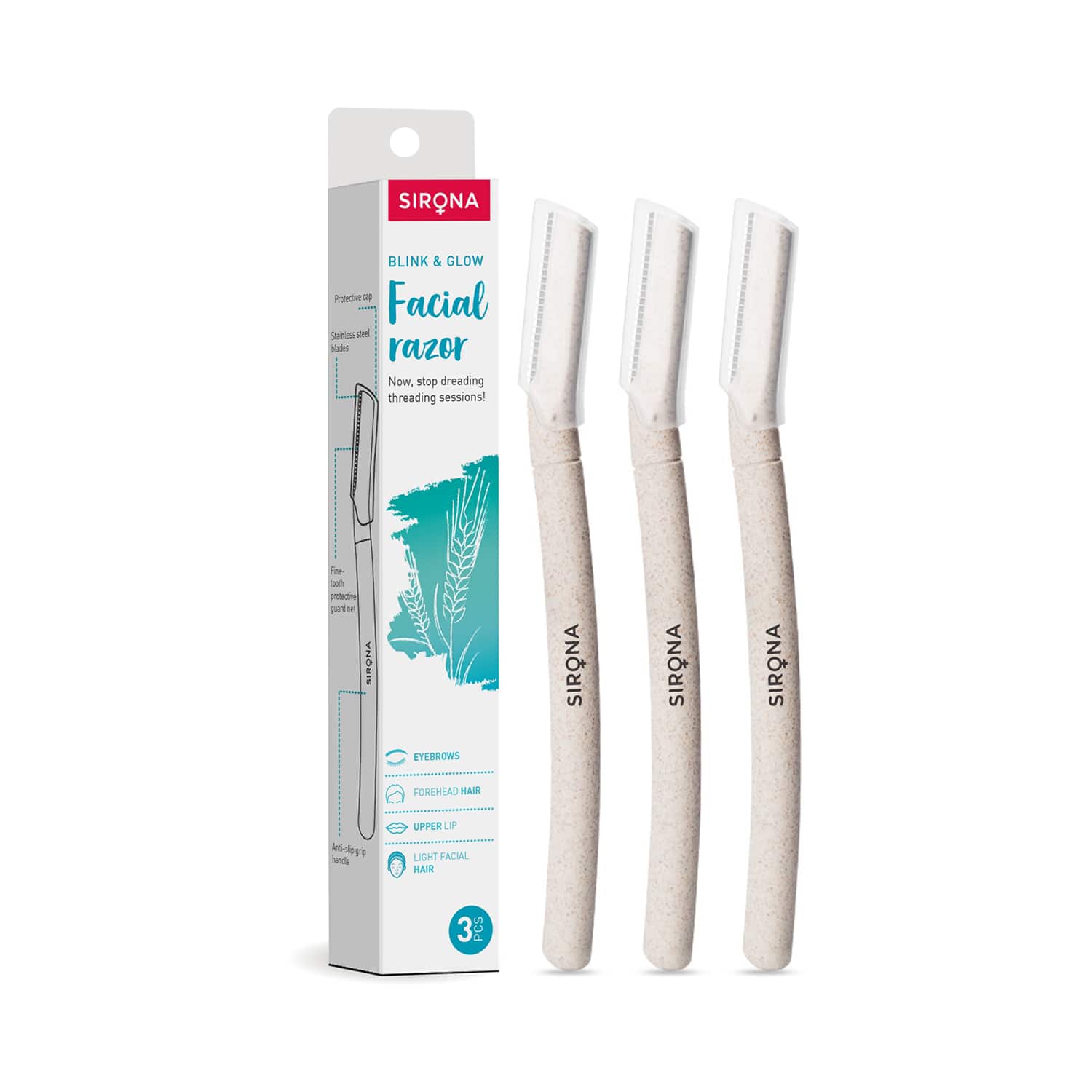 Put an end to painful waxing with the Sirona Blink And Glow Face Razor For Women - (3 Pcs). This modern face razor gently removes the tiniest and most stubborn hair easily. It's made of a stainless steel blade that resists bacterial growth, has an ergonomic design, and its fine-tooth protection guard avoids cuts and hassles to reveal glowing, hair-free skin in a blink.Key Features & Benefits:Fine tooth-protective guard net ensures zero cuts while shavingVersatile razor to remove extra hair on your eyebrows, upper lip, forehead and chinHandle is made of ABS plastic and is curved for a better gripExfoliating razor to remove dead skinProtective cap keeps the edge sharp and clean when storedHow to Use:Hold the razor at an angle to your face, grip the hair at the root, and pull it out quickly in the direction of its growth. To open the pores and make hair removal easier, you can wipe your brow area with a warm, damp cloth before tweezing. You can also rub an ice cube over your brows to close and heal your pores after you're done plucking stray hairs.About the Brand:Founded by Deep Bajaj, Sirona is a leading personal care and hygiene brand that has brought a revolution into the market and women's lives. They have a wide range of innovative products for all the women out there. Their vision is to break the stigma around menstrual hygiene. They want to redefine feminism and impact the lives of women positively with their unique products. Hence, they have introduced products like menstrual cups, tampons, sanitary napkins, urination devices, and many more maternity products at cost-effective prices. Sirona also aims to bring an end to period poverty.