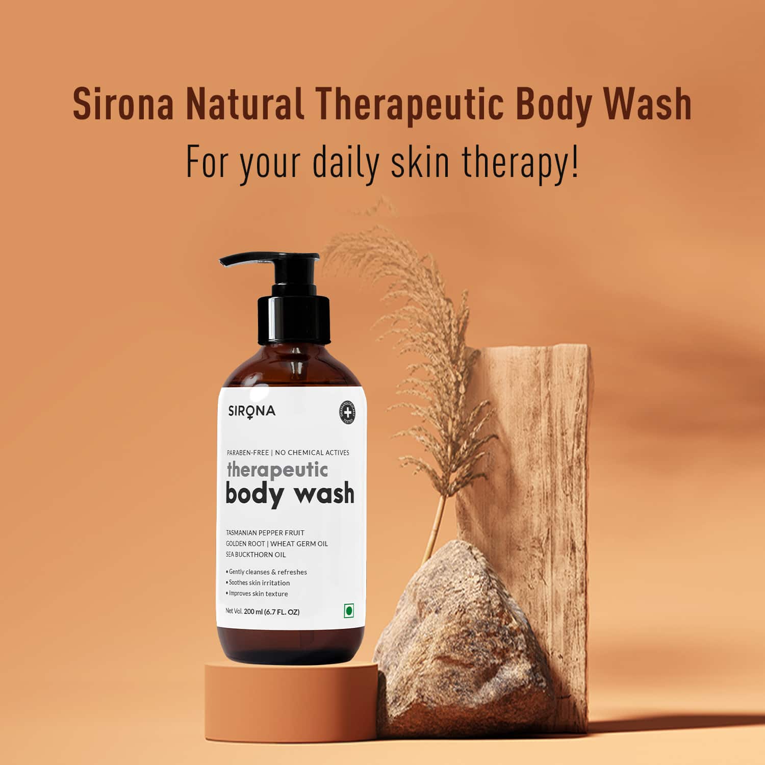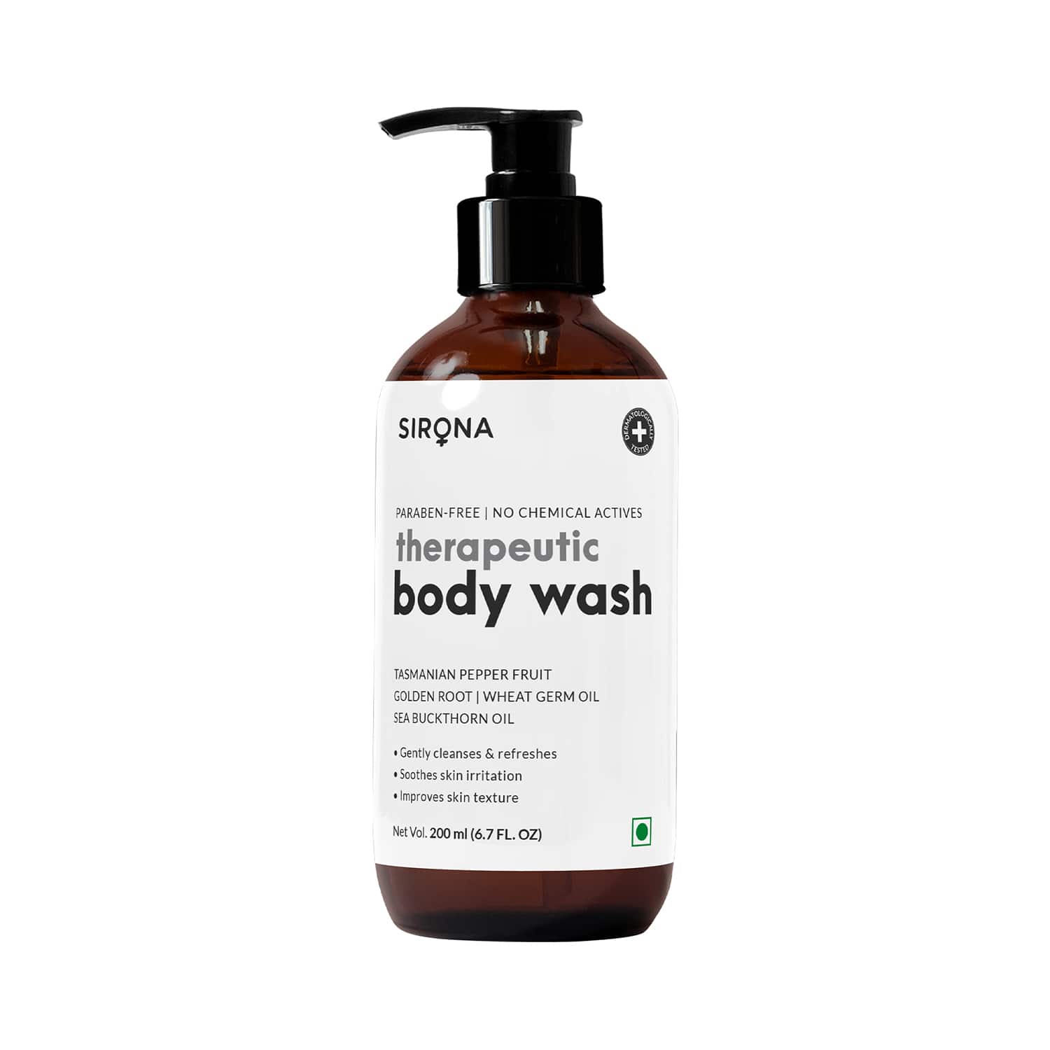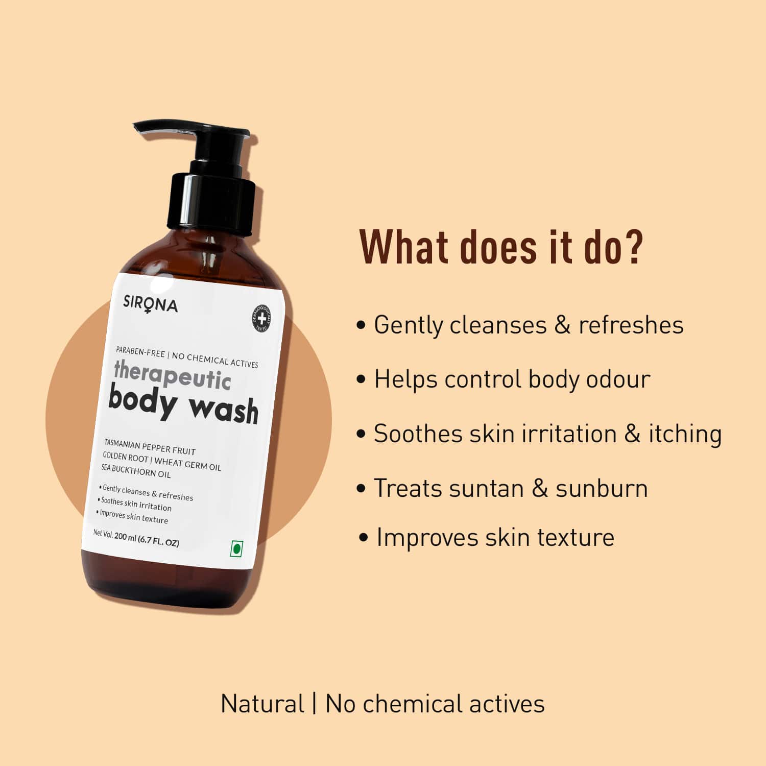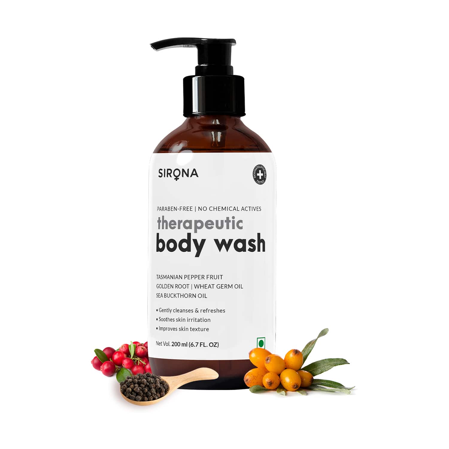 Treat your skin with natural therapy using the Sirona Natural Anti Fungal Therapeutic Body Wash - (200ml). This antifungal body wash is an ultra-gentle body cleanser that softens and conditions the skin with natural ingredients, soothes irritation and itching, helps control body odour, and maintains moisture levels. Rich in essential vitamins and minerals and exotic oils, it leaves your skin refreshed, hydrated and nourished.Key Features & Benefits:Enriched with Tasmanian pepper fruit, golden root, wheat germ oil, and sea buckthorn oil to promote your skin healthAntifungal wash kills the germ particles that produce bad body odourAnti-ageing body wash for a younger-looking skinTreats suntan and sunburn to improve your skin textureVegan, cruelty-free, allergy-free, and toxic-free body wash for safe useKey Ingredients:Jojoba oil: moisturizes skinWheat germ oil: Soothes skinCranberry oil: Fights skin irritationSea buckthorn oil: Helps your skin heal from wounds and burns more quicklyTasmanian pepper fruit: Reduces the appearance of skin rednessHow to Use:Wet your body with warm water. Take a loofah or a damp washcloth and drizzle some of the body wash. Rinse off with water and pat dry.All Ingredients:Aqua, Water (And) Sodium Lauroyl Methyl Isethionate (And) Sodium Lauroamphoacetate (And) Cocamide Mipa (And) Sodium Benzoate, Sodium Methyl Cocoyl Taurate, Coco-Betaine, Olea Europaea (Olive) Oil, Glycerin, Glycerin (And) Water (And) Alcohol Denature (And) Tasmannia Lanceolate Fruit Extract, Tea Tre Oil Compound Fragrance, Caprylyl Glycol, Aqua (And) Pentylene Glycol (And) Rhodiola Rosea Root Extract, Pink Salt, Undecylenoyl Glycine, Arginine, Cranberry Seed Oil, Guar Hydroxypropyltrimonium Chloride, Rosa Canina Fruit Oil, Simmondsia Chinensis (Jojoba) Seed Oil, Triticum Vulgare (Wheat) Germ Oil, Xanthan Gum, Coriandrum Sativum (Coriander) Seed Oil, Melia Azadirachta Seed Oil, Sodium Gluconate, Potassium Sorbate, Turmeric Oil, Hippophae Rhamnoides (Sea Buckthorn) Fruit Oil.About the Brand:Founded by Deep Bajaj, Sirona is a leading personal care and hygiene brand that has brought a revolution into the market and women's lives. They have a wide range of innovative products for all the women out there. Their vision is to break the stigma around menstrual hygiene. They want to redefine feminism and impact the lives of women positively with their unique products. Hence, they have introduced products like menstrual cups, tampons, sanitary napkins, urination devices, and many more maternity products at cost-effective prices. Sirona also aims to bring an end to period poverty.