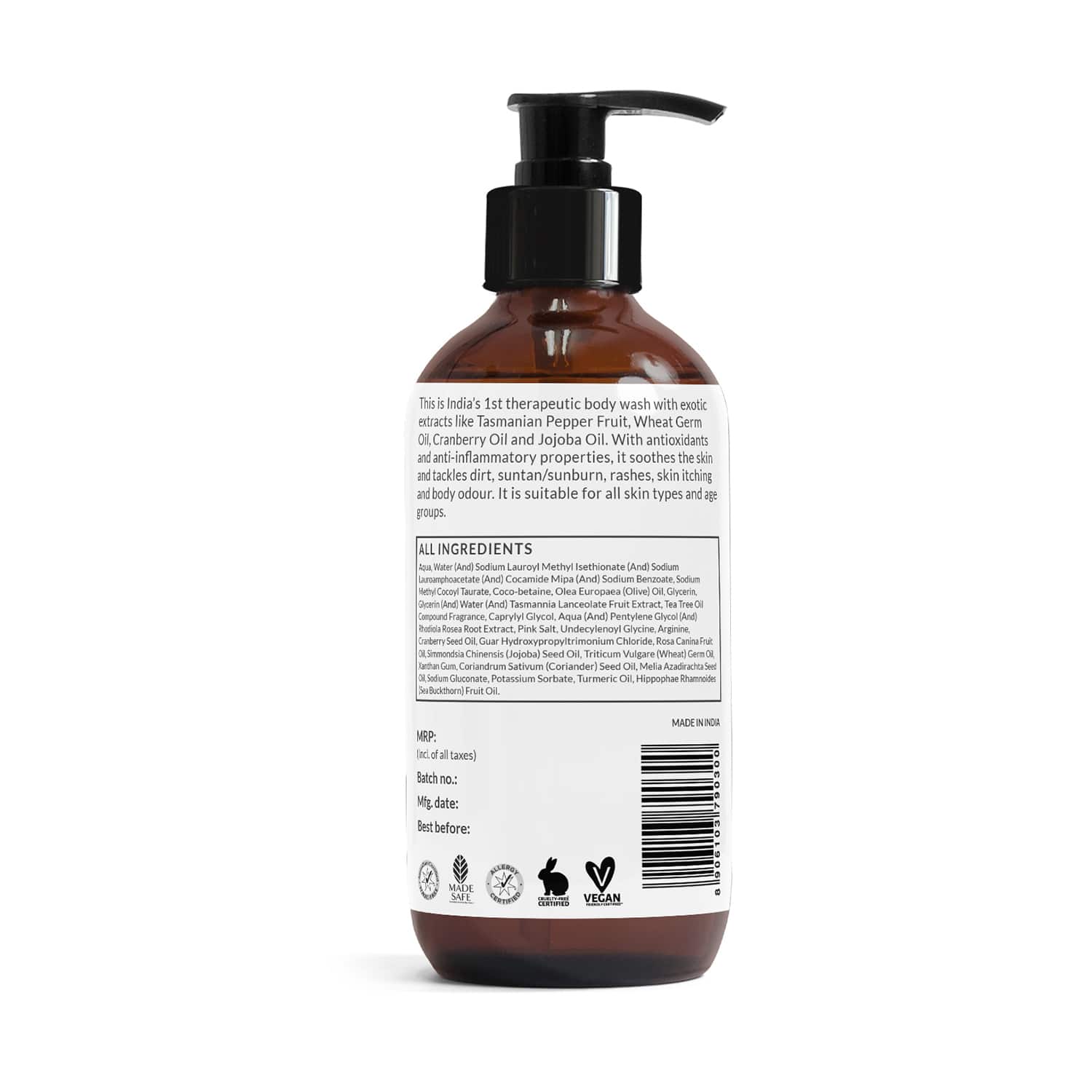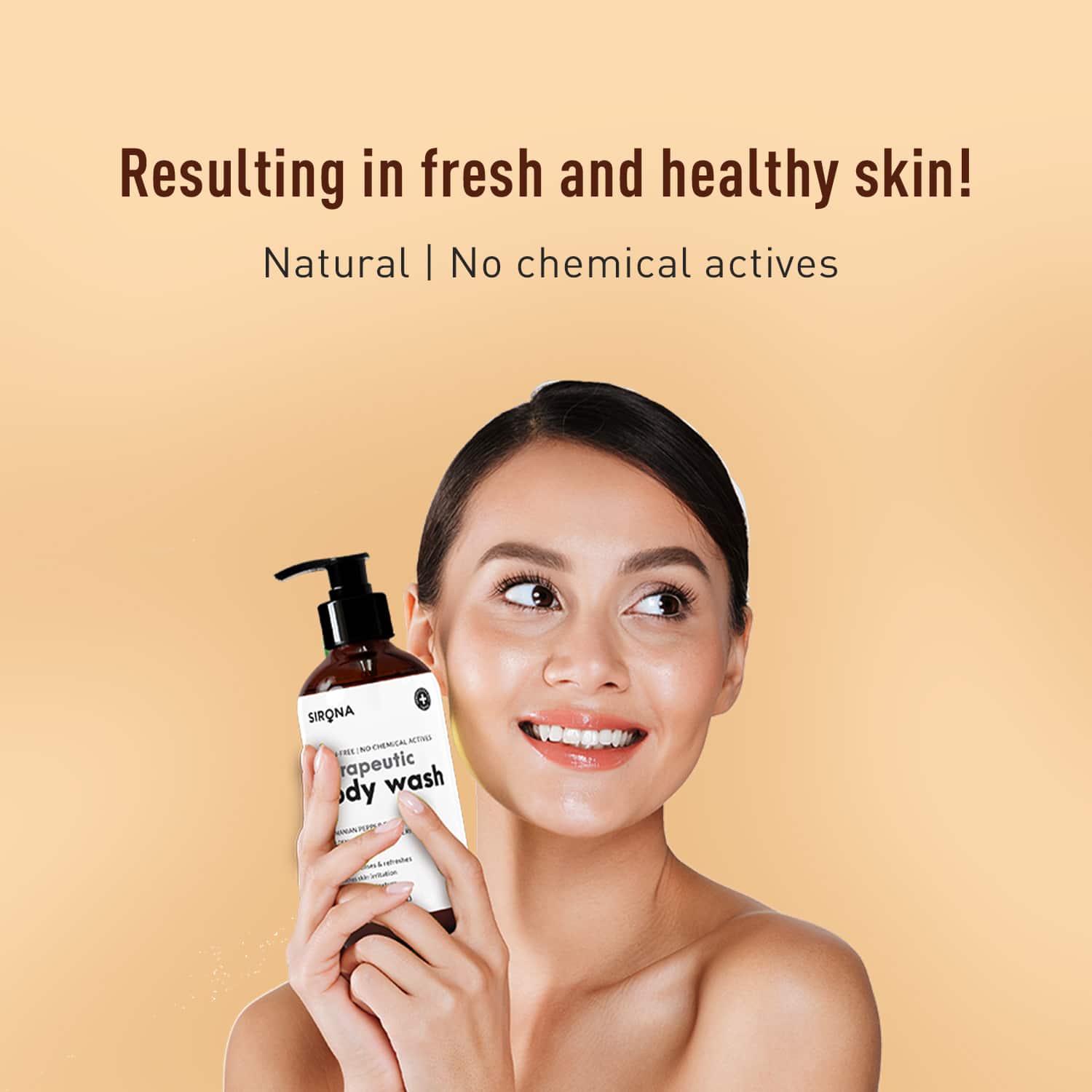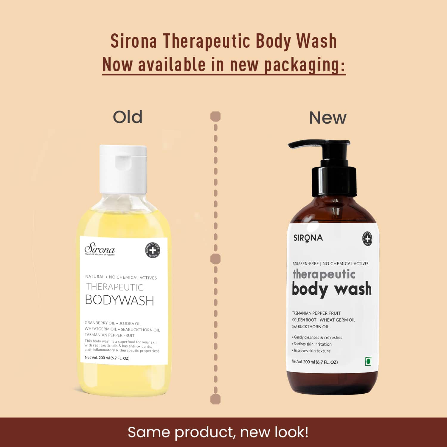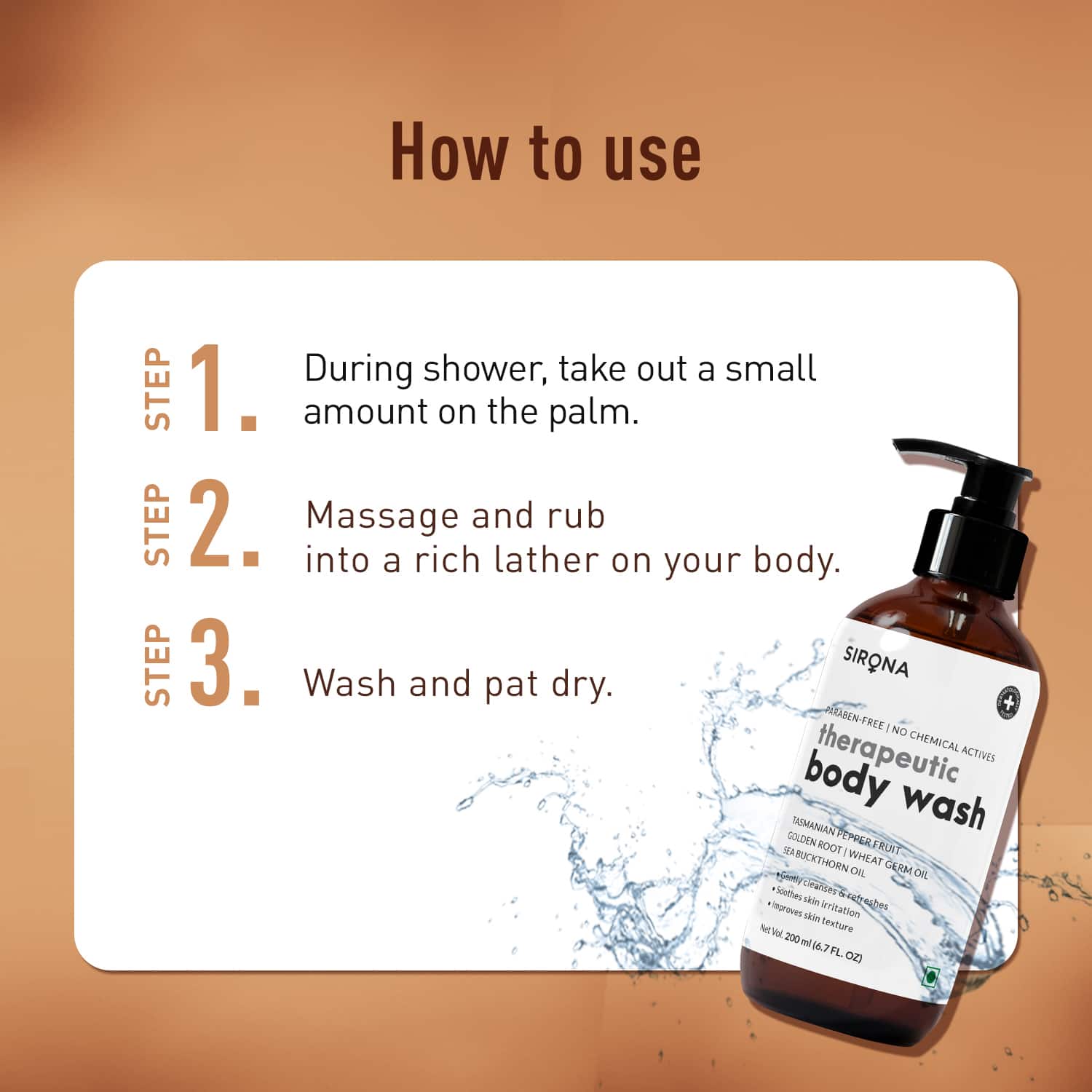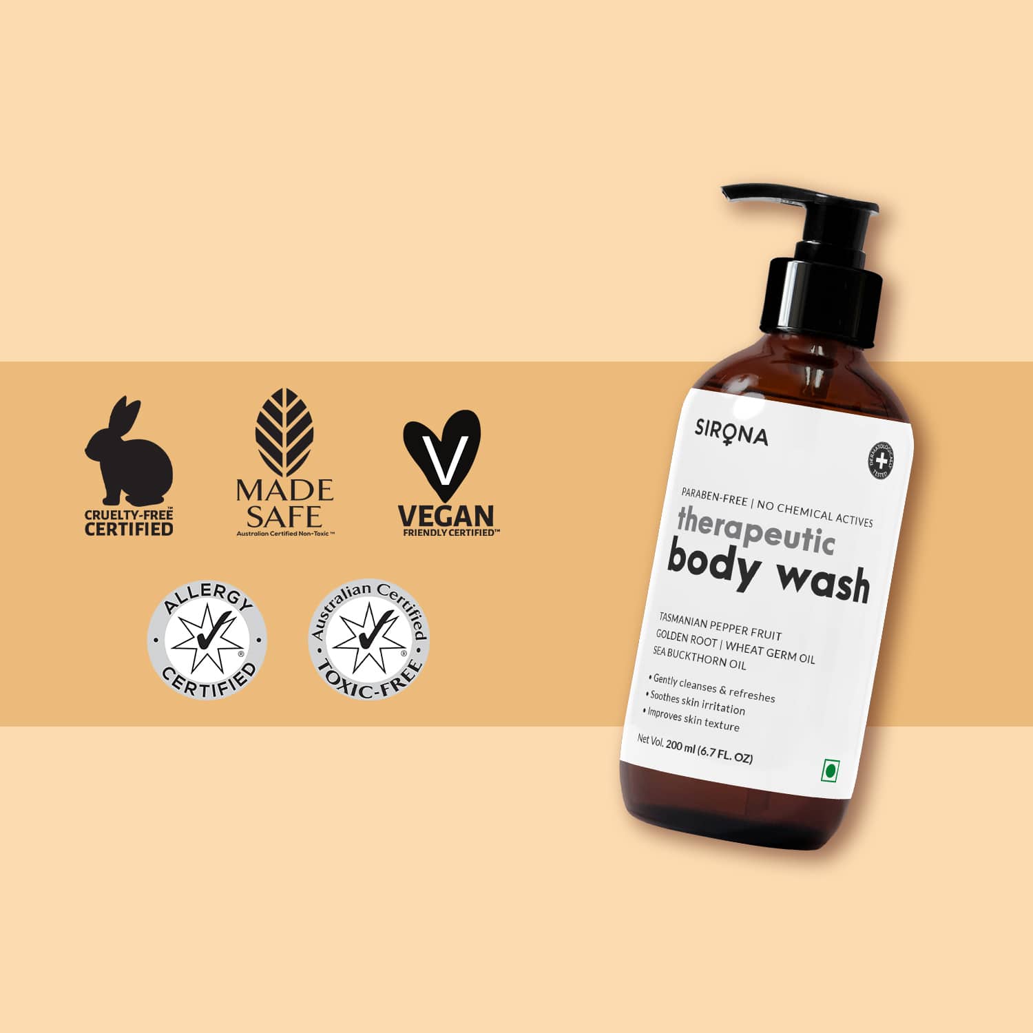 Treat your skin with natural therapy using the Sirona Natural Anti Fungal Therapeutic Body Wash - (200ml). This antifungal body wash is an ultra-gentle body cleanser that softens and conditions the skin with natural ingredients, soothes irritation and itching, helps control body odour, and maintains moisture levels. Rich in essential vitamins and minerals and exotic oils, it leaves your skin refreshed, hydrated and nourished.Key Features & Benefits:Enriched with Tasmanian pepper fruit, golden root, wheat germ oil, and sea buckthorn oil to promote your skin healthAntifungal wash kills the germ particles that produce bad body odourAnti-ageing body wash for a younger-looking skinTreats suntan and sunburn to improve your skin textureVegan, cruelty-free, allergy-free, and toxic-free body wash for safe useKey Ingredients:Jojoba oil: moisturizes skinWheat germ oil: Soothes skinCranberry oil: Fights skin irritationSea buckthorn oil: Helps your skin heal from wounds and burns more quicklyTasmanian pepper fruit: Reduces the appearance of skin rednessHow to Use:Wet your body with warm water. Take a loofah or a damp washcloth and drizzle some of the body wash. Rinse off with water and pat dry.All Ingredients:Aqua, Water (And) Sodium Lauroyl Methyl Isethionate (And) Sodium Lauroamphoacetate (And) Cocamide Mipa (And) Sodium Benzoate, Sodium Methyl Cocoyl Taurate, Coco-Betaine, Olea Europaea (Olive) Oil, Glycerin, Glycerin (And) Water (And) Alcohol Denature (And) Tasmannia Lanceolate Fruit Extract, Tea Tre Oil Compound Fragrance, Caprylyl Glycol, Aqua (And) Pentylene Glycol (And) Rhodiola Rosea Root Extract, Pink Salt, Undecylenoyl Glycine, Arginine, Cranberry Seed Oil, Guar Hydroxypropyltrimonium Chloride, Rosa Canina Fruit Oil, Simmondsia Chinensis (Jojoba) Seed Oil, Triticum Vulgare (Wheat) Germ Oil, Xanthan Gum, Coriandrum Sativum (Coriander) Seed Oil, Melia Azadirachta Seed Oil, Sodium Gluconate, Potassium Sorbate, Turmeric Oil, Hippophae Rhamnoides (Sea Buckthorn) Fruit Oil.About the Brand:Founded by Deep Bajaj, Sirona is a leading personal care and hygiene brand that has brought a revolution into the market and women's lives. They have a wide range of innovative products for all the women out there. Their vision is to break the stigma around menstrual hygiene. They want to redefine feminism and impact the lives of women positively with their unique products. Hence, they have introduced products like menstrual cups, tampons, sanitary napkins, urination devices, and many more maternity products at cost-effective prices. Sirona also aims to bring an end to period poverty.