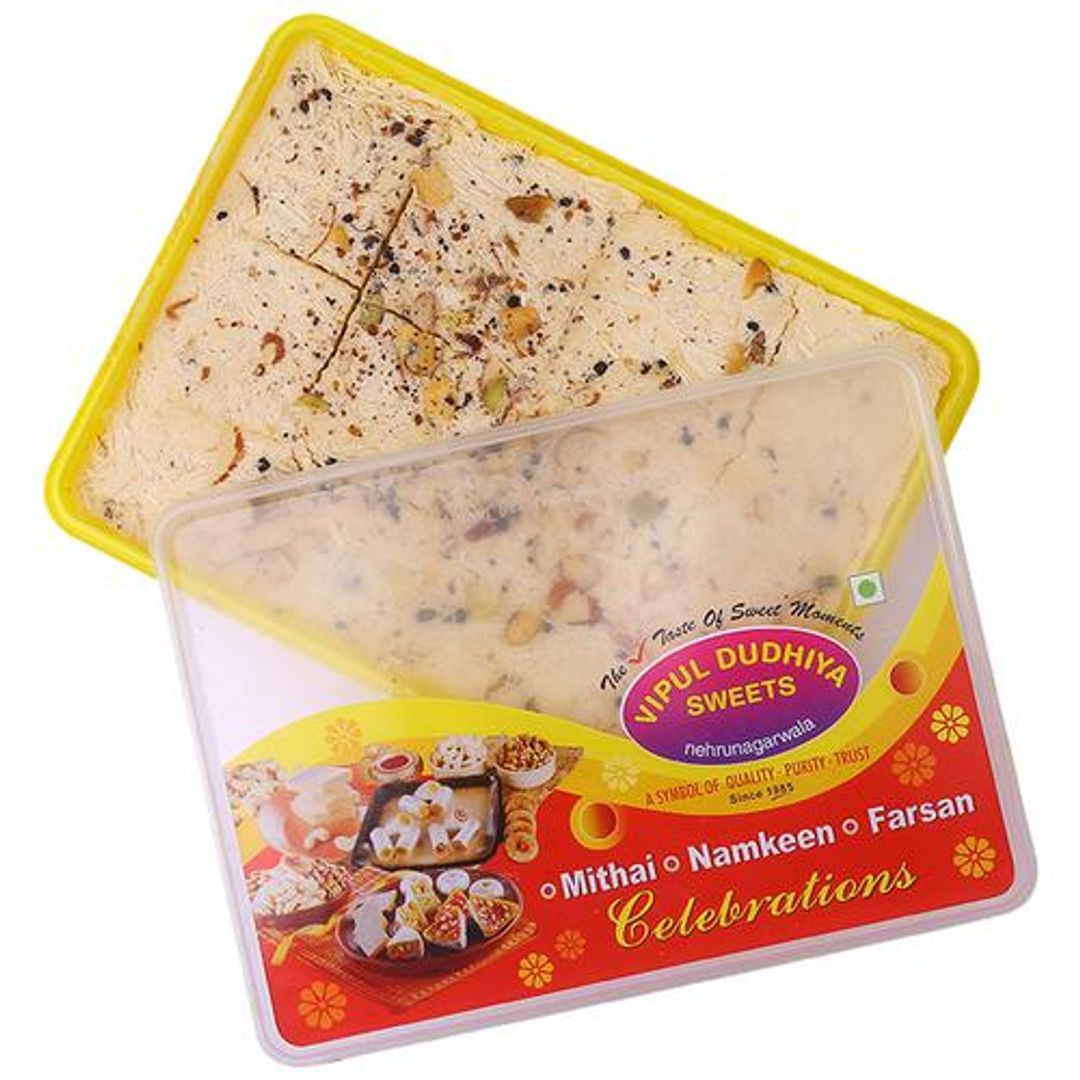Vipul Dudhiya Sweets brings tasty and premium Soan Papdi which is a popular Indian dessert. It is usually cube-shaped or served as flakes, and has a crisp and flaky texture. It was traditionally sold loose in a rolled paper cone, but modern industrial production has led it to be sold in tightly formed cubes. It is fresh and healthy.