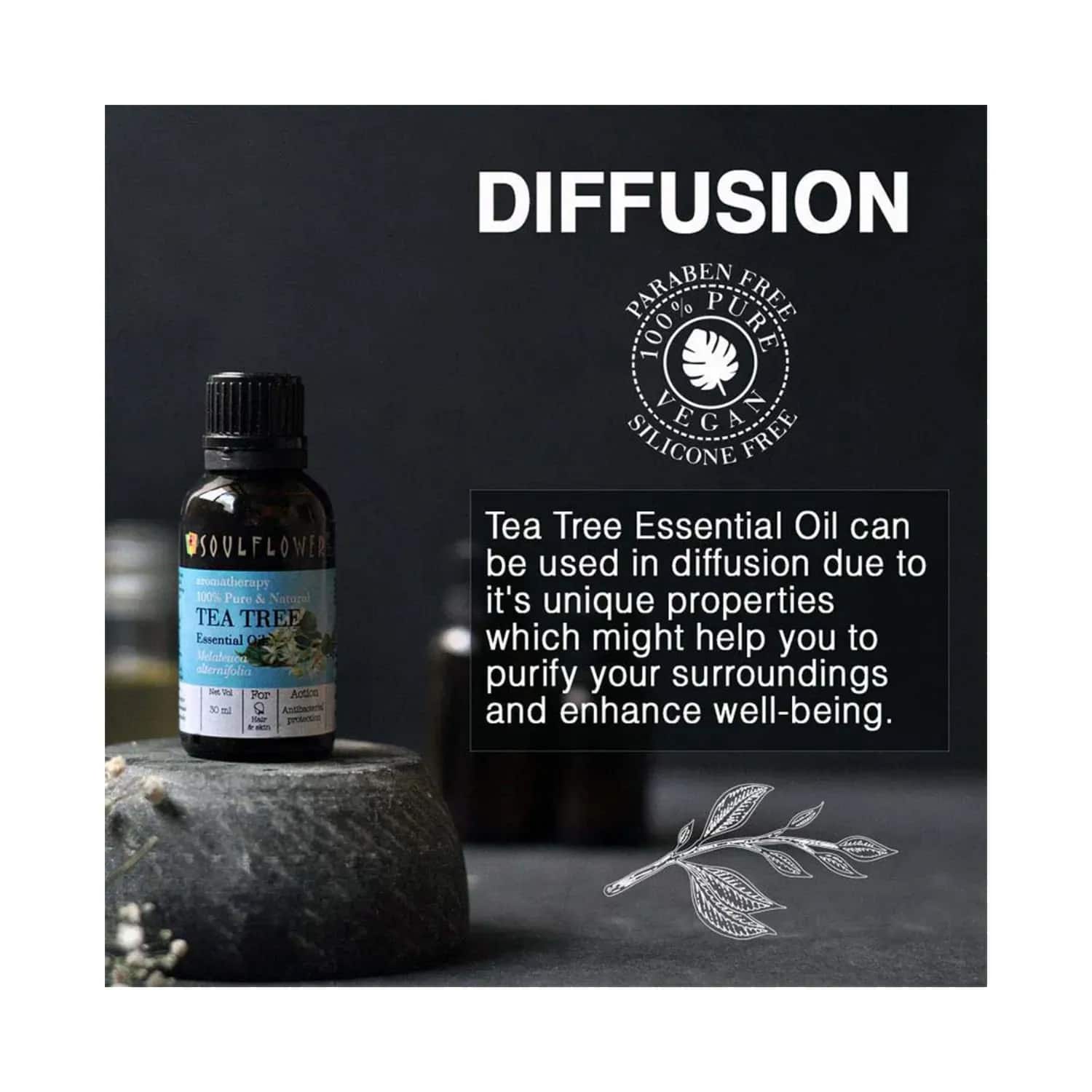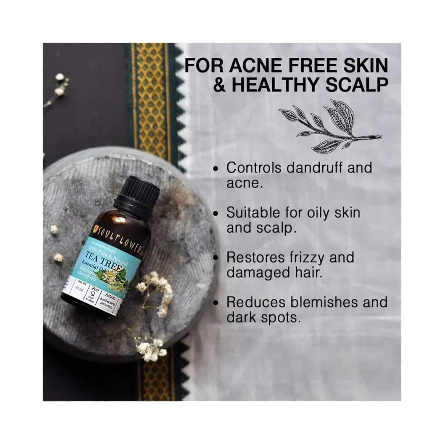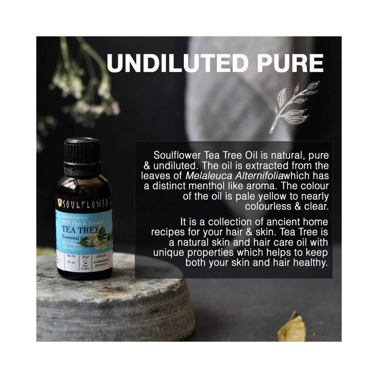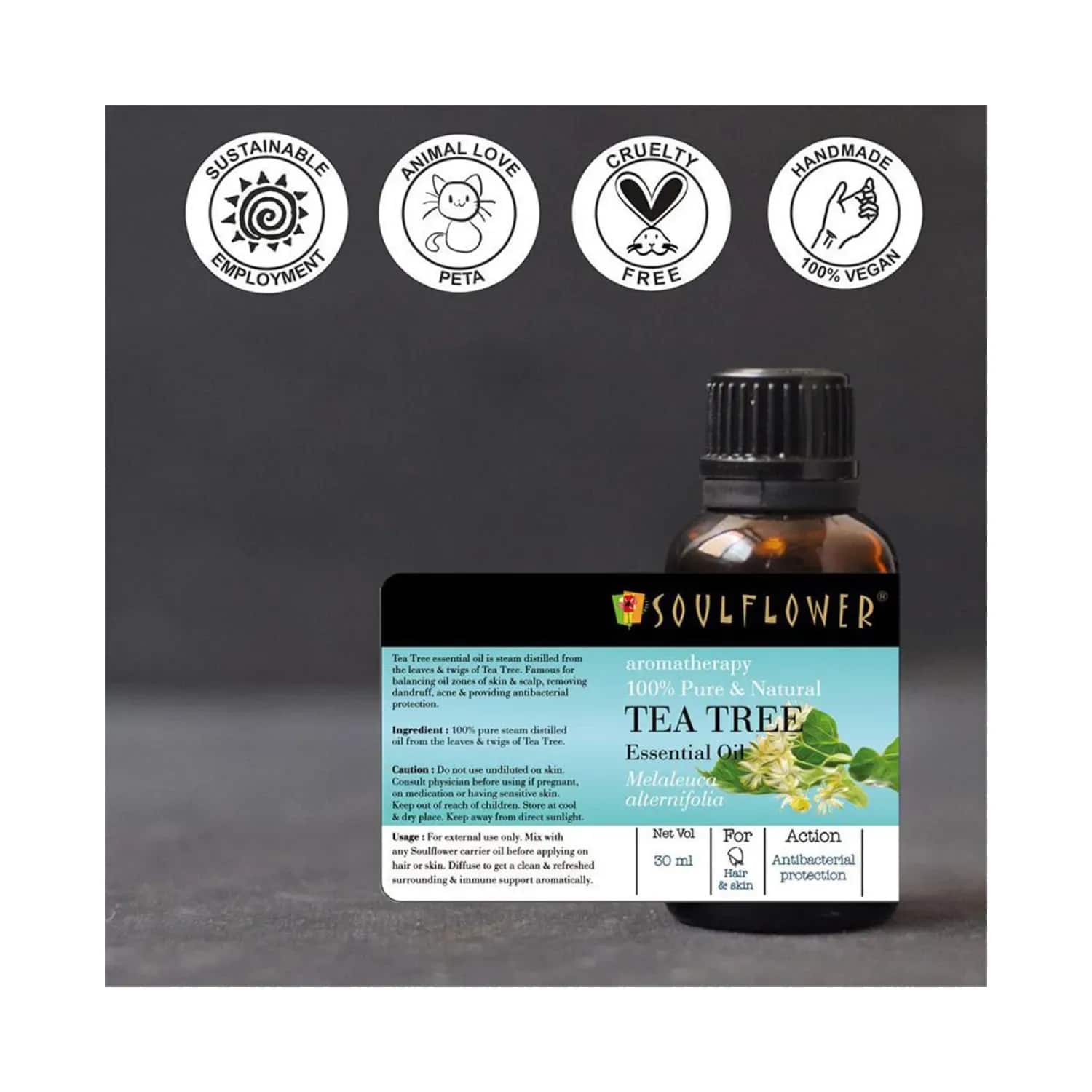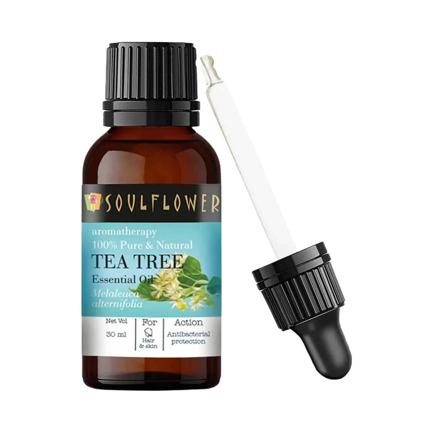 Say goodbye to all your skin and hair woes with the Soulflower Tea tree Essential Oil - (30ml). This 100% pure, all-in-one essential oil reduces inflammation, acne, itchiness, and dandruff to soothe the skin, hair and scalp. When used in a diffuser, this therapeutic grade essential oil spreads a relaxing aroma that rejuvenates the mind and uplifts the senses.Key Features & Benefits:Therapeutic grade essential oil that is 100% pure, undiluted, and naturalFresh, hand-picked ingredients offer superior quality and experienceProvides antibacterial protection for both hair and skin to relieve irritabilityCleansing and moisturising oil help to control acne, blemishes, pimples, dark spots, irritation, and body odourNaturally nourishing properties help prevent clogged hair follicles, hair fall, dandruff, tangles, damaged hair, and split endsCan be used to diffuse and it spreads a soothing aroma that energises the mind and uplifts the sensesDouble sealed bottle avoids spillage and is travel-safeDoes not contain added synthetic colour, fragrance, preservatives, or harmful chemicalsCruelty-free, vegan oil for reliable useKey Ingredients:Tea tree essential oil: Reduces inflammation, acne, itchiness, and dandruffHow to Use:For skin and Hair: Do not apply directly to hair or skin. Mix just 1-2 drops of the essential oil in 1 teaspoon of Soulflower olive carrier oil and apply the mixture on hair and skin while massaging gently.Nails: Dip a cotton ball in the essential oil and apply directly to fungus-affected nails. Do this daily for faster results.Diffuser: Let the essential oil diffuse and use it to aromatise your surroundings.All Ingredients:Tea Tree Essential OilAbout the Brand:Founded in 2001, Soulflower is India's first farm-to-face beauty brand that brings you cruelty-free, preservative-free, and high-efficacy skin and hair care products. This PETA-certified brand is committed to discovering and delivering visible and proven beautiful results for everyone. Soulflower's every product formulation is inspired by the natural, ayurvedic rituals and includes the purest, most potent, hand-selected and natural ingredients. In addition, their packaging is environmentally friendly as they believe there is no responsible alternative to do business other than following the pursuit of environmental sustainability.Check out more Soulflower Hair Oil options here, or browse through tokocart's full range of Hair Oil from top global brands.You can also explore other products from the world of Soulflower here on tokocart.