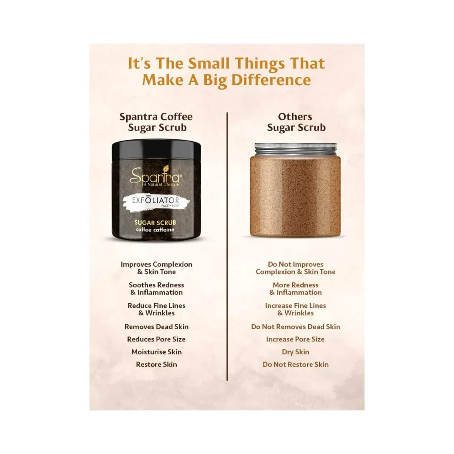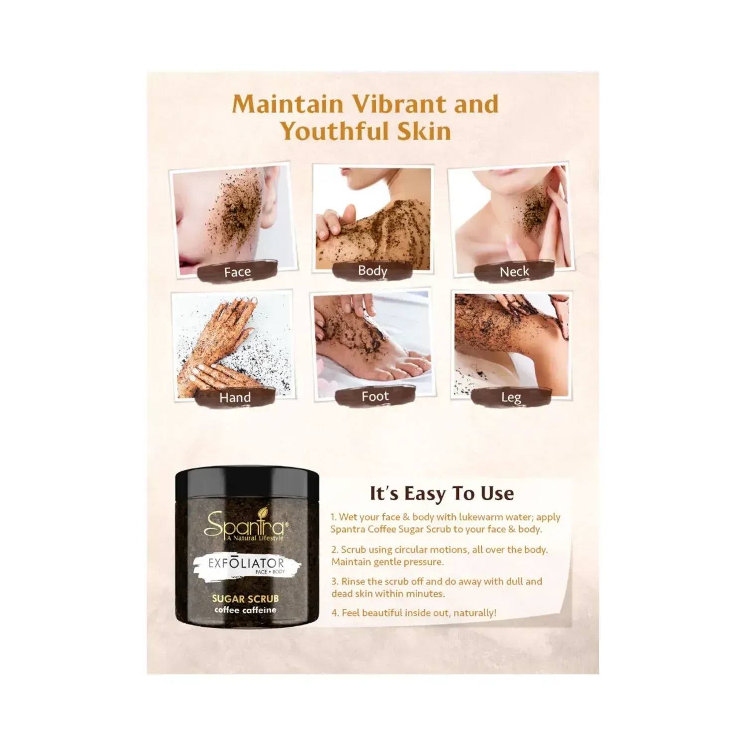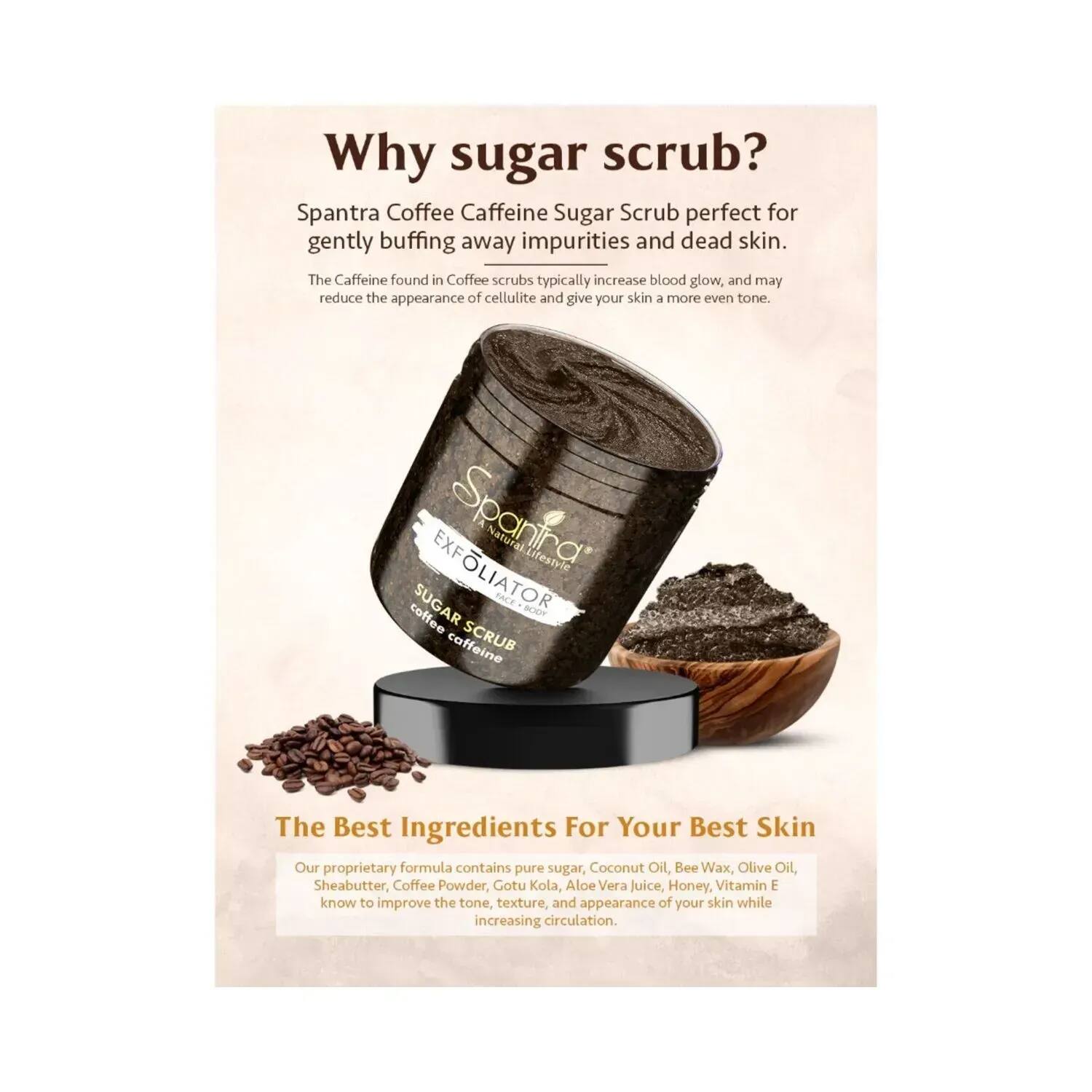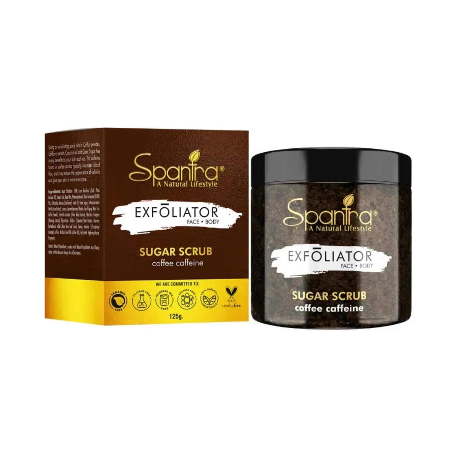 Get flawless and radiant skin with the Spantra Exfoliator Coffee Caffeine Sugar Scrub - (125g). This exfoliating body scrub is infused with coffee and vitamin E to remove dirt, grease, and dead skin cells for radiant and supple skin. The Spantra coffee scrub contains flavonoids to absorb UV light and offer glowing skin. In addition, its paraben- and silicone-free formula ensure safe use on the skin.Key Features & Benefits:Enriched with coffee and vitamin E to reduce fine lines and get healthy skinCleansing scrub removes dead skin cells for radiant skinSpecially formulated to offer nourishment to skinParaben- and silicone-free body scrub ensure safe useKey Ingredients:Coffee: Reduces fine lines and sun spotsVitamin E: Promotes skin healthShea butter: Smoothens dry skinCoconut: Moisturises dry skinHoney: Acts as an antiseptic for skinHow to Use:Take the required amount of Spantra face scrub and apply it over the face, neck, arms, and other body parts. You should massage gently with your fingertips for 2 to 3 minutes. Rinse thoroughly and pat dry to get cleansed and fresh skin.All Ingredients:Cane Sugar, Raw Coffee Powder, Shea Butter, Honey, Vitamin E, Olive Oil, Coconut Oil.About the Brand:Spantra is a beauty brand that incorporates natural ingredients and modern science to offer beauty products to its widespread customers. The brand excels in taking hair care or skincare products to the next level and strives to provide premium-quality products to its customers. Spantra presents a wide range of hair care products, such as shampoos, conditioners, and hair masks, created with care. The cruelty-free products of Spantra have made a mark in the beauty care industry. These products nurture and nourish the hair and body and are free of harmful chemicals to ensure safe use by all.