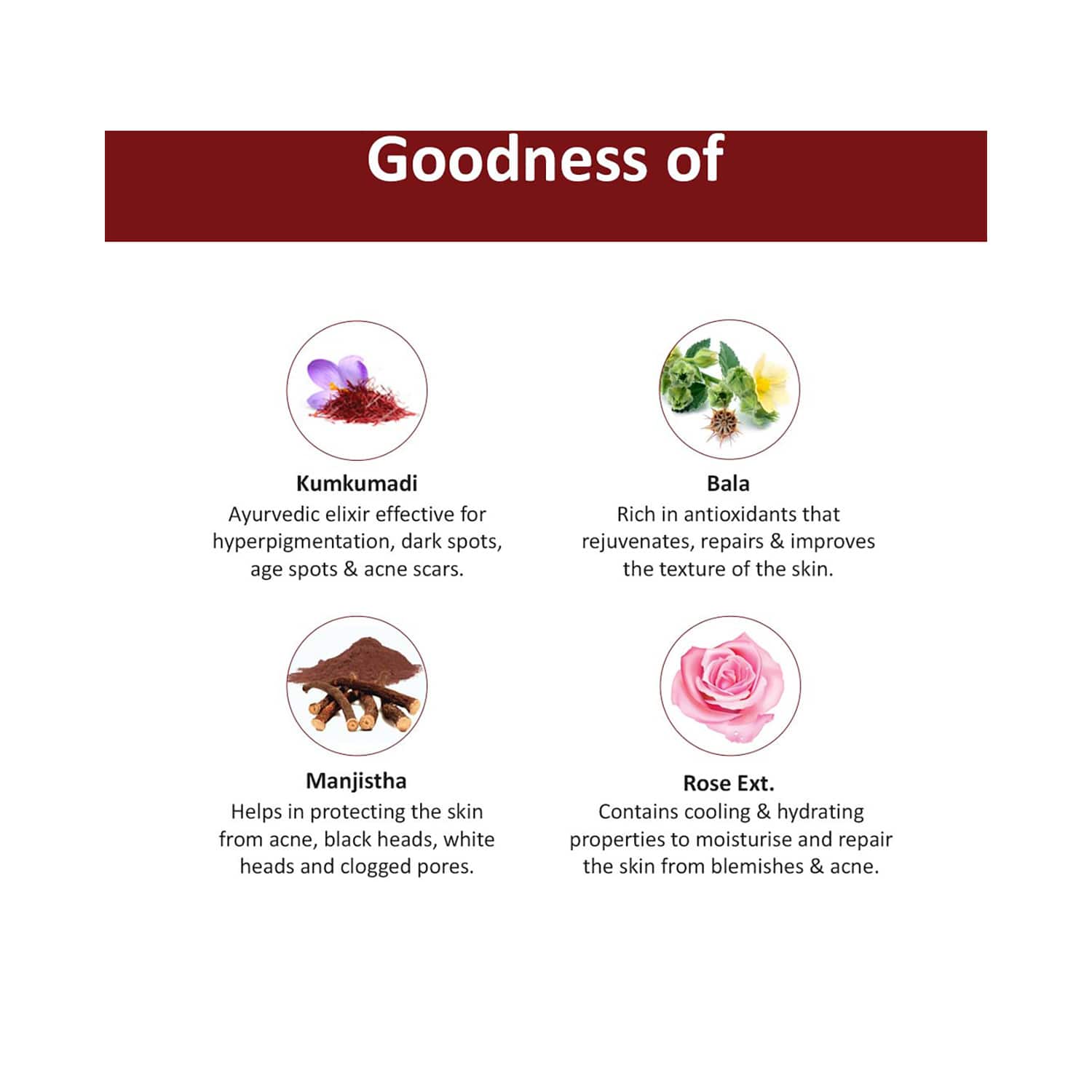 Key Ingredients:Kumkumadi: Brightens and lightens the skinRose extract: Moisturizes, hydrates and repairs skinBala: Helps to repair the skinManjistha: Reduces blackheads and acne