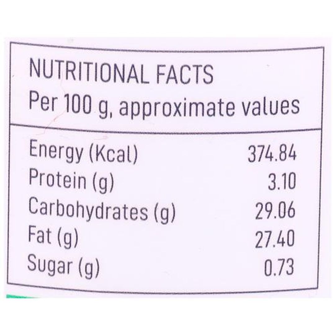 Energy 374.84 (kcal), Proteins(g) 3.10, Carbs (g) 29.06, fat (g) 27.40, Sugar(g) 0.73