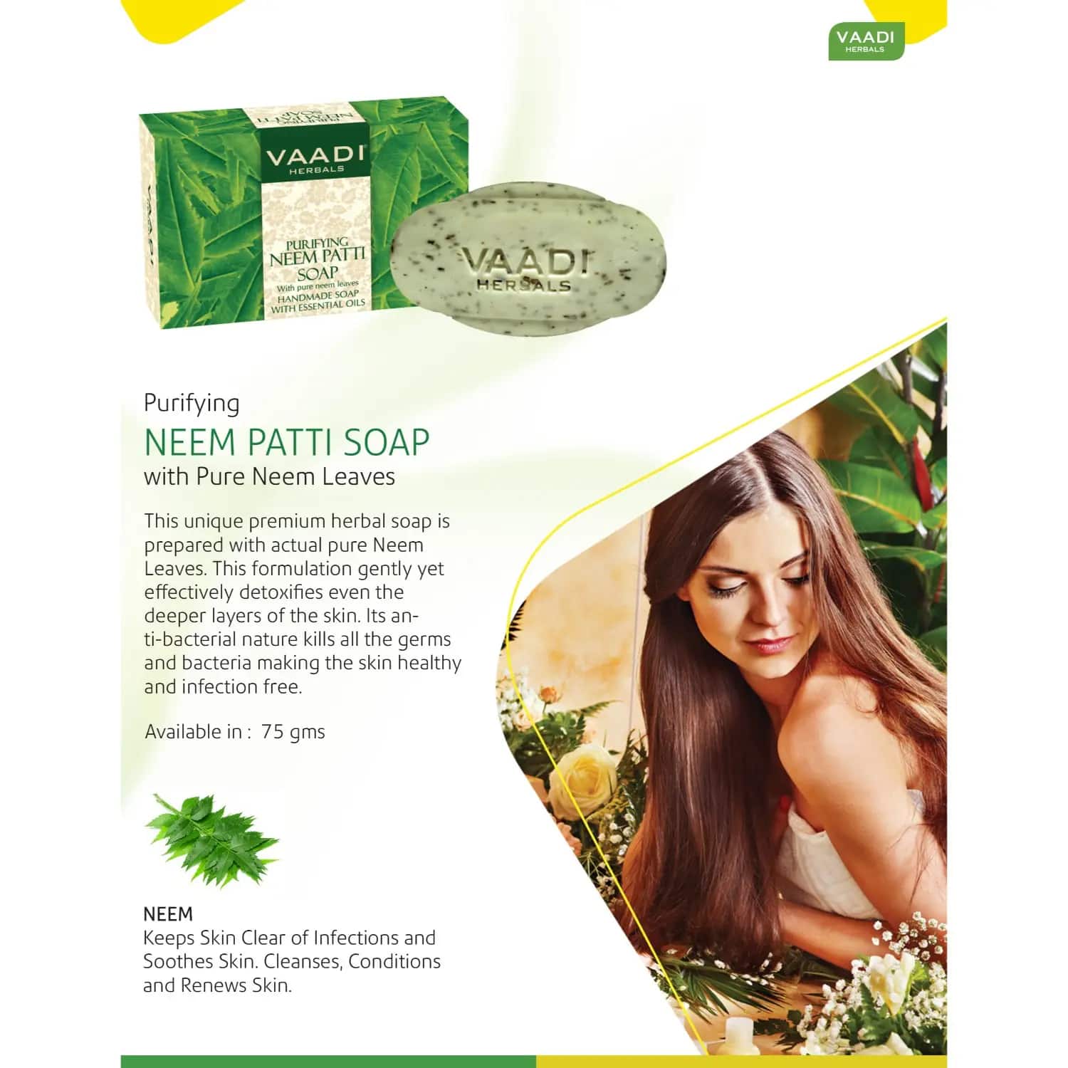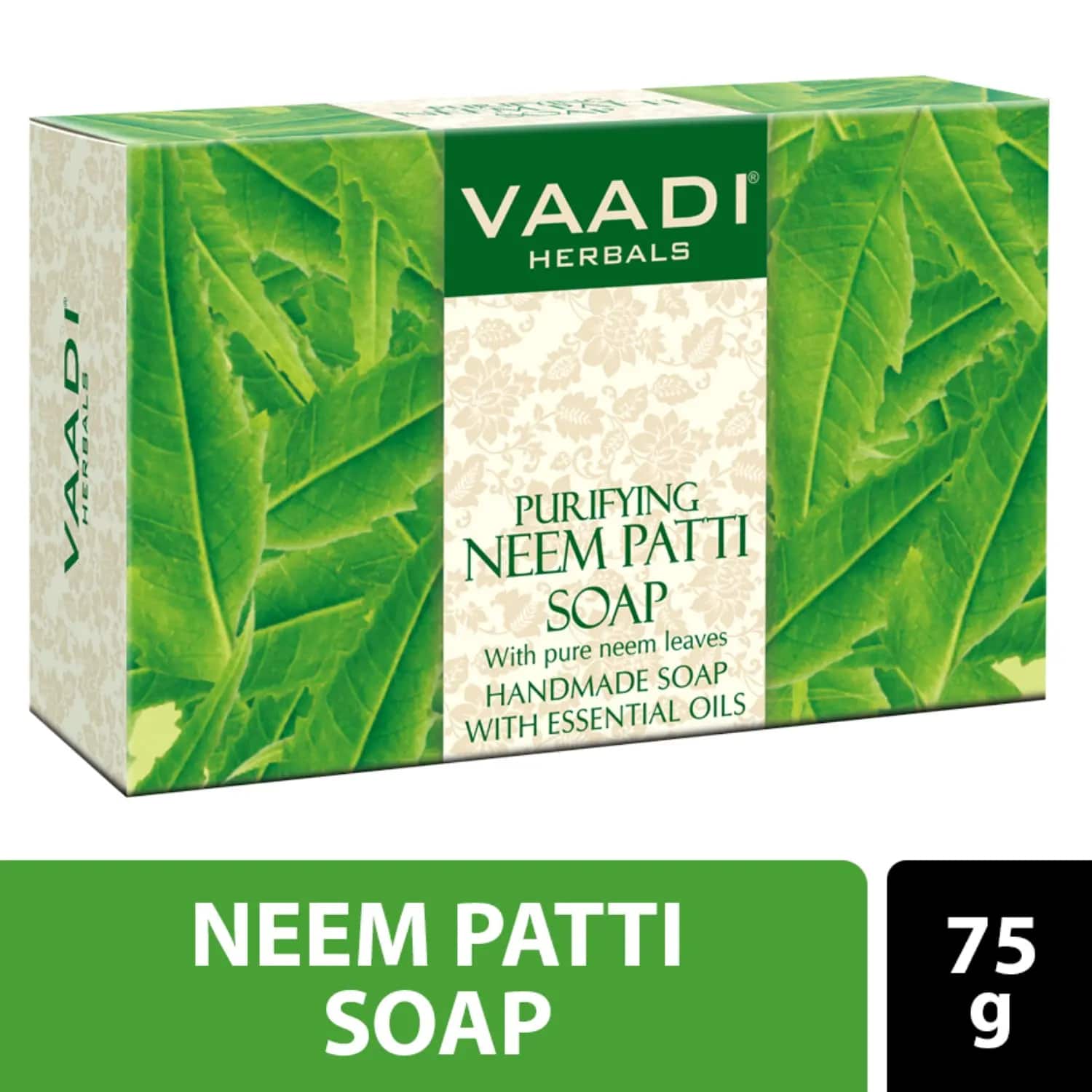 Provide your skin the best acne protection with the Vaadi Herbals Purifying Neem Patti Handmade Soap (75g). This detoxifying soap with neem and tulsi extracts has a powerful cleansing action against impurities and kills bacteria to prevent acne. Its vitamin-rich ingredients and hydrating properties slow down signs of aging, making this Vaadi Herbals soap a great addition to your routine.Key Features & Benefits:Infused with neem and tulsi extracts to prevent the development of bacteria and acneDamage protection soap that prevents environmental harm and reduces signs of premature agingRich in vitamins that preserve skin elasticity and maintain its hydrated, supple quality100% organic soap for all skin types to use safelyKey Ingredients:Honey: Clears the skin and retains moistureCoconut oil: Hydrates and protects skinAloe vera: Hydrates and nourishes the skinNeem: Detoxifies and protects the skin from damageTulsi: Kills bacteria and prevents acneHow to Use:Wet your body. Apply the soap gently to lather. Rinse off well after use.All Ingredients:Dry Neem Leaves (Azadirachta Indica), Neem Essential Oil ( Melia Azadirachta Leaf Extract), Tulsi Oil (Ocimum Tenuiflorum), Aloe Vera Extract (Aloe Barbadensis), Honey (Mel Extract), Rose Water (Rosa Centifolia), Coconut Oil Derivative (Cocos Nucifera), Vegetable Oils, Dm Water (Aqua)About the Brand:Vaadi Herbals is a brand based out of Delhi, India. Started in 2006, this brand combined ayurvedic science with modern-day technology to develop a range of personal care products. The brand's main aim is to offer premium quality products to consumers at a reasonable price. Also, this brand ensures that the products being sold serve the motive for which they have been made and give effective results. This brand offers a premium range of skincare, hair care, and body care products. All the products are made using extracts of the best quality natural herbs. The products at Vaadi Herbals are 100% cruelty-free, chemical-free, organic, and GMP-certified.Check out more Vaadi Herbals Soaps options here, or browse through tokocart's full range of Soaps from top global brands.You can also explore other products from the world of Vaadi Herbals here on tokocart.