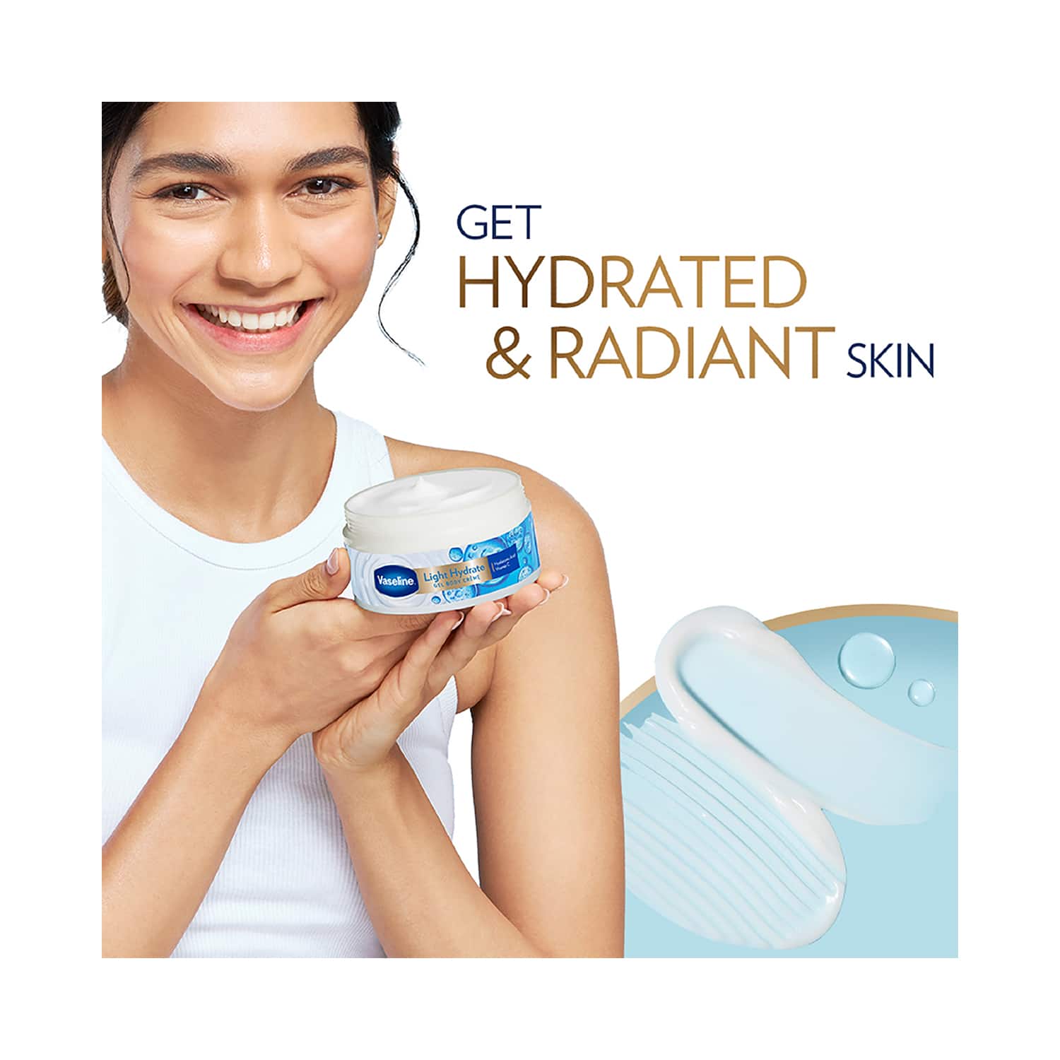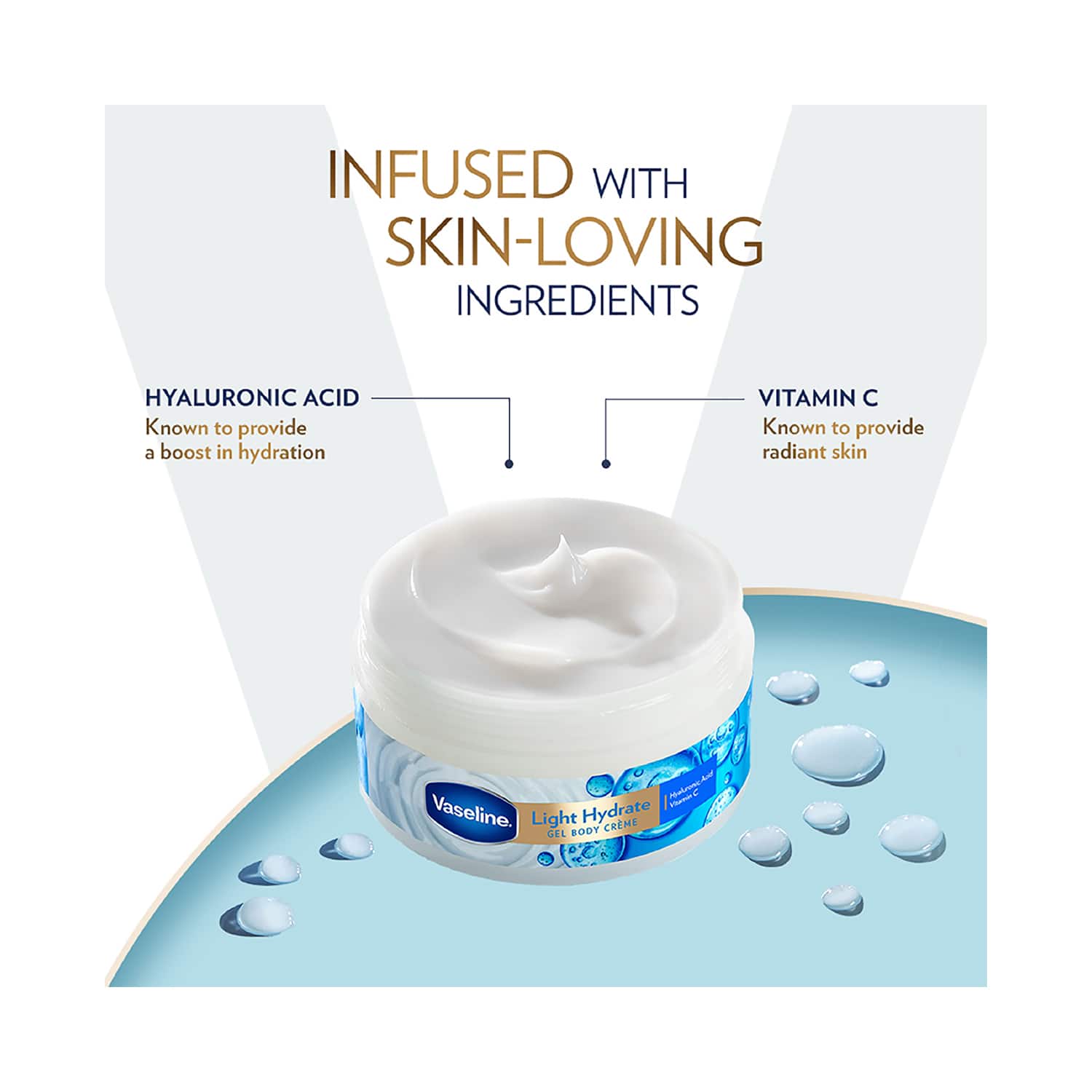 Say goodbye to dryness and dullness with the Vaseline Light Hydrate Gel Body Creme with Hyaluronic Acid & Vitamin C for Hydrated Skin (180g). This hydrating gel cream deeply moisturizes the skin and leaves it soft, hydrated, and radiant. Also, this Vaseline gel body cream is infused with hyaluronic acid and brightening vitamin C to provide intense moisturization and give a luminous glow. Moreover, this lightweight and non-sticky gel cream absorbs quickly without leaving any greasy residue.Key Features & Benefits:Prepared with hyaluronic acid to intensely hydrate the skinContains vitamin C to brighten the skin tone and give a luminous glowLightweight and non-sticky gel cream glides easily and leaves the skin soft and hydratedAbsorbs quickly and does not leave behind any greasy residueKey Ingredients:Hyaluronic acid: Hydrates the skinVitamin C: Brightens the skin toneAll Ingredients:Water, Glycerin, Niacinamide, Triethanolamine, Phenoxyethanol, Styrene/Acrylates Copolymer And Coco-Glucoside, Poloxamer 407, Acrylates/C10-30 Alkyl Acrylate Crosspolymer, Dimethicone, Cyclopentasiloxane, Methylparaben, Disodium Edta, Petrolatum, Allantoin, Sodium Ascorbyl Phosphate, Tocopheryl Acetate, Sodium Hyaluronate, Perfume, Benzyl Alcohol, Citronellol, Geraniol, Hexyl Cinnamal, Limonene, Linalool.How to Use:Wash your skin. Take a bit of the cream and put it on your skin. After that, massage well for increased hydration. Apply twice daily for the best results.About the Brand:Founded in 1870, Vaseline has been developing well-researched, clinically tested products that suit every skin type. Their range of products includes healing jelly, body lotions and moisturizers, lip care, hand care, gels, body butter, and many more. with its high-quality products, the brand aims to make healthy skin attainable to everyone. All Vaseline products are free from harmful chemicals, meaning they are gentle on the skin. Their ingredients are always tested before being put into production - ensuring that each product is perfect for your needs.Check out more Vaseline Body Lotions & Moisturisers options here, or browse through tokocart's full range of Body Lotions & Moisturisers from top global brands.You can also explore other products from the world of Vaseline here on tokocart.