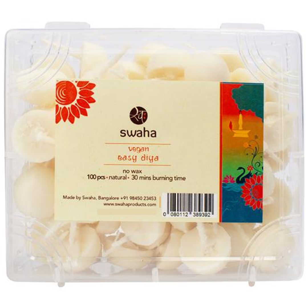 Easy Swaha Diya Vanaspati is made up of high-quality desi cow ghee or dalda. It is considered one of the purest forms of ghee. The wicks have a mild flavour which is a combination of camphor, sandalwood and jasmine. It is easy and safe to use. It has a higher heating temperature and is perfect for daily puja. The big size wicks burn for approximately 30mins. They are a convenient and apt replacements for traditional ghee lamps.