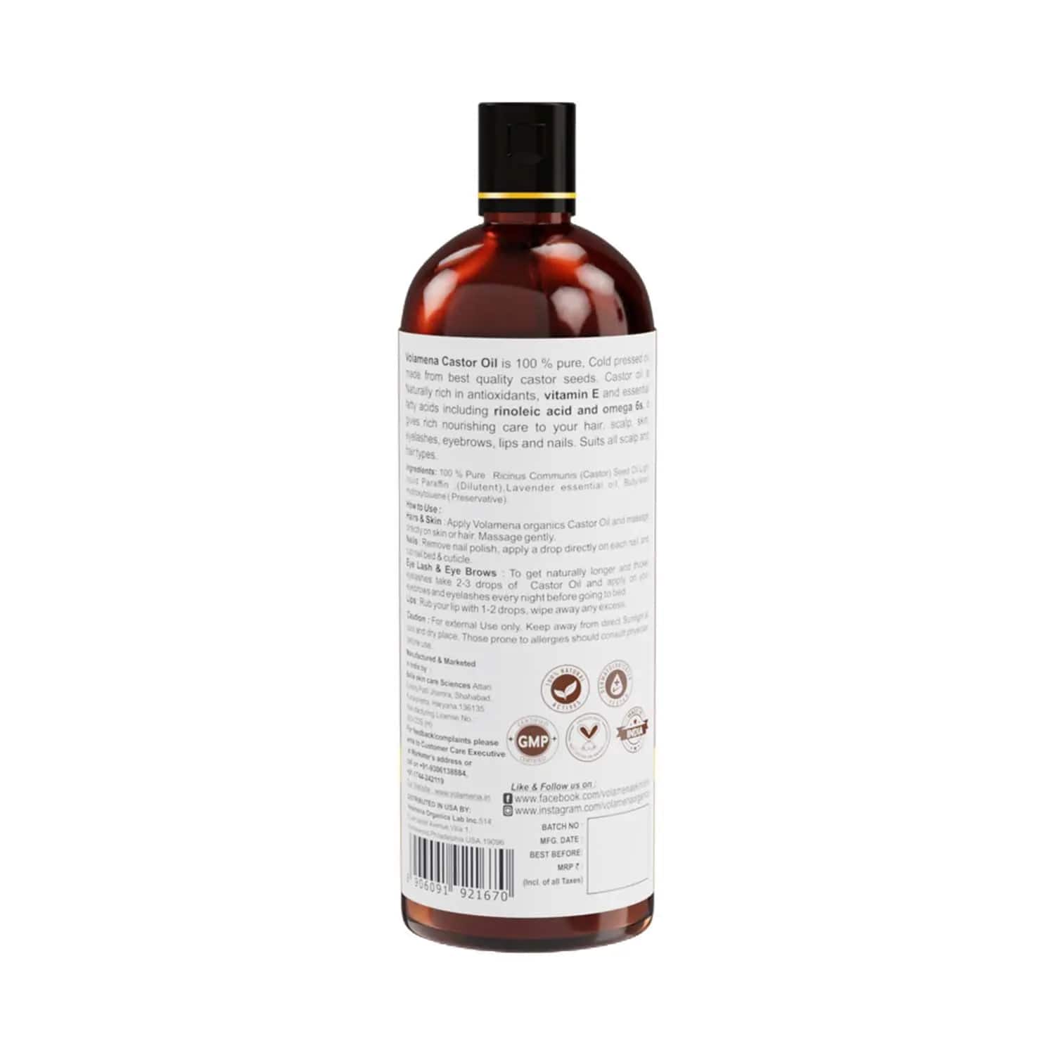 The search for a multipurpose oil ends with the Volamena Pure Cold Pressed Castor Oil - (200ml). It contains 100% pure cold pressed castor and lavender oils that can restore the health of your hair, nails, and lashes. This nourishing oil has high levels of antioxidant, vitamin E, and omega-3 fatty acids. This Volamena cold pressed oil is perfect for multifunctional use and suits all hair and scalp types.Key Features & Benefits:Nutritious oil contains pure cold pressed castor and lavender oilsImproves health of lashes, nails, lips, eyebrows, and skinMakes hair strong and shinySuitable for all hair and scalp typesKey Ingredients:Castor oil: Heals skin and scalpLavender oil: Promotes hair growth and prevents acneHow to Use:Vitamin E And Essential Fatty Acids & Omega 6S.About the Brand:Founded in Philadelphia, USA, Volamena is a skincare and haircare brand producing 100% natural, plant-based products catering to both men and women. The brand develops a range of premium products that are safe on the skin and environment and also address common skin concerns. Their products include face cream, serum, scrub, lotion, shower gel, shampoo, conditioner, hair oil, and much more. Moreover, their products are clinically and dermatologically tested for risk-free use on sensitive skin.Check out more Volamena Hair Oil options here, or browse through tokocart's full range of Hair Oil from top global brands.You can also explore other products from the world of Volamena here on tokocart.