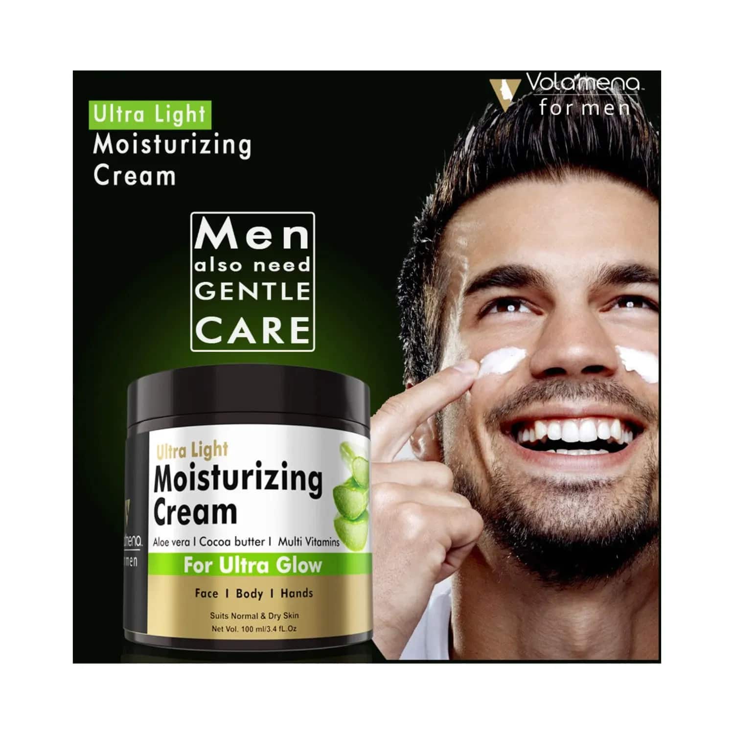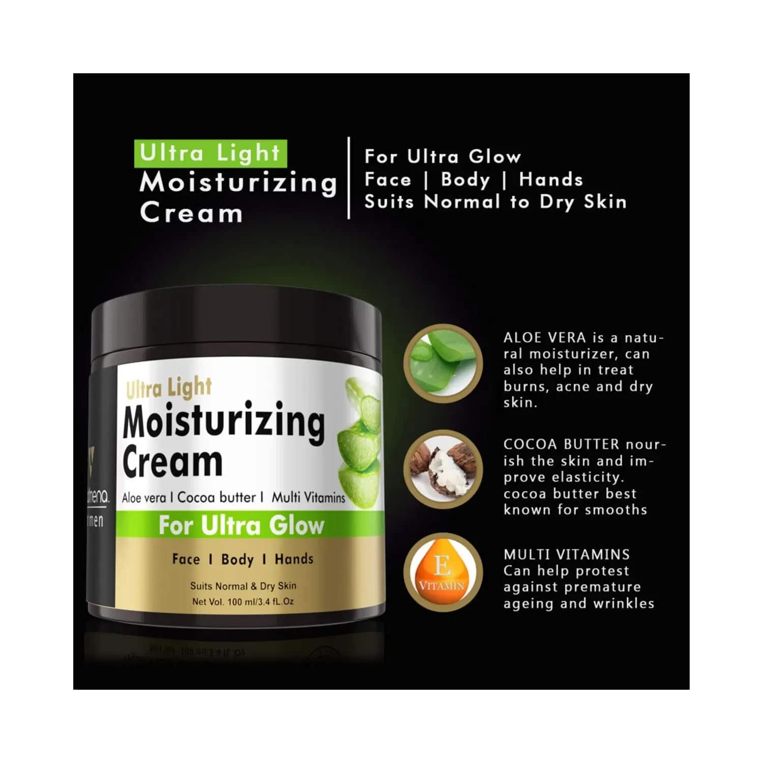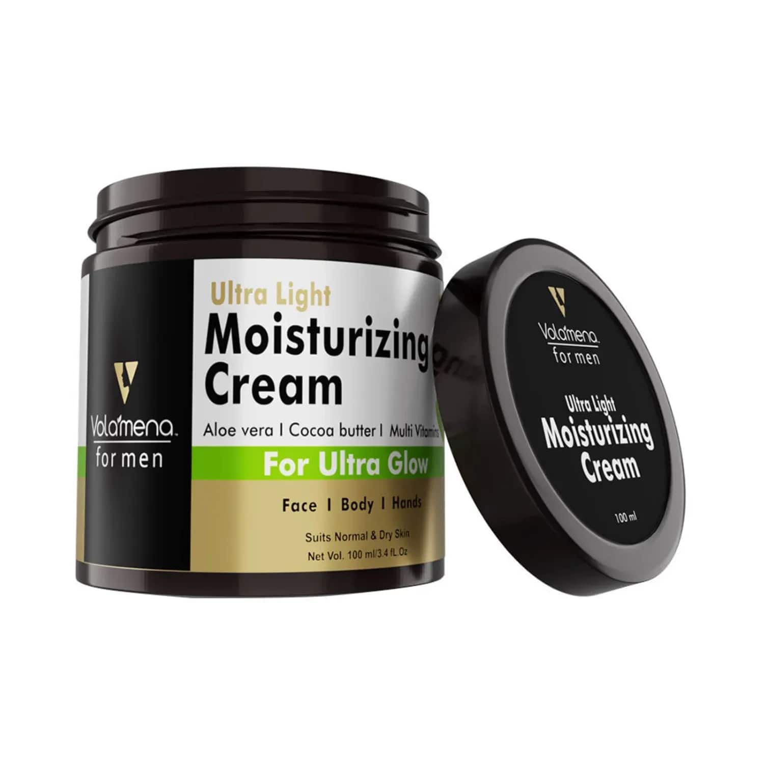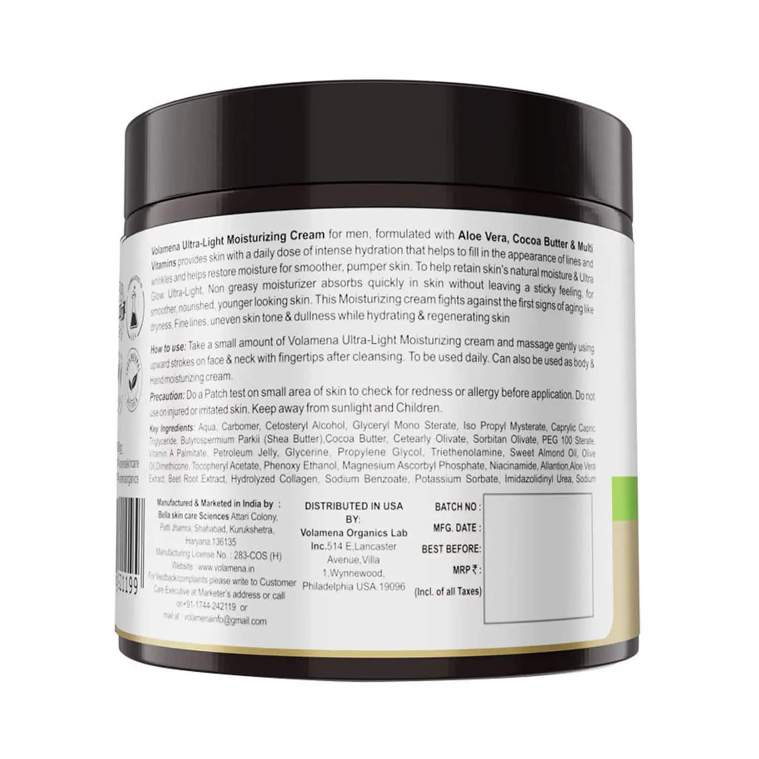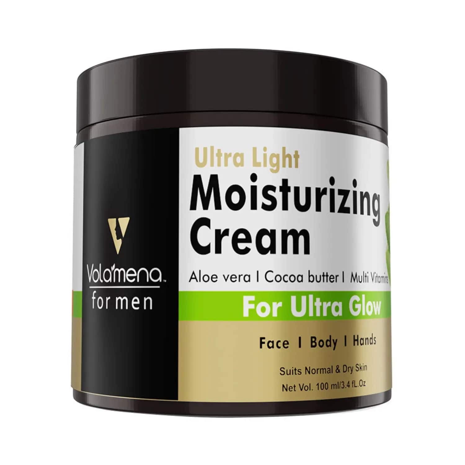 The Volamena Ultra-Light Moisturizing Cream - (100ml) is essential for your skincare routine. It is infused with aloe vera extract, cocoa butter, and multivitamins to nourish your skin. This Volamena moisturizing cream helps restore moisture in your skin, leaving it smooth, plump, and glowing. The anti-aging properties in this organic moisturizer combat the first signs of aging by reducing fine lines, wrinkles, dullness, and uneven skin tone. This ultra-light moisturizer has a non-greasy texture that gets absorbed quickly into the skin without any sticky residue.Key Features & Benefits:Infused with aloe vera extract, cocoa butter, and multivitamins to nourish your skinRestores moisture in your skin to make it smooth, hydrated, plump, and glowingProvides a younger-looking skin by reducing fine lines, wrinkles, uneven skin tone, and dullnessFormulated with lightweight, non-greasy texture to get absorbed easily into the skin without any sticky residueKey Ingredients:Aloe vera and cocoa butter: Moisturize the skinMultivitamins: Reduce signs of agingHow to Use:Take a small amount of the moisturizing cream. Then, use your fingertips to massage lightly in a circular motion so the cream absorbs quickly. Use 1-2 times a day for effective results.All Ingredients:Aqua, Carbomer, Cetostearyl Alcohol, Glyceryl Monostearate, Isopropyl Myristate, Caprylic Capric Triglyceride, Butyrospermum Parkii (Shea Butter), Cocoa Butter, Cetearyl Olivate, Sorbitan Olivate, Peg 100 Stearate, Vitamin A Palmitate, Petroleum Jelly, Glycerine, Propylene Glycol, Triethanolamine, Sweet Almond Oil, Olive Oil, Dimethicone, Tocopheryl Acetate, Phenoxyethanol, Magnesium Ascorbyl Phosphate, Niacinamide, Allenton Aloe Vera Extract, Beetroot Extract, Hydrolyzed Collagen, Sodium Benzoate, Potassium Sorbate, Imidazolidinyl Urea, SodiumAbout the Brand:Founded in Philadelphia, USA, Volamena is a skincare and haircare brand producing 100% natural, plant-based products catering to both men and women. The brand develops a range of premium products that are safe on the skin and environment and also address common skin concerns. Their products include face cream, serum, scrub, lotion, shower gel, shampoo, conditioner, hair oil, and much more. Moreover, their products are clinically and dermatologically tested for risk-free use on sensitive skin.Check out more Volamena Face Moisturiser options here, or browse through tokocart's full range of Face Moisturiser from top global brands.You can also explore other products from the world of Volamena here on tokocart.