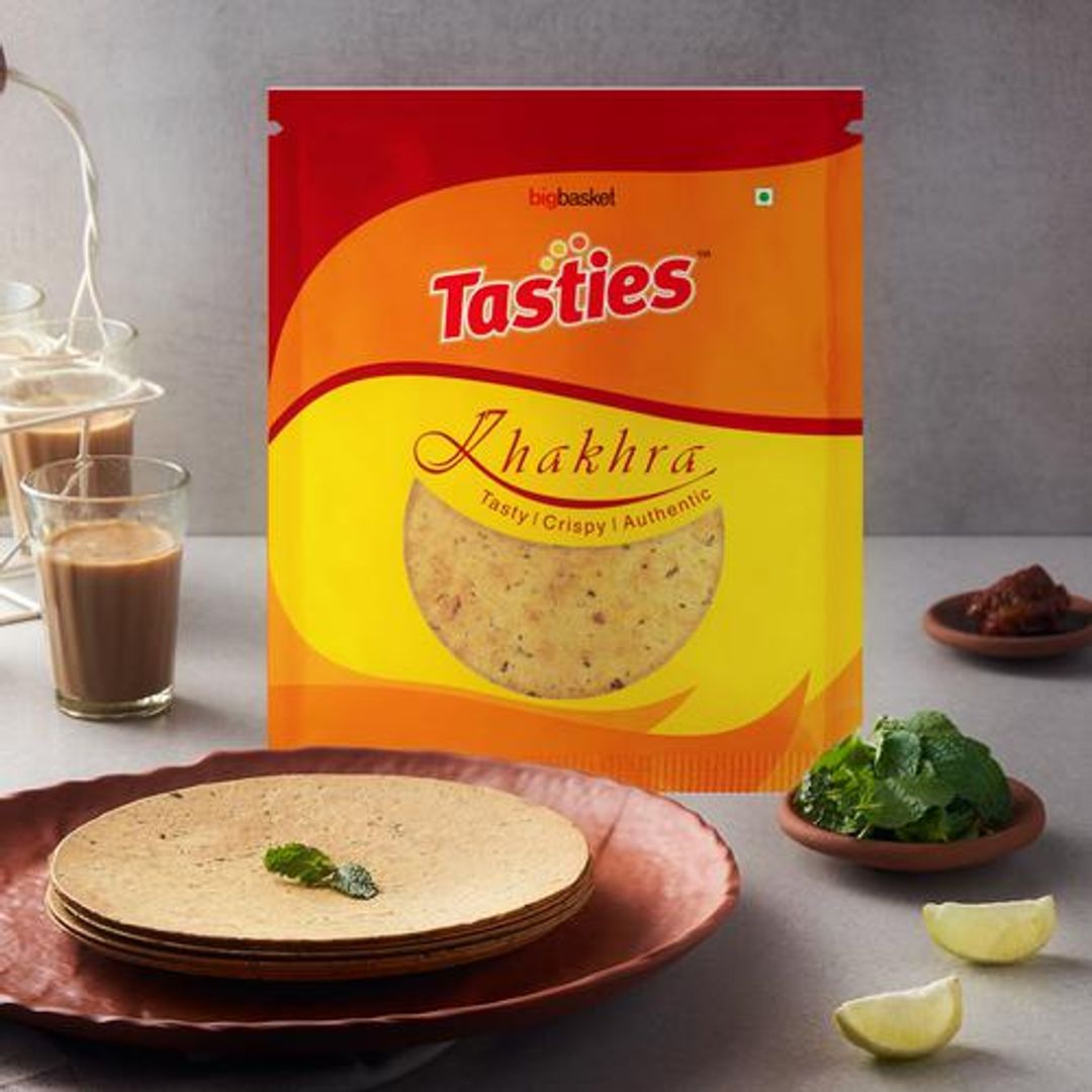 About the ProductMade from tangy pudina, Tasties Namkeen - Whole Wheat Khakhra is a savoury snack that is perfect for when you crave something spicy and lightweight. Thin and super crispy, these khakhras are perfect to snack on any time of the day. They can be had on their own or topped with hot ghee and some groundnut chutney for an authentic Gujarati culinary experience.Tasties Namkeen's range of khakhras is deliciously prepared from real ingredients and delivers smiles to those who like a bit of desi touch to their palette. Enjoy the range of pani puri, chilli kothmir and tangy pudina flavours to never miss out.